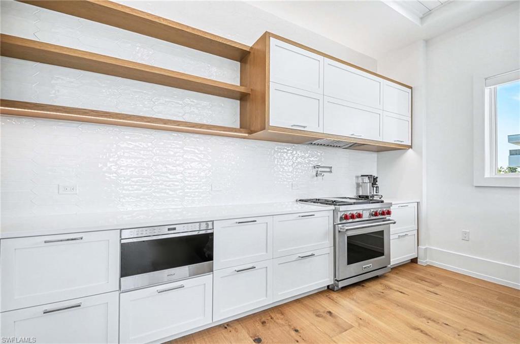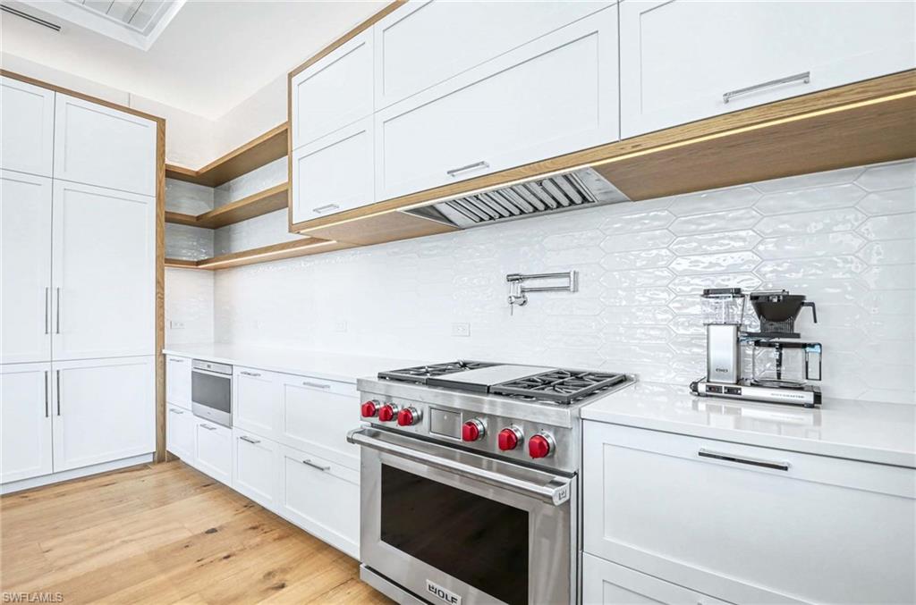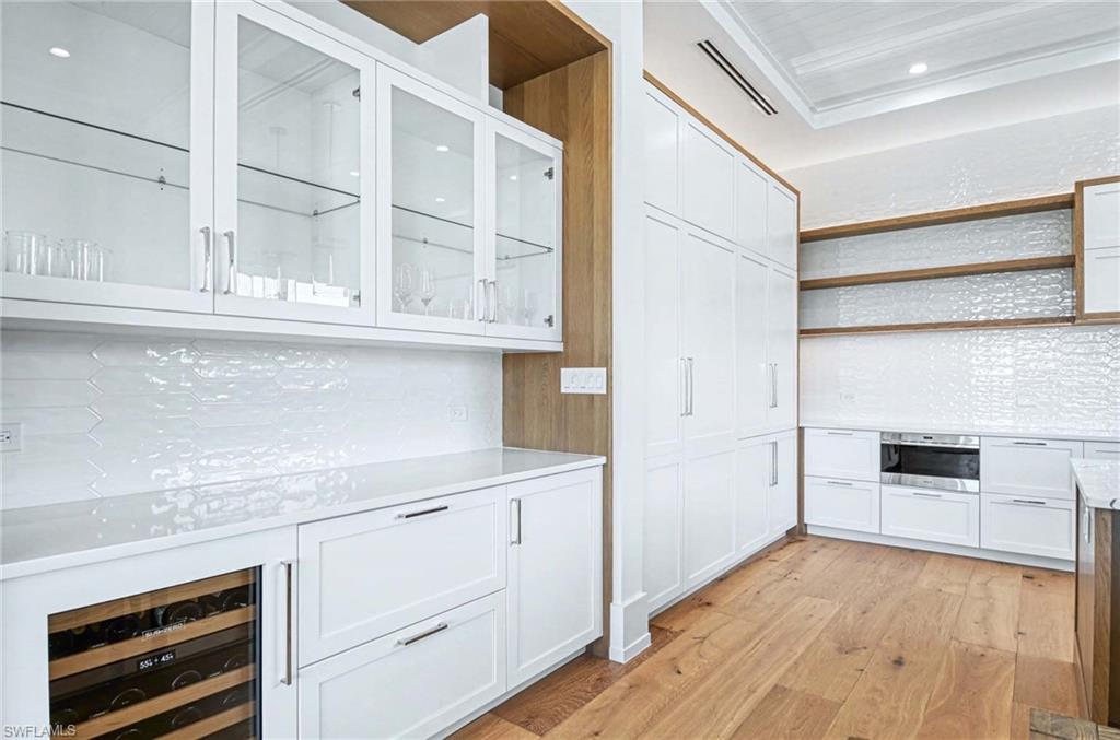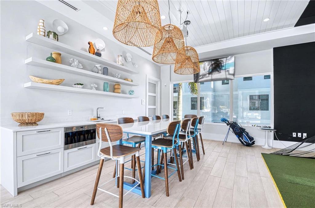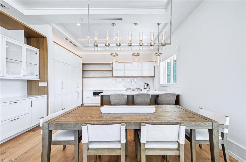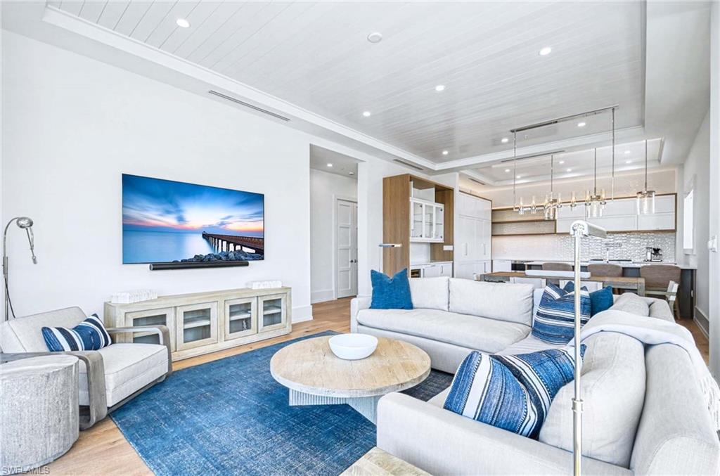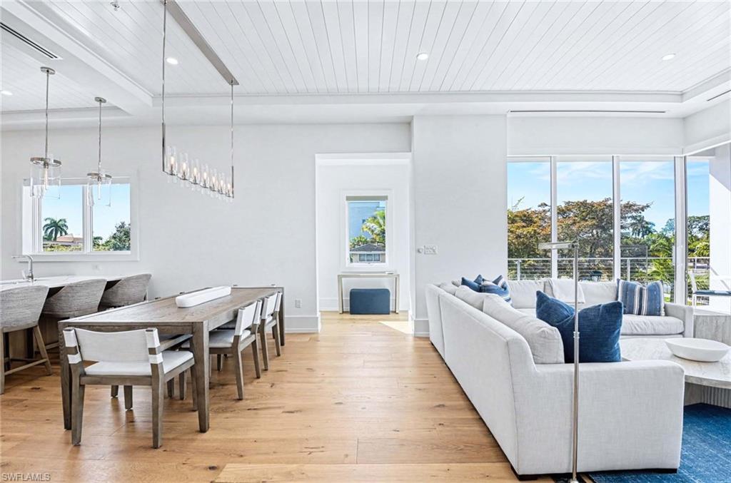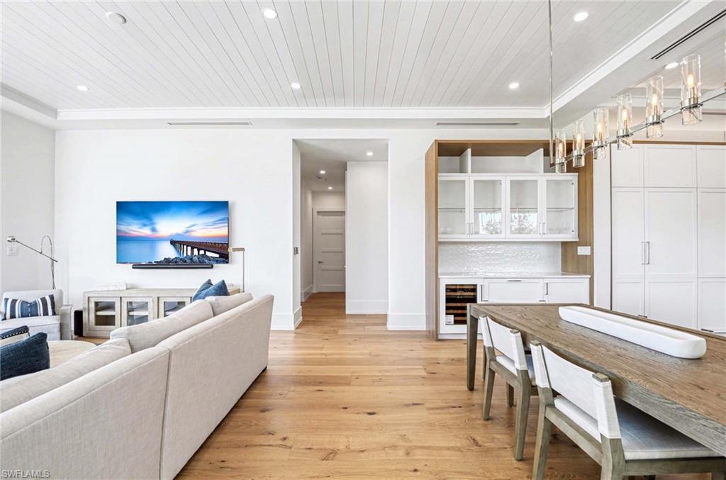 The open concept kitchen is both elegant and functional, featuring Sub Zero refrigeration and beverage chiller, a Wolf gas range and microwave, quartz countertops, a striking tile backsplash, pot filler, and a spacious layout ideal for everyday living and entertaining. The dining area includes a stylish dry bar, while the living room opens through dramatic sliders to the wraparound lanai, where ceiling beams and tongue and groove detail enhance the inviting outdoor space.