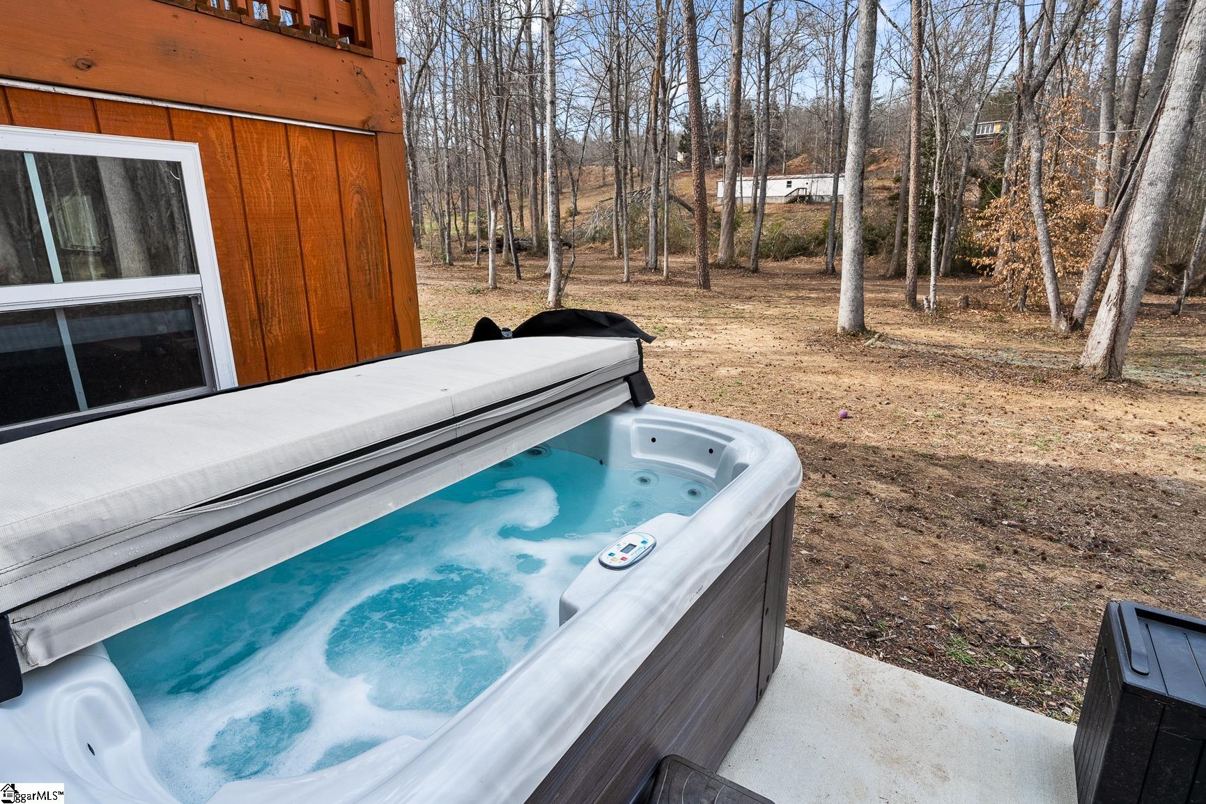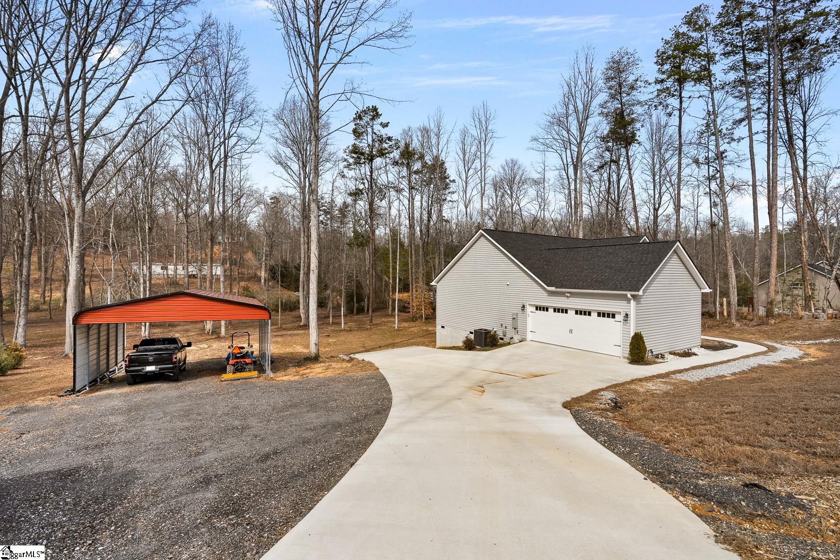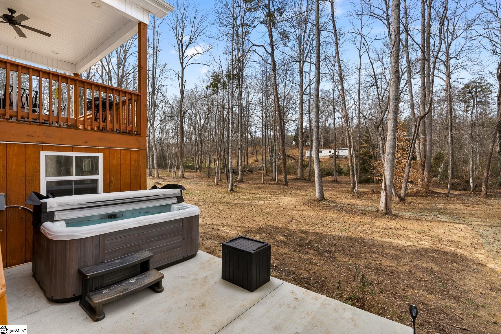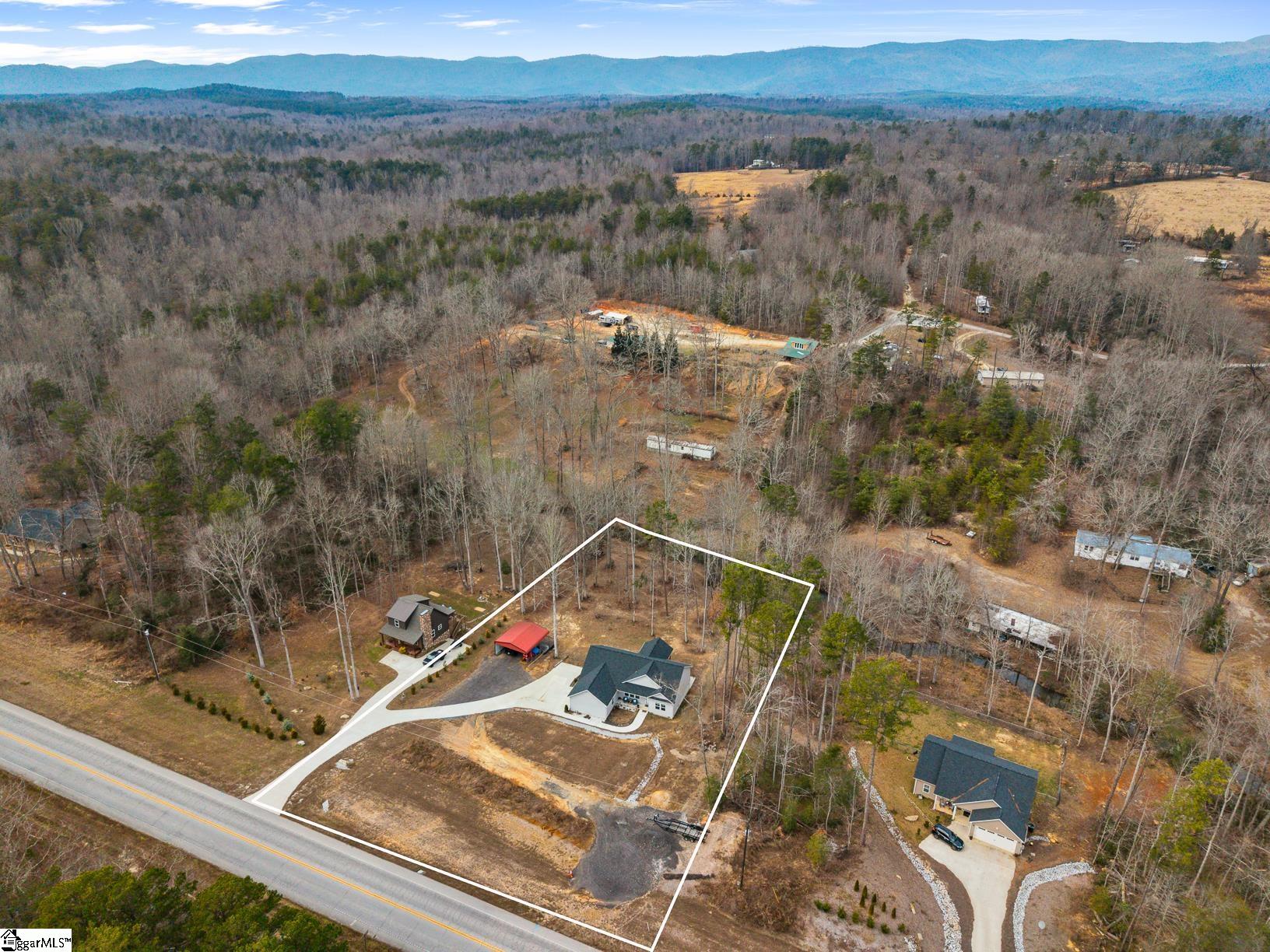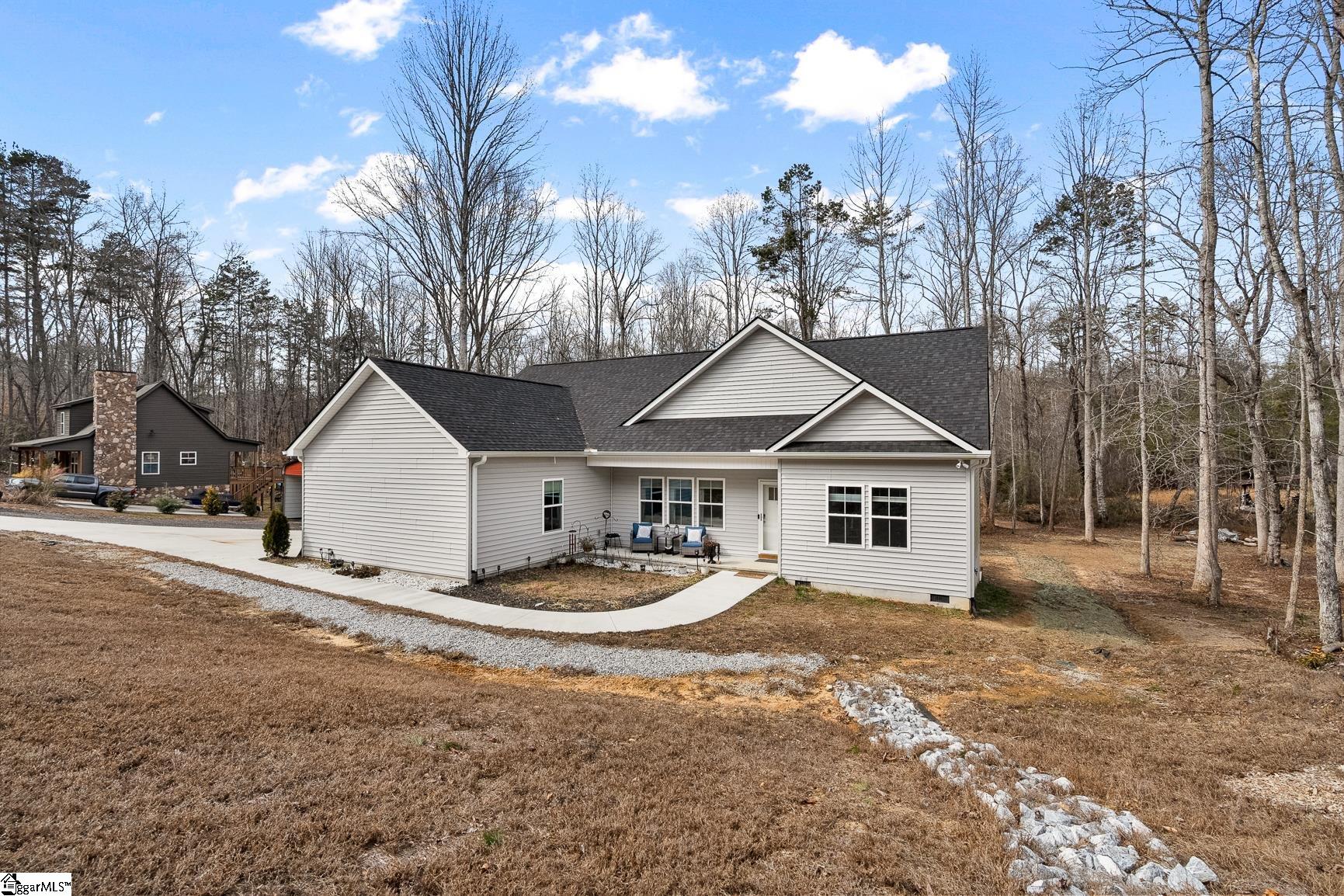 Built in 2024, this beautifully crafted one-level ranch offers approximately 1, 700 square feet of modern living on nearly 2 private acres along the scenic Cherokee Foothills corridor — with no HOA and short-term rentals allowed. Inside, a bright, open-concept layout features tray ceilings and recessed lighting that create an airy, expansive feel. Durable luxury vinyl plank flooring runs throughout the main living areas. The kitchen displays granite countertops, white cabinetry, stainless steel appliances, a large island with bar seating, and a window over the sink overlooking the backyard. The spacious living room offers generous natural light and a tray ceiling, creating a warm and inviting gathering space. This home features a split-bedroom floor plan with the primary suite including a double vanity in the en-suite bath, while two additional bedrooms are ideal for guests, a home office, or hobbies. Outdoor living is equally impressive. Enjoy morning coffee on the covered deck surrounded by mature trees, relax in the hot tub on the lower patio, and explore the expansive yard bordered by wooded privacy. A gentle creek winds along the back of the property, adding to the natural beauty and offering a tranquil backdrop with the soothing sound of flowing water. In addition to the attached two car garage, the property also features additional concrete for parking, a detached two-car carport with a metal roof, and a dedicated workshop with electricity — perfect for storage, projects, or outdoor equipment. Located in the Walhalla School District, the home offers close proximity to the natural beauty of Lake Jocassee at Devils Fork State Park and the hiking and recreation at Table Rock State Park. Come see this beautiful home today.