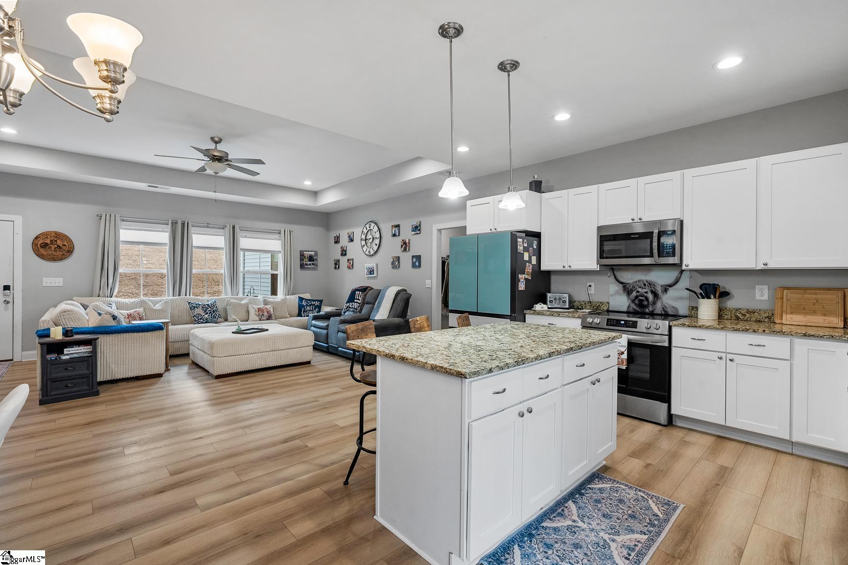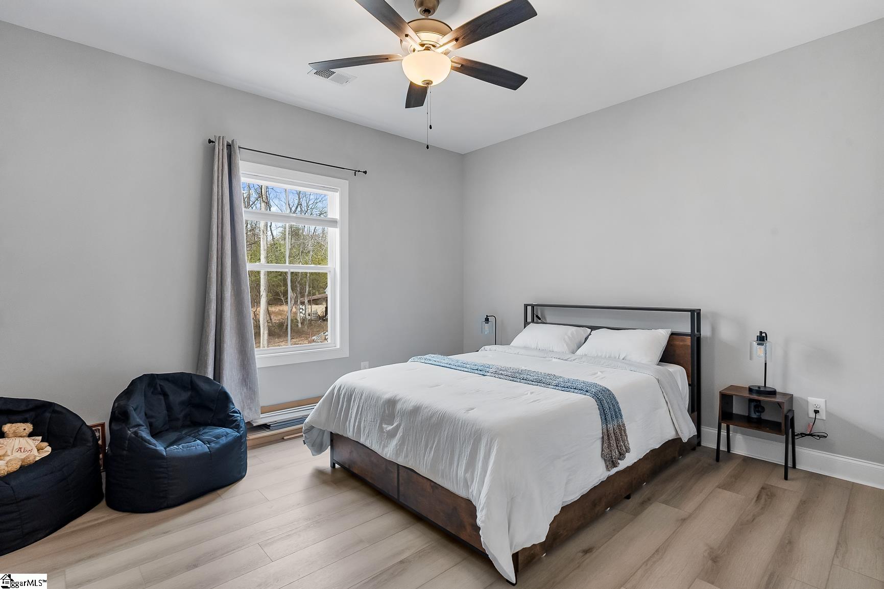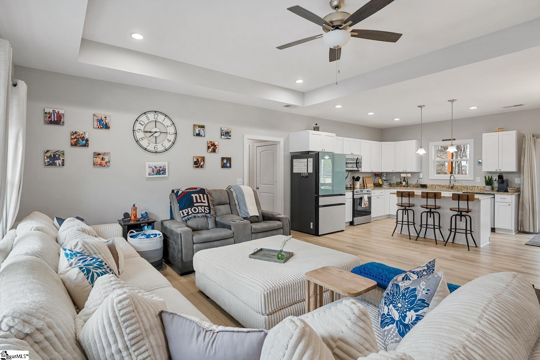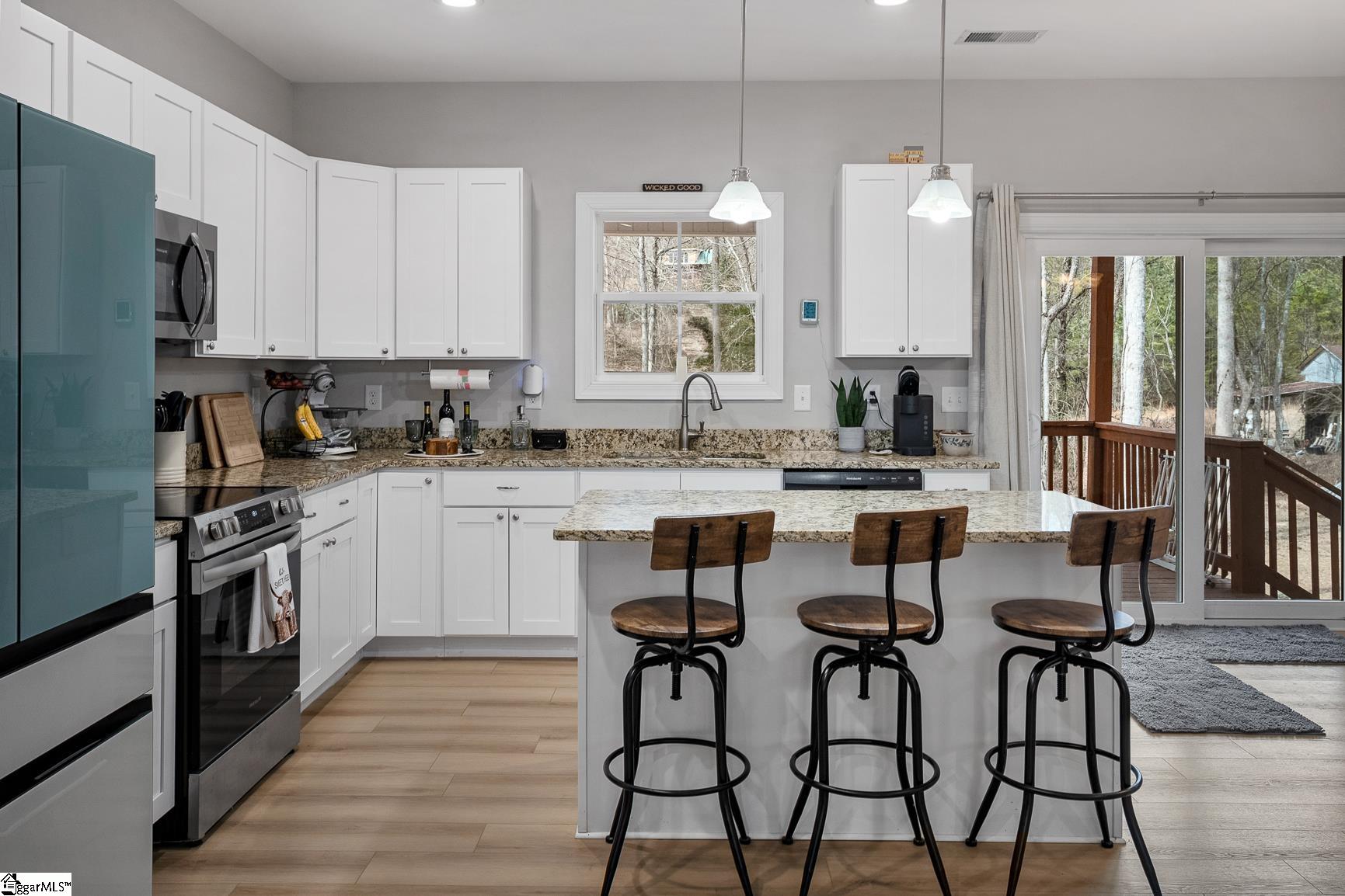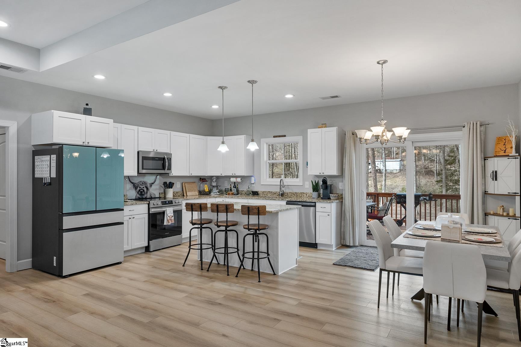 Built in 2024, this beautifully crafted one-level ranch offers approximately 1, 700 square feet of modern living on nearly 2 private acres along the scenic Cherokee Foothills corridor — with no HOA and short-term rentals allowed. Inside, a bright, open-concept layout features tray ceilings and recessed lighting that create an airy, expansive feel. Durable luxury vinyl plank flooring runs throughout the main living areas. The kitchen displays granite countertops, white cabinetry, stainless steel appliances, a large island with bar seating, and a window over the sink overlooking the backyard. The spacious living room offers generous natural light and a tray ceiling, creating a warm and inviting gathering space. This home features a split-bedroom floor plan with the primary suite including a double vanity in the en-suite bath, while two additional bedrooms are ideal for guests, a home office, or hobbies. Outdoor living is equally impressive. Enjoy morning coffee on the covered deck surrounded by mature trees, relax in the hot tub on the lower patio, and explore the expansive yard bordered by wooded privacy. A gentle creek winds along the back of the property, adding to the natural beauty and offering a tranquil backdrop with the soothing sound of flowing water. In addition to the attached two car garage, the property also features additional concrete for parking, a detached two-car carport with a metal roof, and a dedicated workshop with electricity — perfect for storage, projects, or outdoor equipment. Located in the Walhalla School District, the home offers close proximity to the natural beauty of Lake Jocassee at Devils Fork State Park and the hiking and recreation at Table Rock State Park. Come see this beautiful home today.