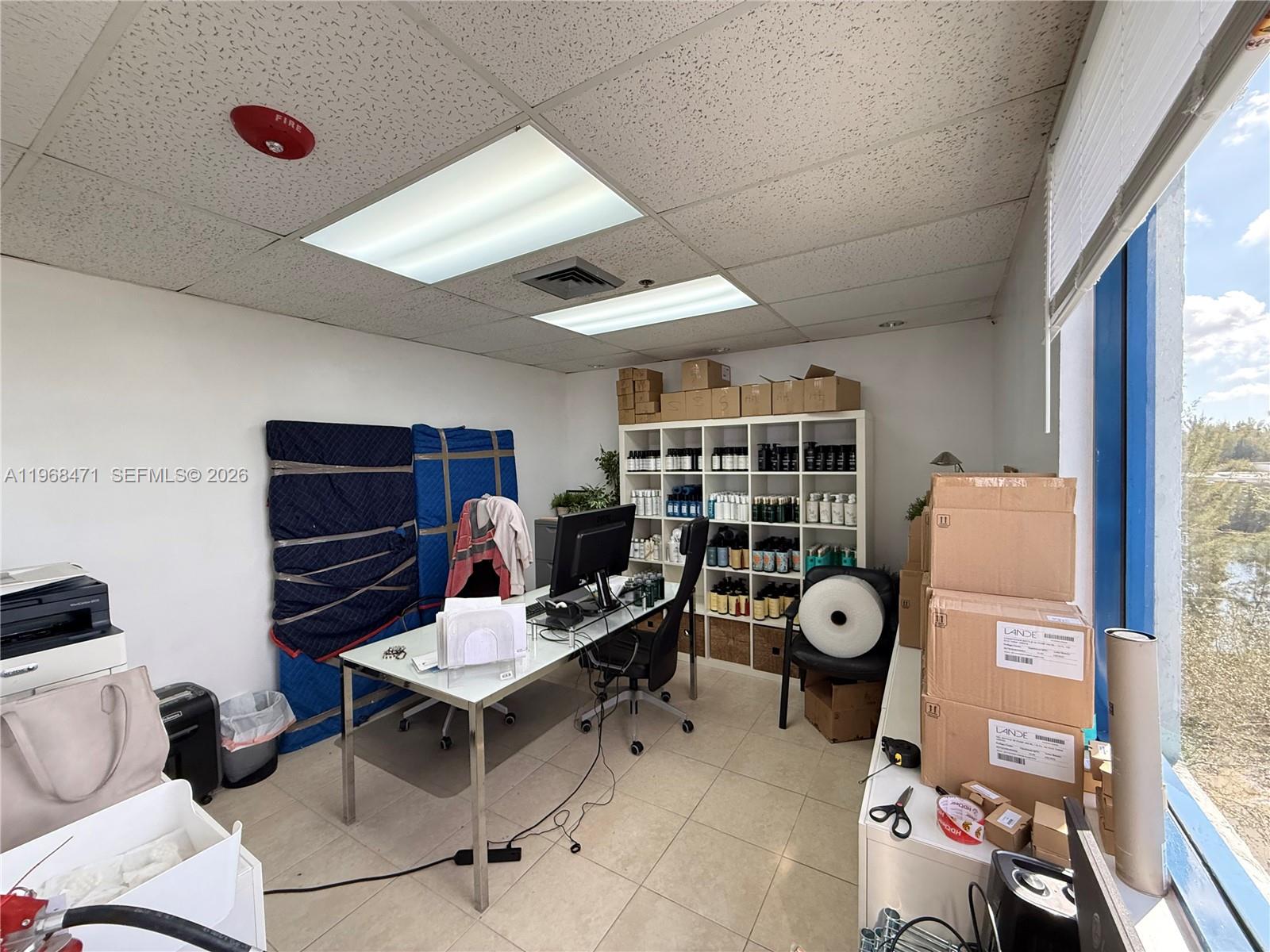 The unit is efficiently laid out and divided into two separate rooms with a dividing door, plus a main office area, allowing flexibility for private offices, consultation space, or administrative use. The space features ample natural light and includes two private storage closets for added functionality.