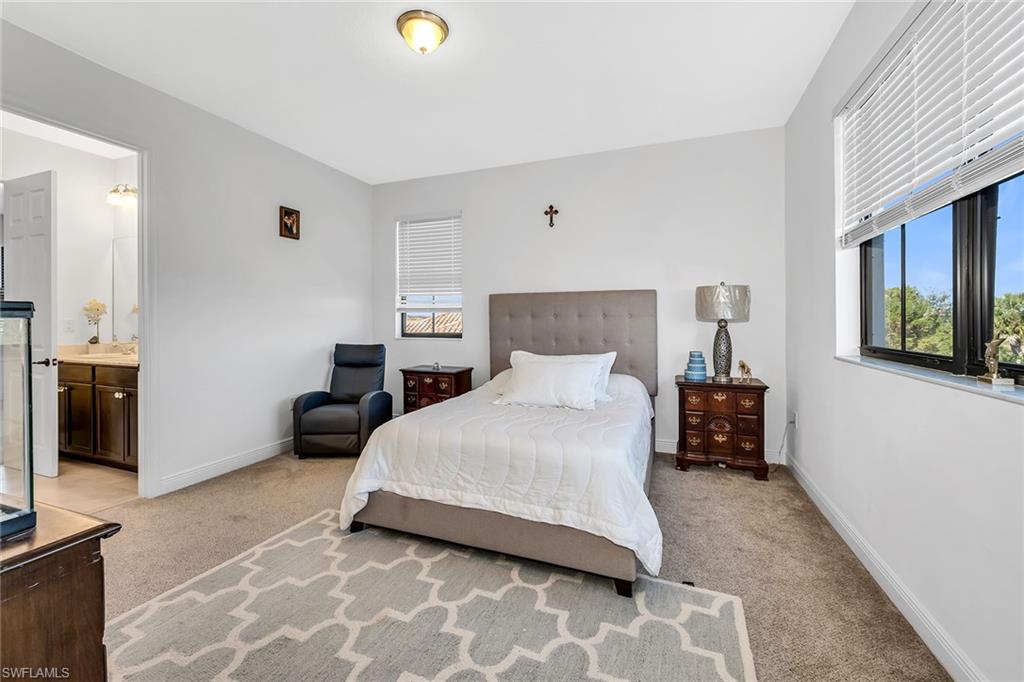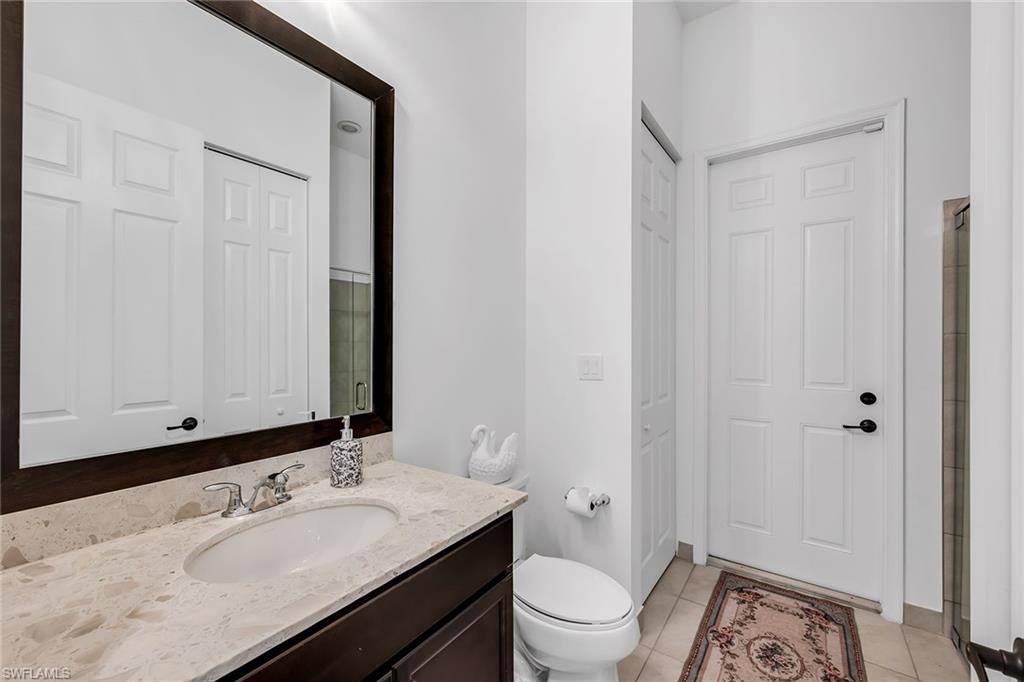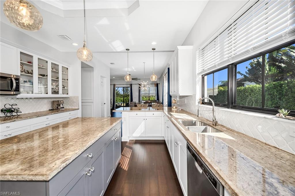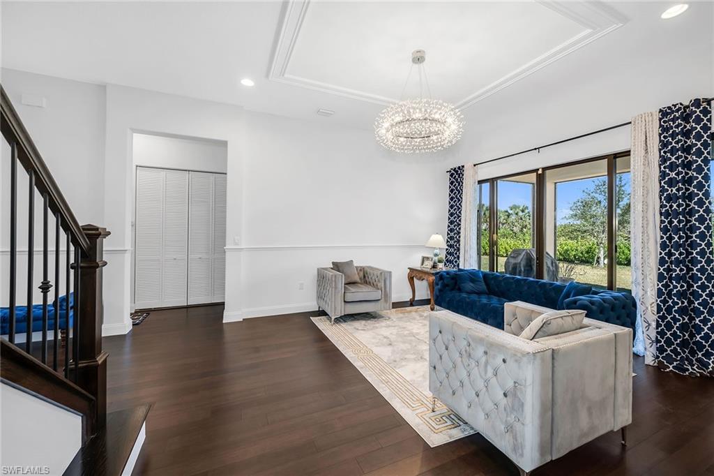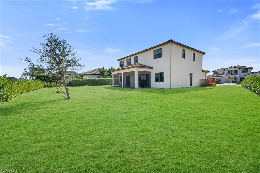 In the exclusive Maple Ridge Reserve in Ave Maria, this exceptional Elsinore floor plan showcases private garden views, custom upgrades and a spacious oversized homesite with a large backyard offering partial lake and preserve views. Designed for elegance and comfort, the two-story residence features four bedrooms plus a den, three full baths and a three-car garage. Hardwood flooring flows throughout the main living areas, complemented by custom wall trim and modern light fixtures that elevate the home’s refined aesthetic. The expansive backyard provides ample room for a custom pool, while the panoramic screened lanai creates a seamless connection between indoor and outdoor living. A grand double-door entry with an arched transom window welcomes you into a thoughtfully designed interior where natural light fills each space. The main living areas are enhanced by rich wood flooring and detailed millwork. Glass sliders open to the lanai from multiple rooms, offering tranquil views. The great room is highlighted by a stunning chandelier set within a tray ceiling and provides direct lanai access, while adjacent family room features a striking stacked stone entertainment center with fireplace, creating a warm and inviting gathering space. The chef’s kitchen blends timeless style with functionality, appointed with white cabinetry including glass-front upper cabinets and under-cabinet lighting, granite countertops, tile backsplash and a window above the sink for natural light. Stainless steel appliances include a range with hood, dishwasher, refrigerator/freezer and microwave. A formal dining area or den is positioned beside a large window, offering flexibility for entertaining or a private home office. A first-floor guest bedroom is conveniently adjacent to a full bath with walk-in shower and glass enclosure. Upstairs, the spacious primary suite offers a bonus area and two walk-in closets. The en-suite bath features dual vanities with a dedicated makeup counter, full-width framed mirrors, a walk-in shower with glass enclosure and a separate soaking tub. Two additional guest bedrooms share a Jack-and-Jill bath with shower and tub combination. A versatile flex room provides a setting for a media or game room. The laundry room is equipped with a Whirlpool front-load washer and dryer along with overhead cabinetry for added storage. Storm protection includes impact windows and shutters for added peace of mind. Residents of Maple Ridge Reserve enjoy resort-style amenities including a sparkling pool, fitness center, card and billiards rooms, as well as beautifully appointed event and meeting spaces. Ideally close to Ave Maria University and the vibrant Town Center’s dining and shopping, along with nearby parks, dog parks, scenic trails, pickleball and tennis courts, this home offers an exceptional opportunity to experience the best of Ave Maria lifestyle.