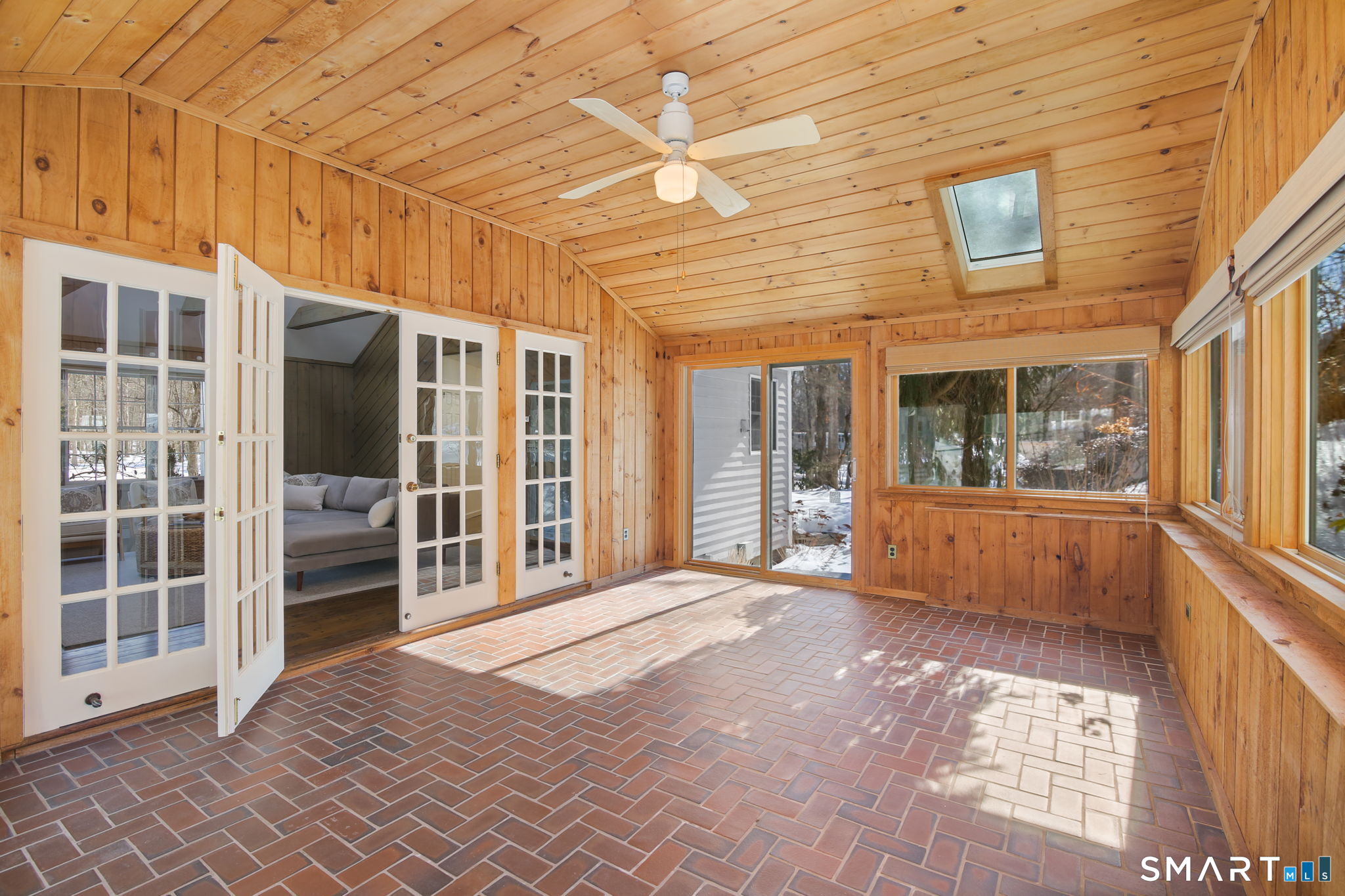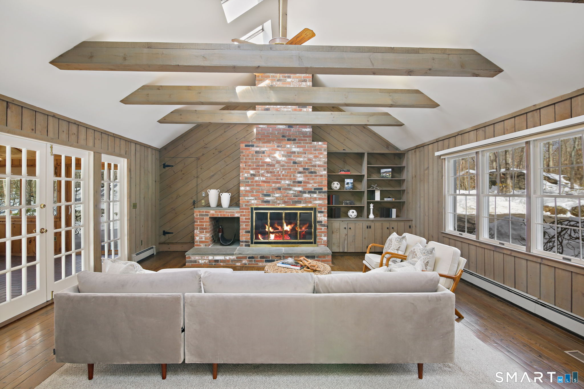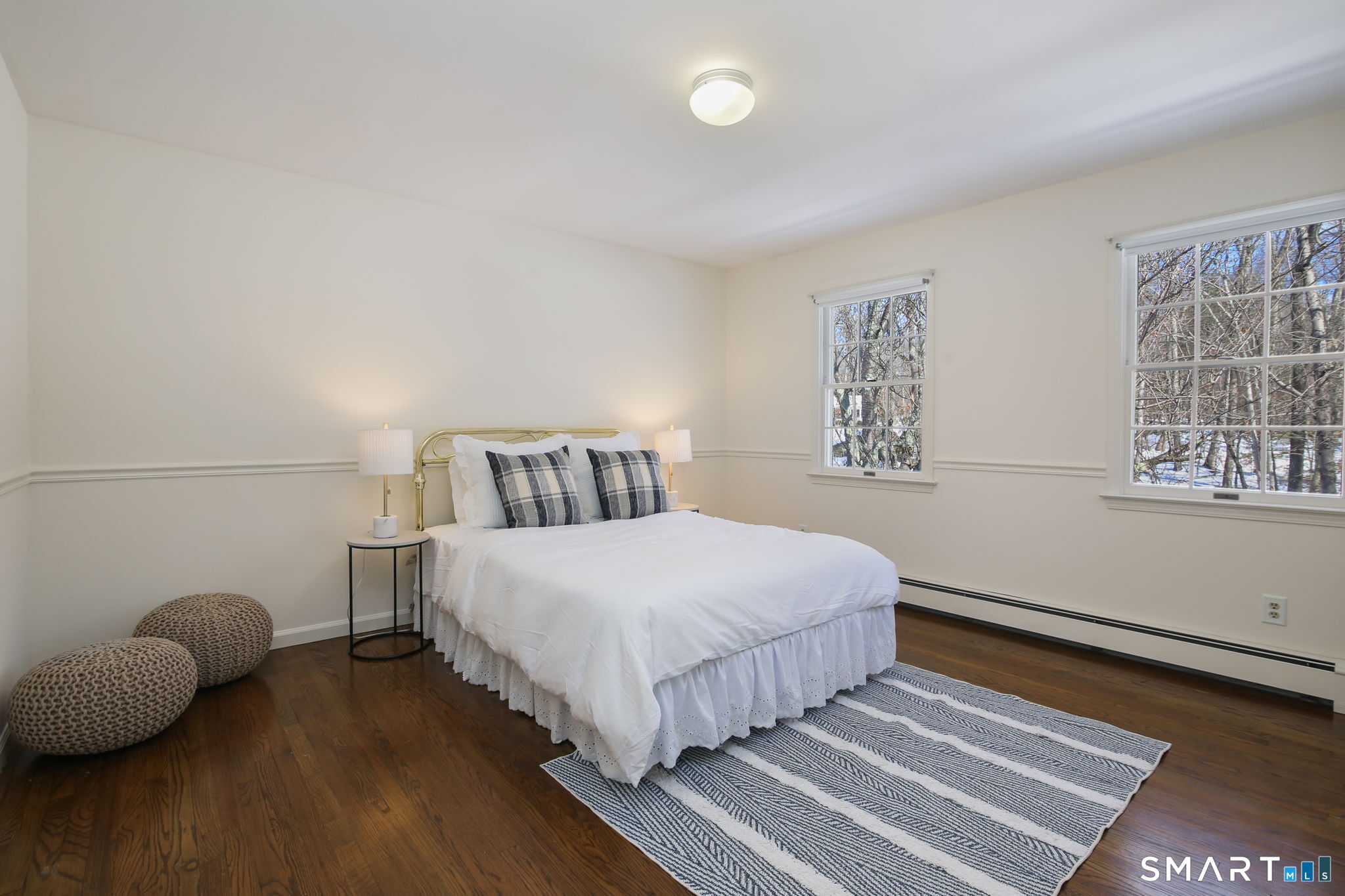 Ideally situated in southern Wilton near the New Canaan border, this beautifully appointed four-bedroom, 2. 5-bath Colonial with a heated gunite pool pairs a private setting with easy access to surrounding amenities. Set on 2. 6 acres along one of Wilton's most scenic roads, the property provides a peaceful and inviting setting. Sun-filled and thoughtfully designed, the main level offers an easy flow for everyday living and entertaining. A spacious 30-foot eat-in kitchen opens to the backyard and flagstone patio, creating seamless indoor-outdoor living. The vaulted great room features exposed wood beams, a fireplace, and custom built-ins, and opens through French doors to a charming wood-paneled sunroom with sliding windows and doors, and a herringbone tile floor. Additional highlights include a formal dining room with detailed wood paneling and bay window, a living room with a wood-burning fireplace, and a private upper level retreat over the garage with new carpeting. Outside, enjoy a private in-ground pool and a stone patio ideal for entertaining. An unfinished basement with high ceilings offers excellent expansion potential. Freshly painted with recent updates, newer mechanicals, and a generator, this home offers the very best of Wilton living. Refrigerator in basement to remain