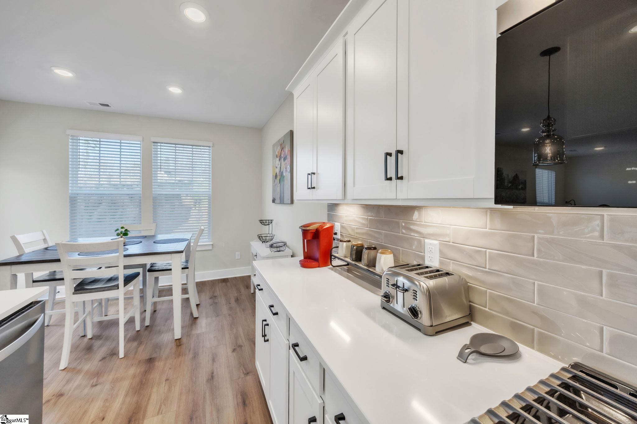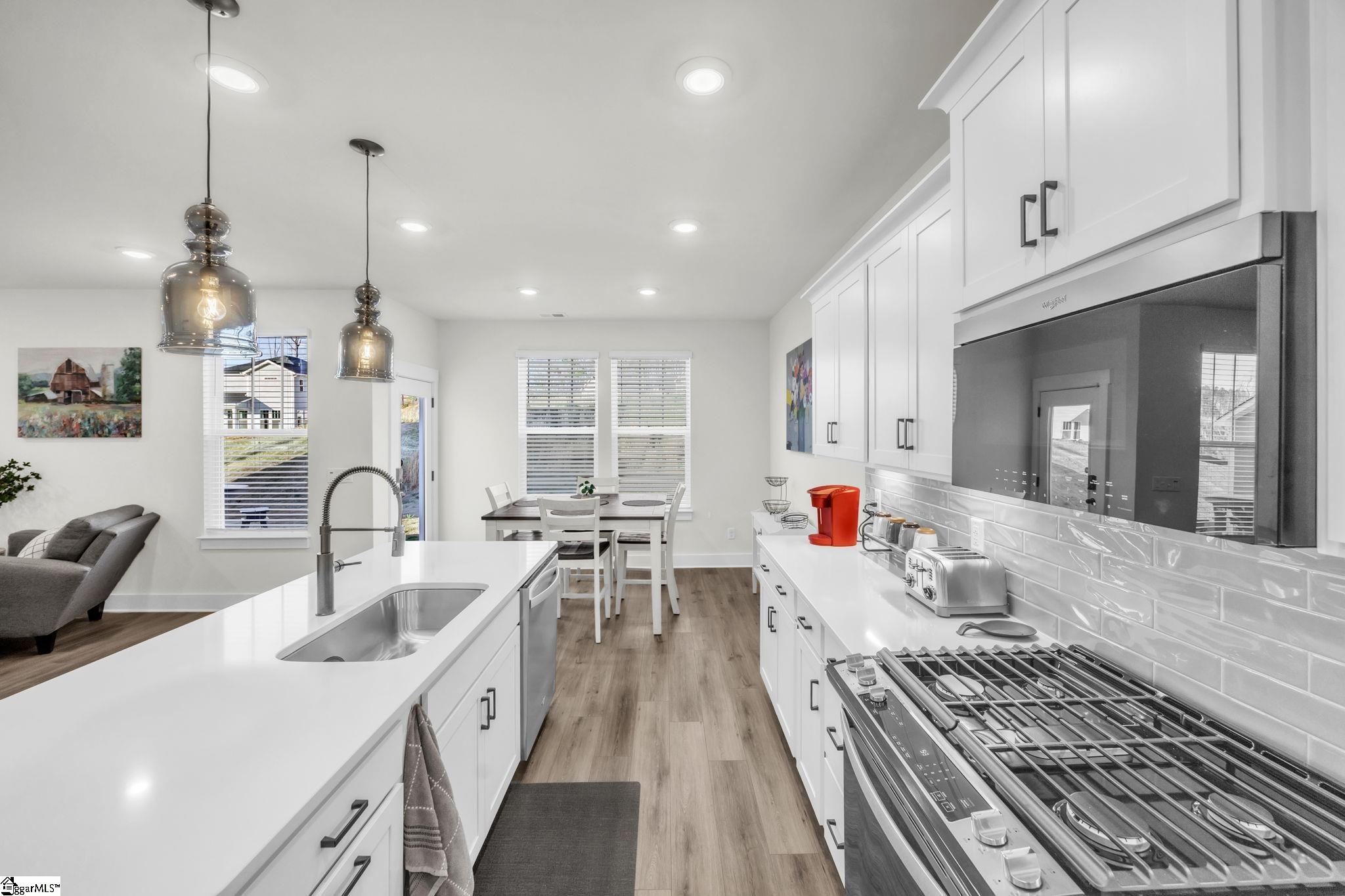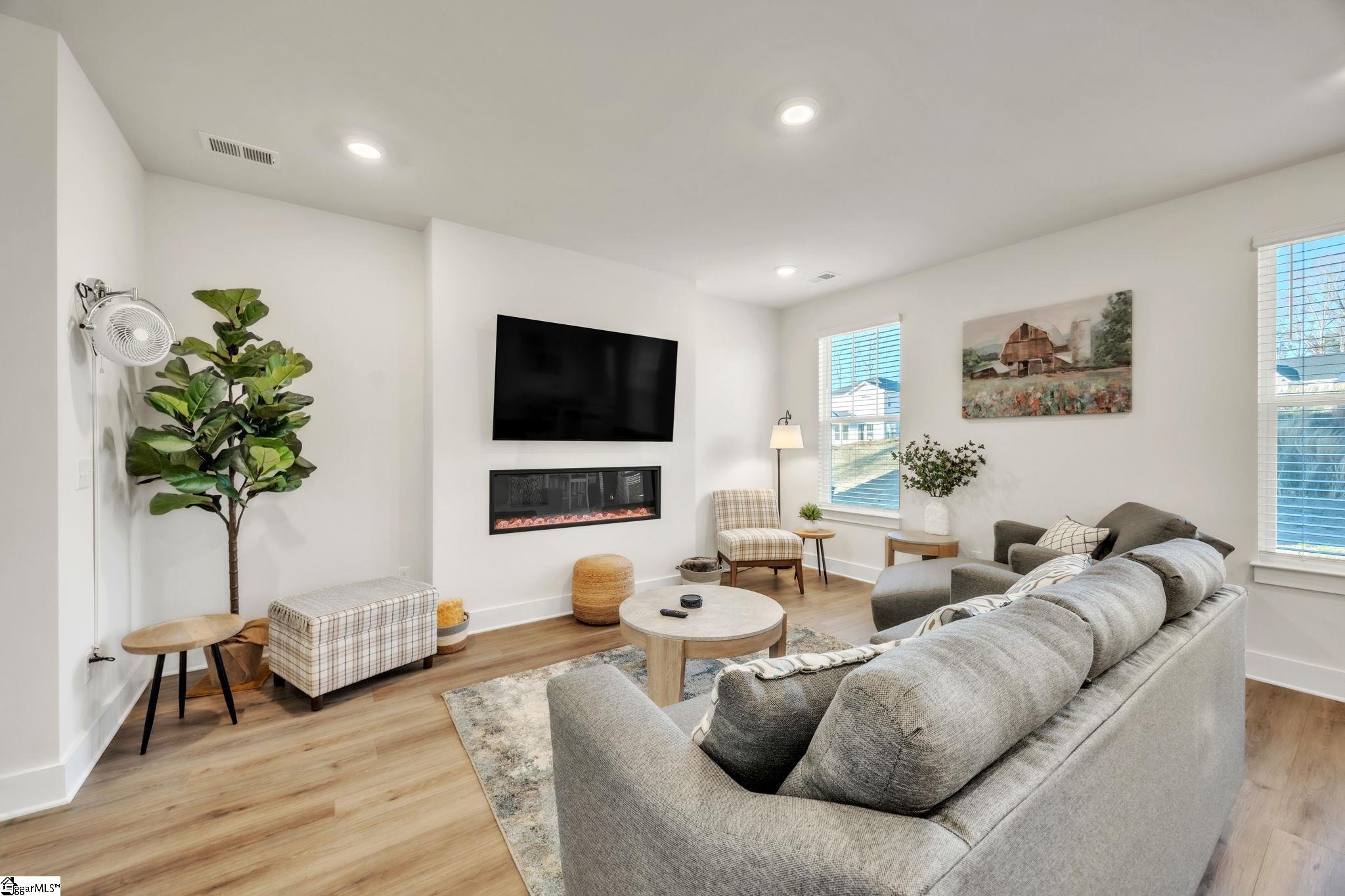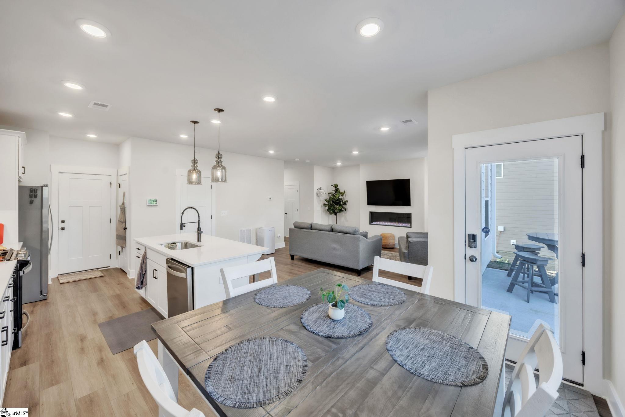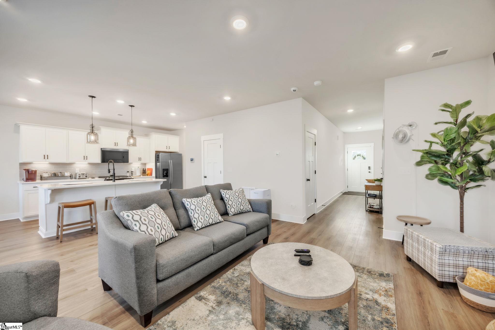 Looking for a newer home in Upstate South Carolina near BMW and the Inland Port? This 3-bedroom, 2. 5-bath home in Moore, SC was built in 2024 and combines modern finishes, open-concept living, and a quiet cul-de-sac setting in the Pleasant Falls community. The main level features an open-concept layout with durable luxury vinyl plank flooring, a powder room, two coat closets, and spacious living and dining areas that connect seamlessly with the kitchen. The kitchen includes white shaker cabinetry, quartz countertops, subway tile backsplash, stainless steel appliances, a walk-in pantry, and a large center island with seating and pendant lighting overlooking the great room. A contemporary fireplace creates a comfortable focal point with both flame ambiance and heater settings. Upstairs, the primary suite includes a Roman-style shower, private water closet, and a spacious walk-in closet. A versatile loft provides additional flexible space for a home office, playroom, or media area. Two additional bedrooms with walk-in closets, a full bath, linen storage, and convenient upstairs laundry complete the second floor. The home is wired with exterior cameras and a security system, and each bathroom includes makeup mirrors for added functionality. Outside, the shaded back patio is well suited for outdoor dining, and the backyard provides space to expand outdoor living. The extra-long driveway and two-car garage add everyday convenience, while durable Hardie siding enhances curb appeal. Located in Moore, South Carolina in Spartanburg County, Pleasant Falls provides convenient access to I-26 and I-85, making commuting to Spartanburg, Greenville, and major employers like BMW Manufacturing, Keurig Dr Pepper, and the Inland Port highly accessible. Buyers relocating to Upstate South Carolina or searching for homes for sale in Moore SC will appreciate the combination of newer construction, modern design, and a growing location.