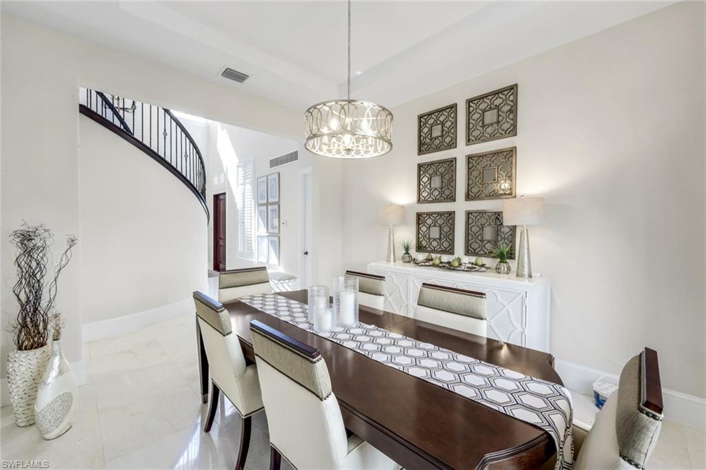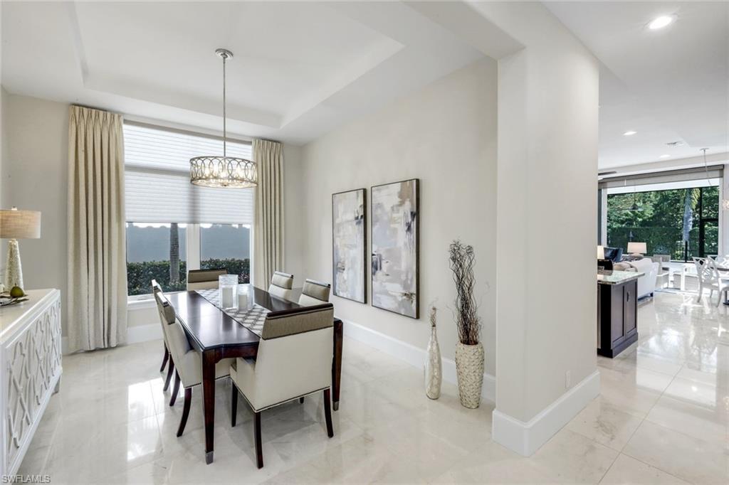 Upon arrival, a graceful curved staircase rises from exquisite marble flooring that flows throughout the main living areas, creating a luminous and sophisticated first impression. Sightlines extend through the living room to the shimmering pool and outdoor retreat beyond, seamlessly integrating indoor and outdoor living.