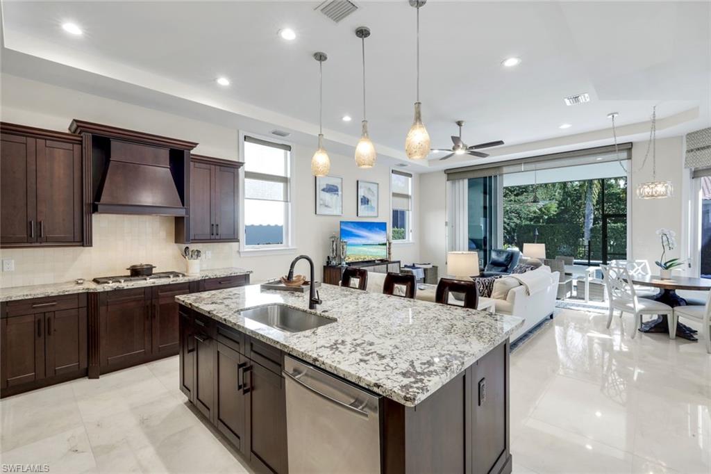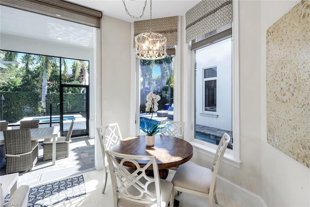 The heart of the home is a true chef’s kitchen. A generous island anchors the space, complemented by premium appliances including a 30” Euro-style double oven, 36” gas cooktop, 42” French-door refrigerator, and under-counter microwave. A sunlit breakfast nook overlooks the lanai, offering the perfect setting for relaxed mornings or casual dining.