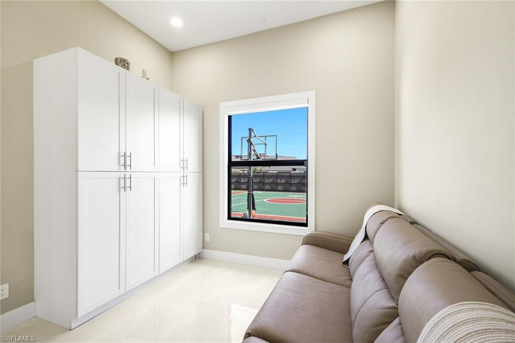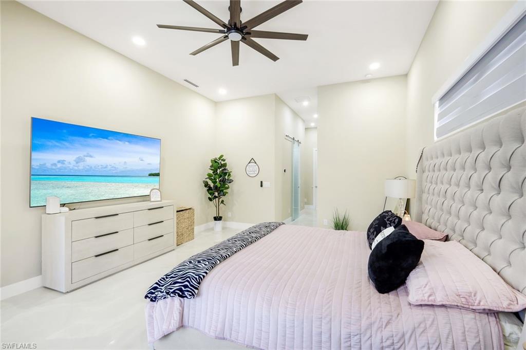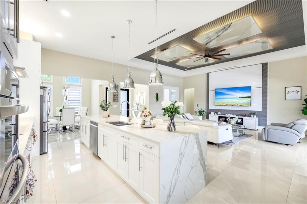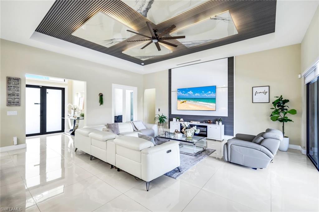 Inside, enjoy volume ceilings, tray ceilings in the great room, 36” tile flooring throughout, and 8-foot impact-rated sliders and doors that flood the home with natural light. The chef’s kitchen and bathrooms showcase quartz countertops and backsplash, upgraded stainless steel appliances, and include washer and dryer. Thoughtful upgrades include electric fireplace, upgraded lighting, fans, and fixtures, plus custom closets with wood shelving in walk-in closets.