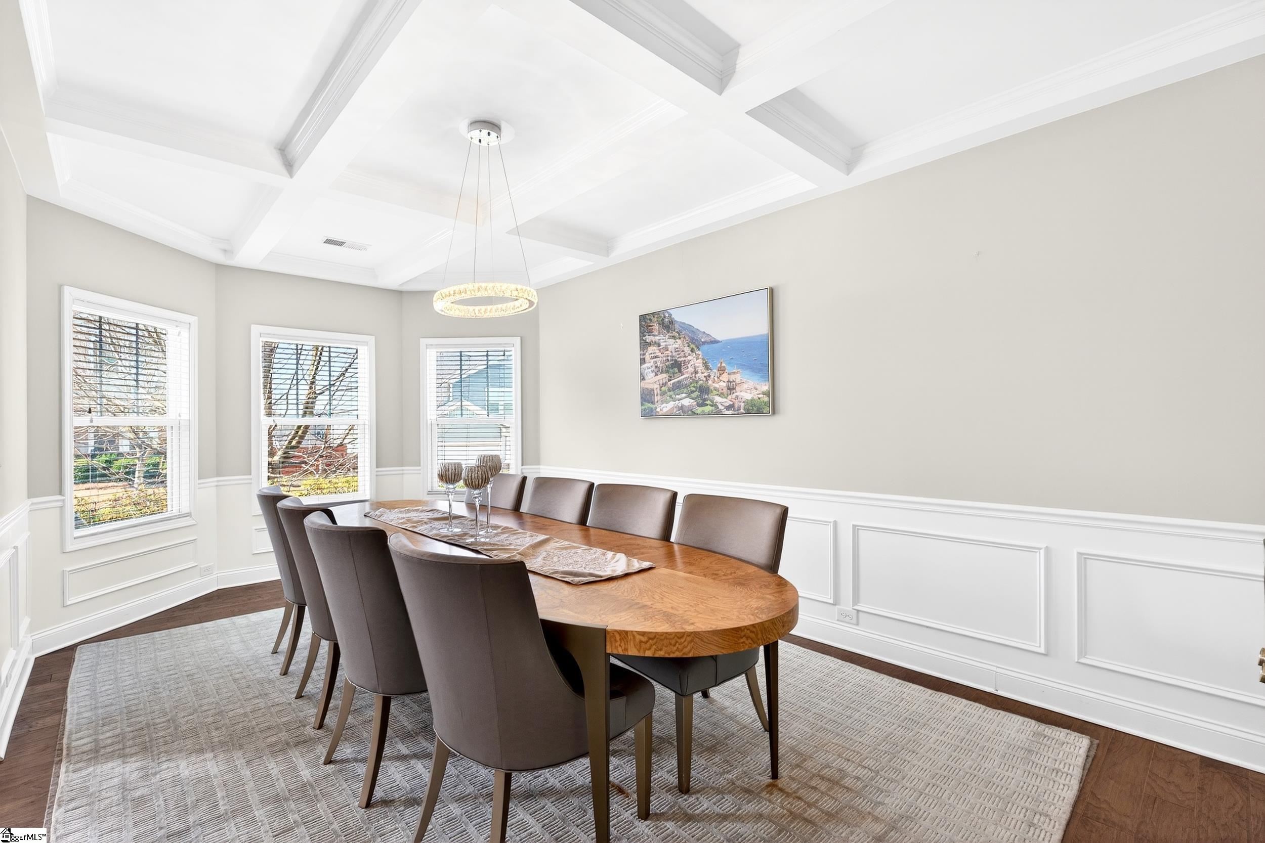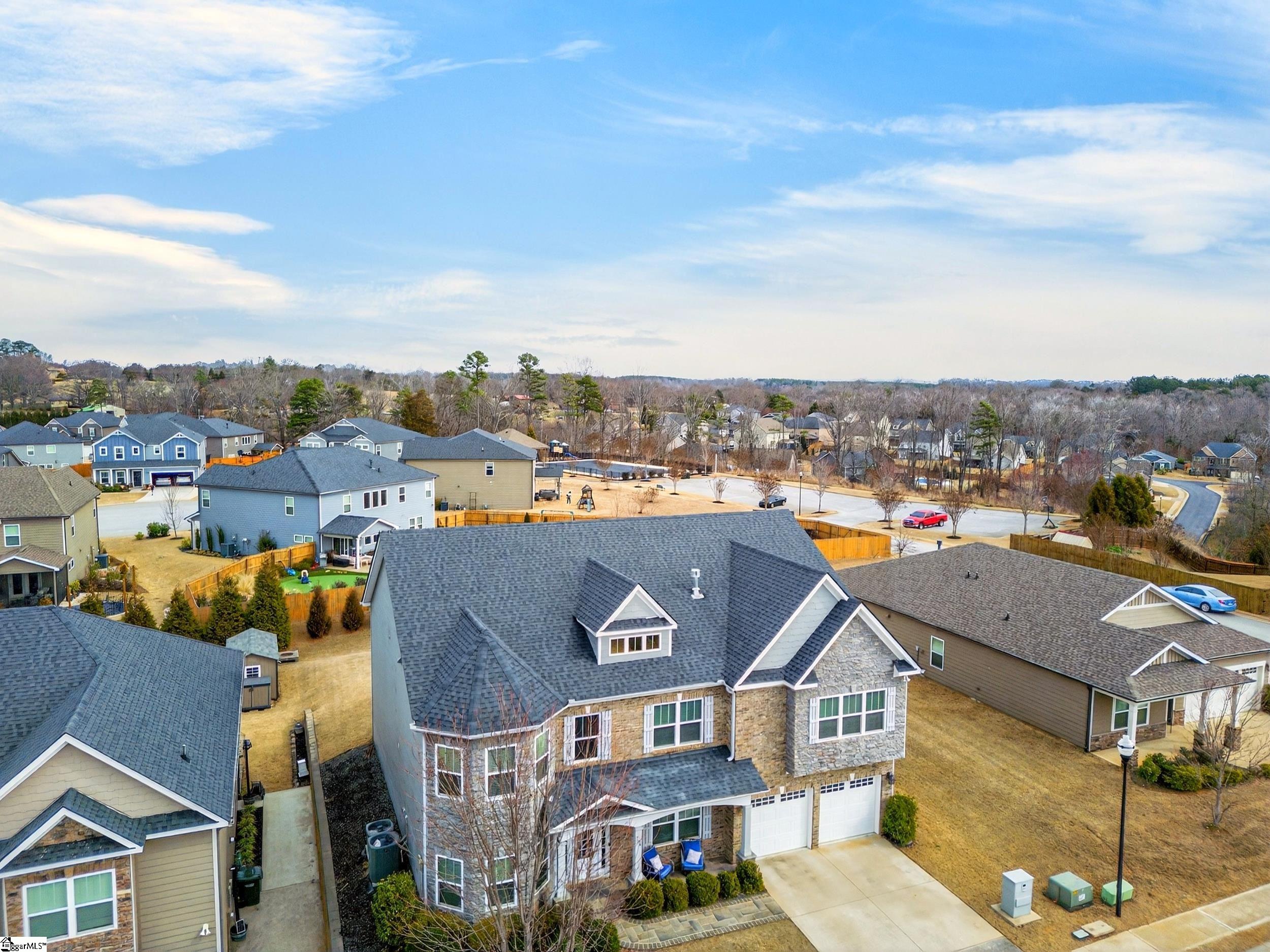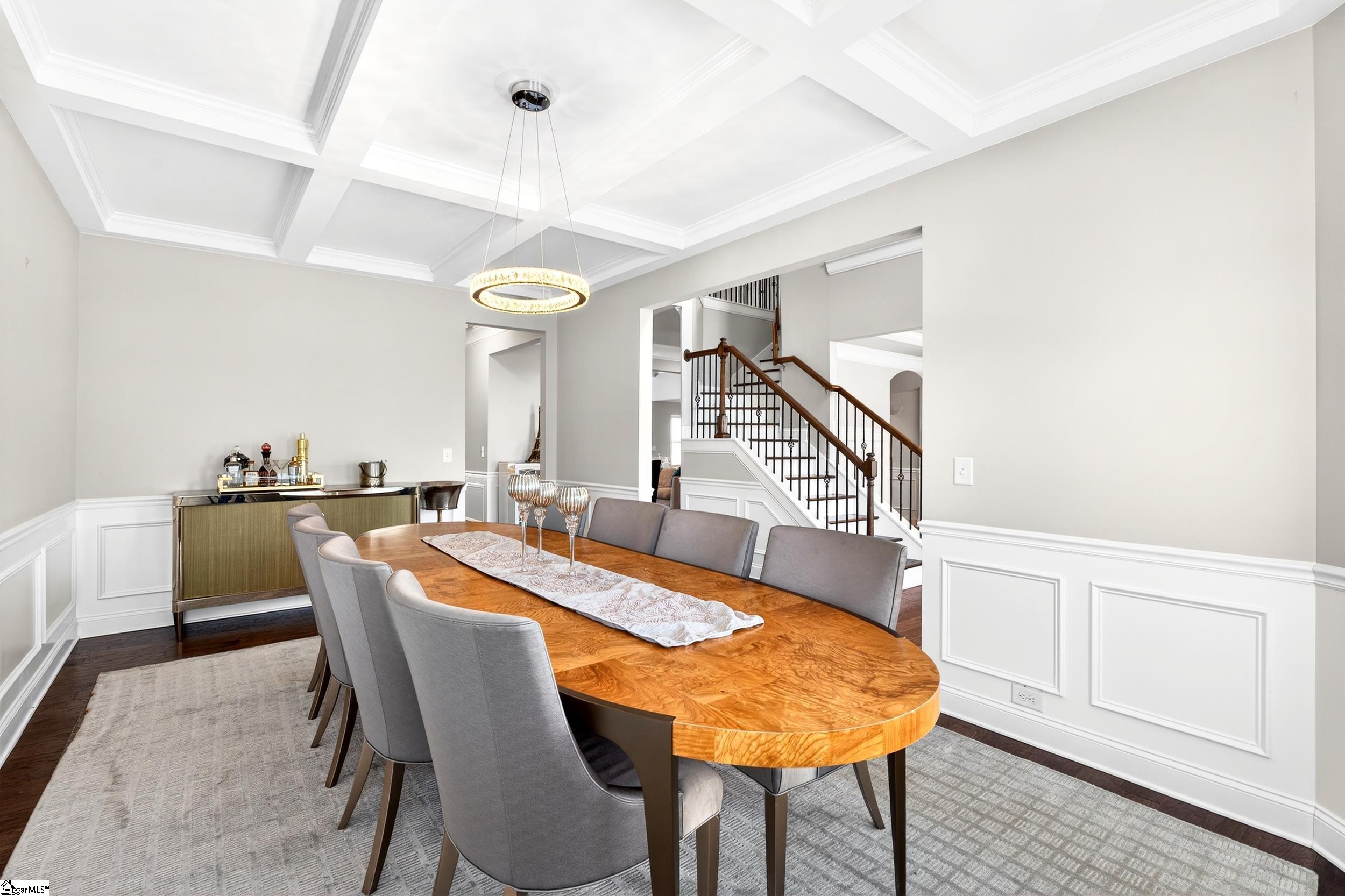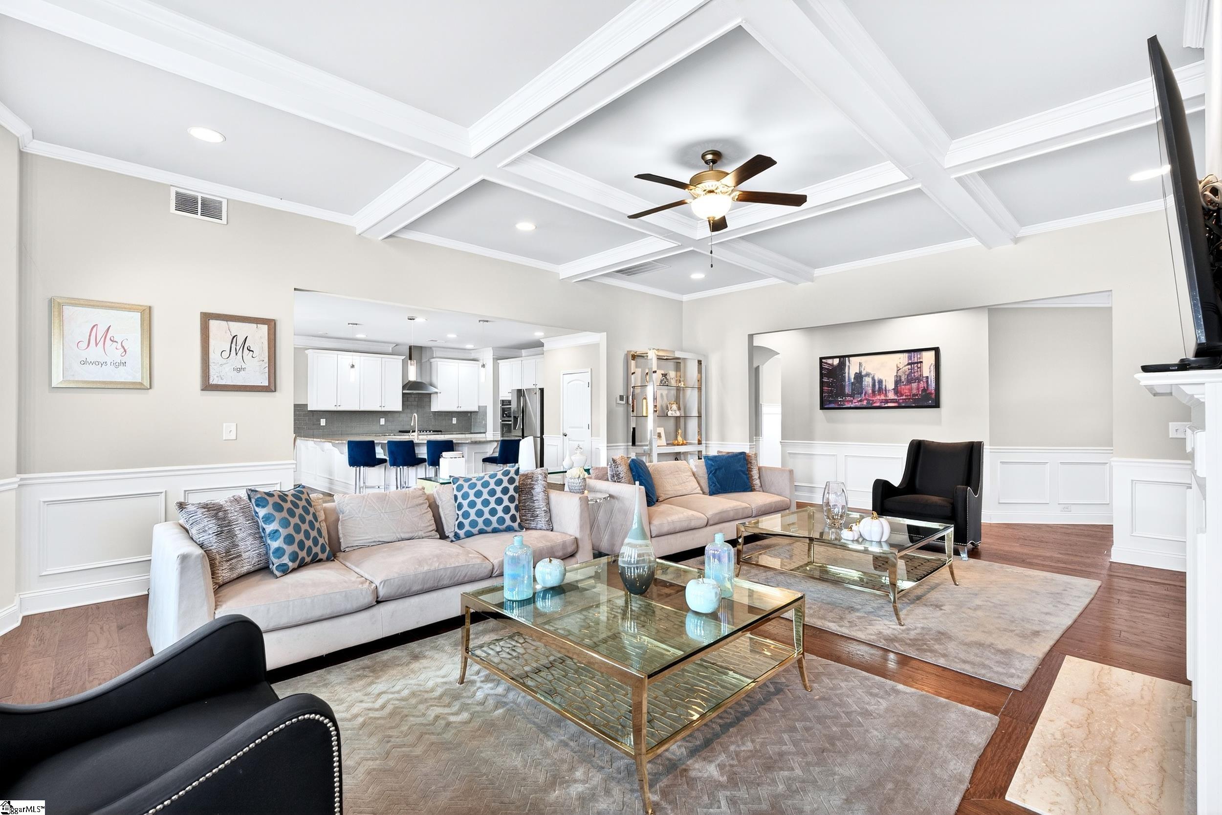 Beautiful brick and stone two-story home featuring hardwood floors, extensive trim detail, and a grand entry with staircase. The main level offers an open floor plan with a coffered ceiling in the living room, fireplace, and abundant natural light. Formal dining room with wainscoting and crown molding. Spacious bedrooms upstairs plus a versatile loft/flex area. The owner’s suite includes dual vanities and a separate shower. Dedicated laundry room and ample storage throughout. Enjoy the covered back patio overlooking a large, level backyard—perfect for entertaining or future outdoor additions. Two-car garage. Conveniently located near BMW, GSP Airport, downtown Greer and Greenville, with easy access to shopping, dining, and major highways.