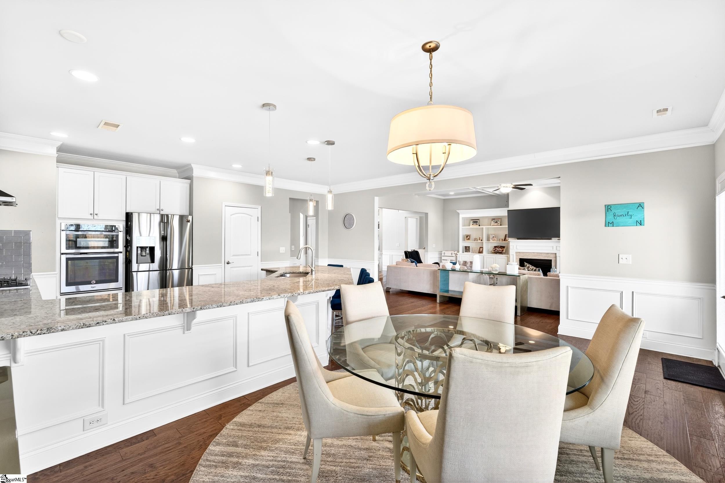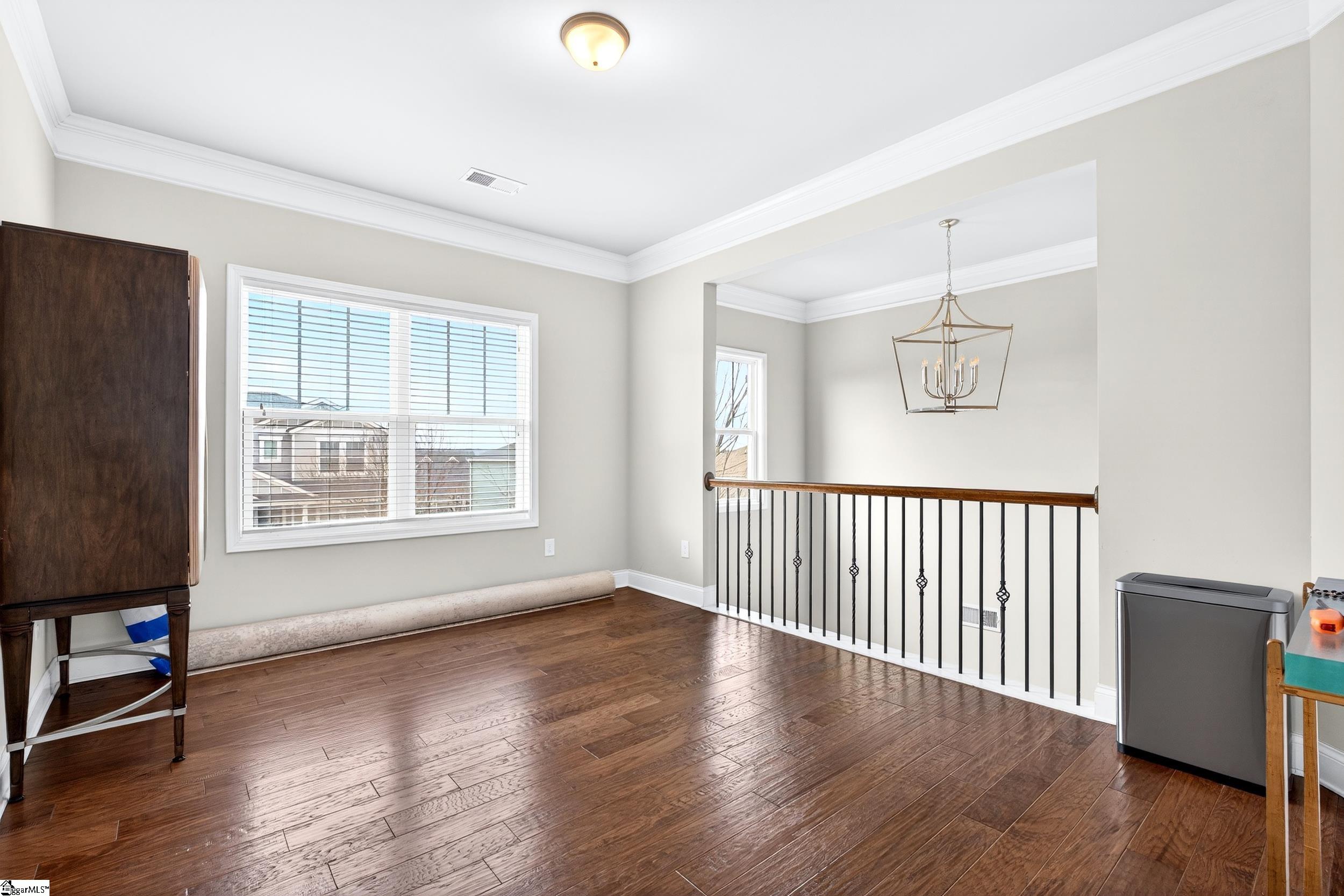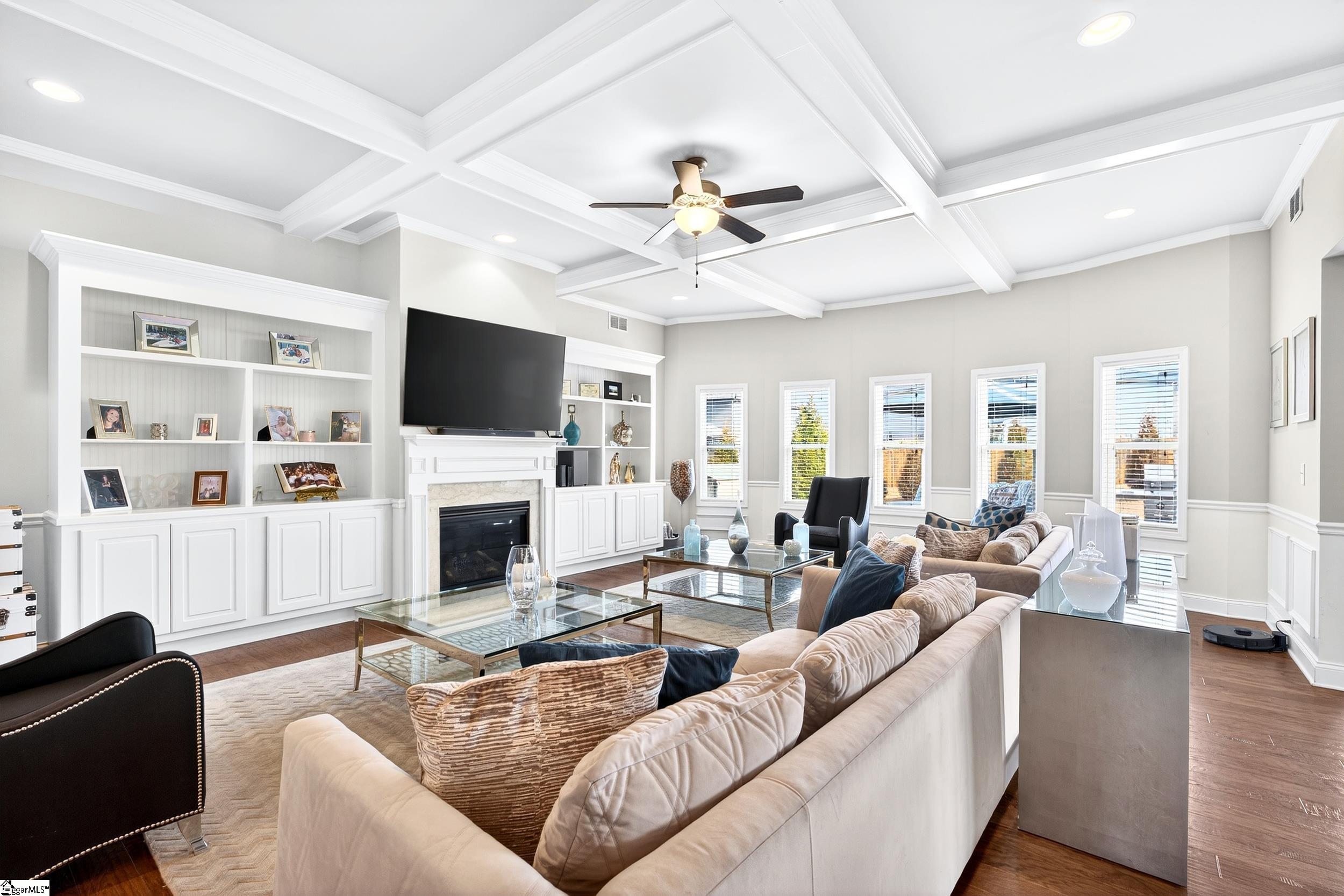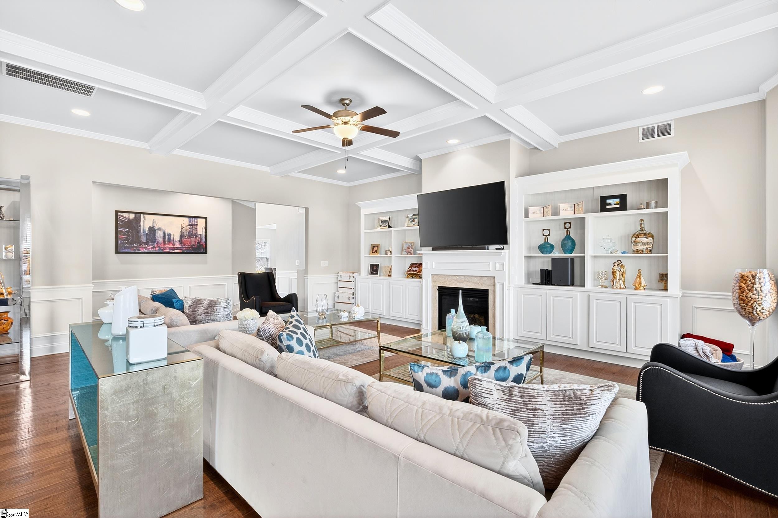Beautiful brick and stone two-story home featuring hardwood floors, extensive trim detail, and a grand entry with staircase. The main level offers an open floor plan with a coffered ceiling in the living room, fireplace, and abundant natural light. Formal dining room with wainscoting and crown molding. Spacious bedrooms upstairs plus a versatile loft/flex area. The owner’s suite includes dual vanities and a separate shower. Dedicated laundry room and ample storage throughout. Enjoy the covered back patio overlooking a large, level backyard—perfect for entertaining or future outdoor additions. Two-car garage. Conveniently located near BMW, GSP Airport, downtown Greer and Greenville, with easy access to shopping, dining, and major highways.