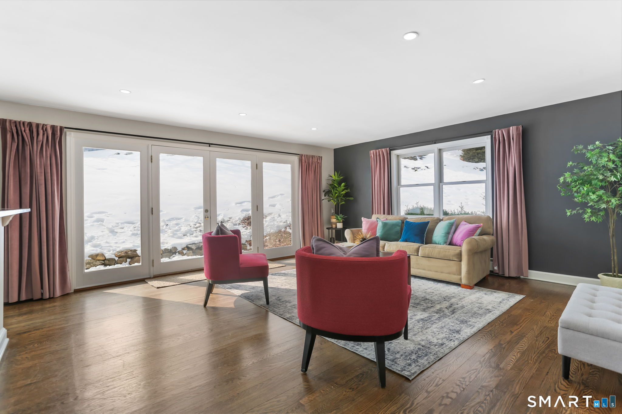 HIGHEST & BEST BID DEADLINE: 6: 00 pm Sunday, March 1st. Sun-drenched, stylish and inviting 4 Bed, 3 Full Bath home on . 7 acres on a quiet cul-de-sac located in the coveted Greens Farms neighborhood, walkable to grocery, restaurants, shops, schools. Gleaming hardwood floors throughout add warmth and character. Spacious front living room with a show-stopping fireplace connects to cheery dining room. Great entertaining flow with an open concept kitchen and adjoining family room - both with French doors onto a large stone patio overlooking the lush, pretty backyard. New kitchen cabinets plus island, double ovens, two sinks, bar stool counter. Over $216K in recent upgrades: New Roof, Hardie Board siding, Central AC, Whole House Generator, Oil Tank, Cedar Fencing, Tree Landscaping. Flexible floor plan: two Primary options: First-Floor Primary with new en-suite bath or Upper-level with wrap-around balcony and two closets, one walk-in. Luxurious second floor full hallway bath with radiant heat floors, double sink quartz vanity, plenty of storage. Oversized two-car garage, fully-finished walk-out basement with mudroom/laundry, gym, rec room. Fully-fenced backyard with flat areas for playsets/sports. Stellar curb appeal w/stone retaining walls, steps, Belgian Block lined driveway and commanding presence on its elevated "Builder's Prime Lot" at the end of the cul-de-sac - no thru traffic. Peaceful, private property near Metro North, schools, shops - all in fabulous Westport, Summer exterior photos and neutral interiors: MLS # 170155513