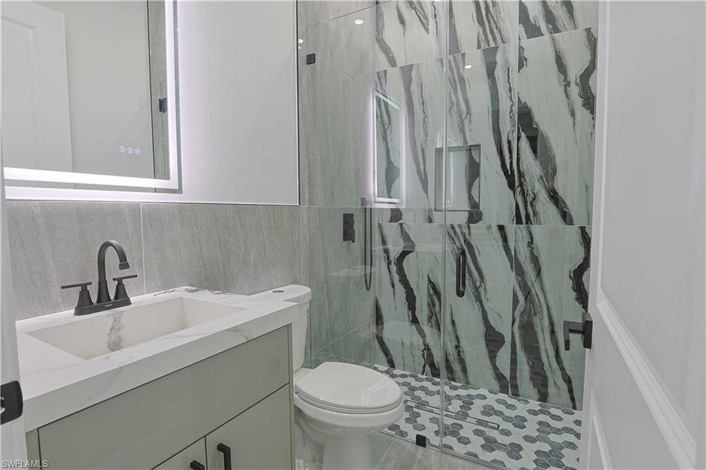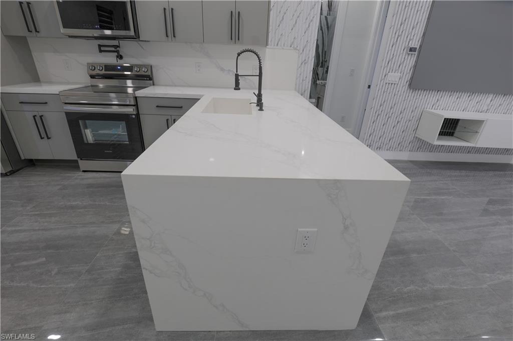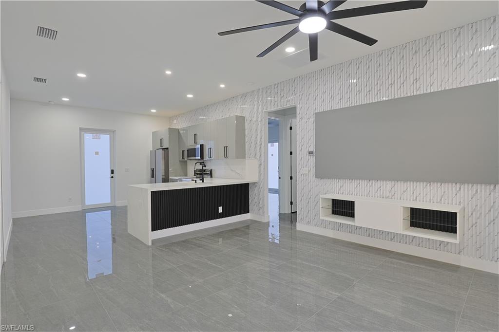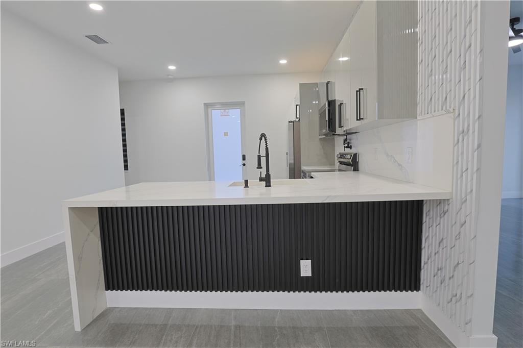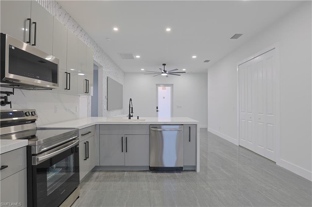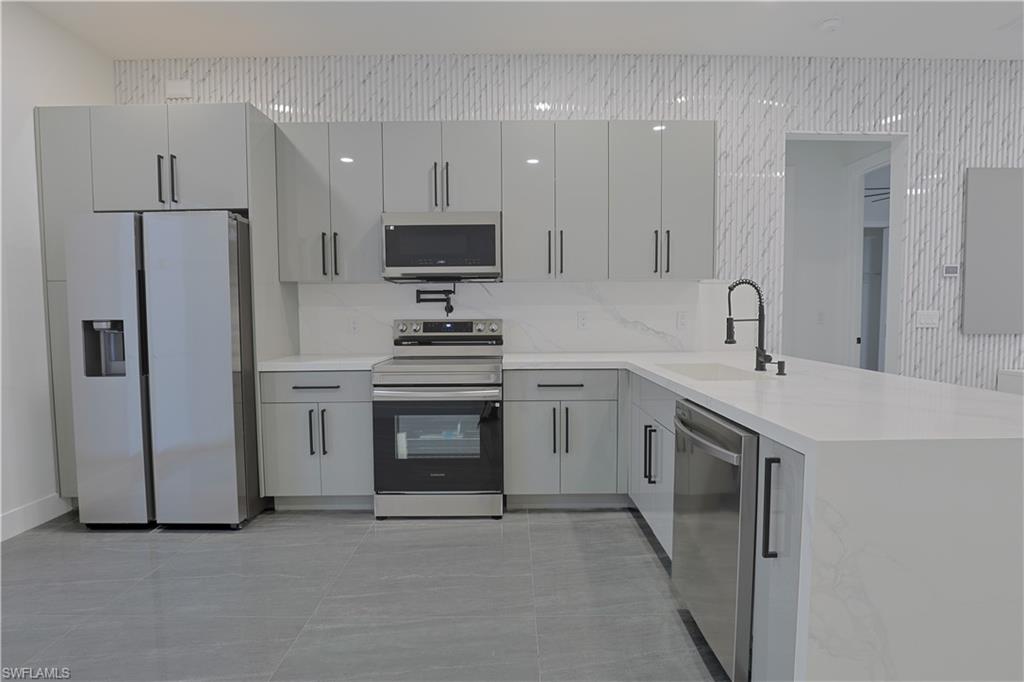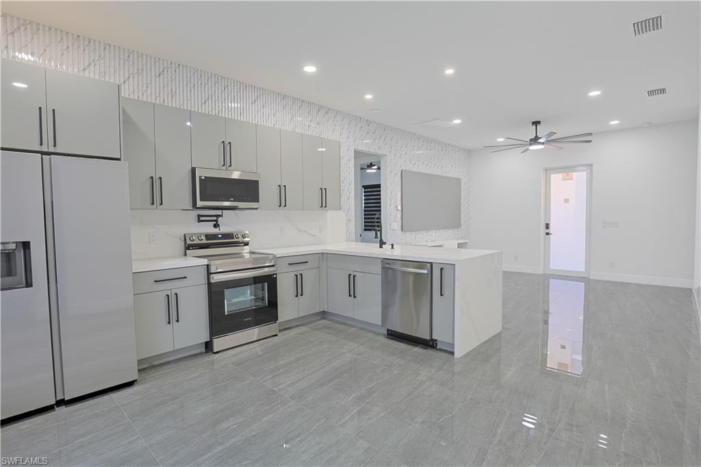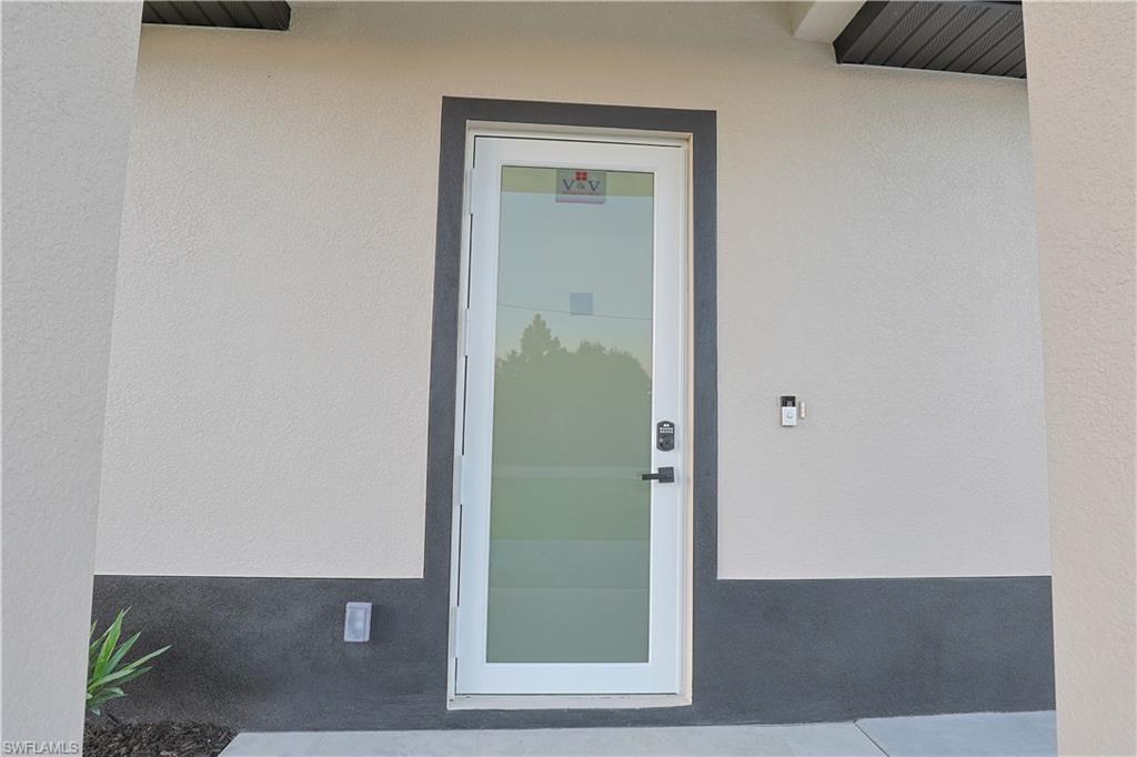 Welcome to your stunning modern luxury home, thoughtfully designed with over 1, 452 square feet of refined living space on a corner oversized lot. Featuring 4 spacious bedrooms and 3 beautifully appointed bathrooms, this home blends comfort, style, and functionality. Built with attention to detail and peace of mind, the property includes hurricane-impact windows and doors for added security and durability. Integrated smart home features include a keyless combination entry system and Ring video doorbell, providing effortless access control and added security at your fingertips. As you step inside to an inviting open-concept layout filled with natural light, high ceilings, and sleek porcelain tile flooring throughout. The heart of the home is a chef-inspired kitchen showcasing upgraded Samsung appliances, custom high-gloss cabinetry, and a breathtaking waterfall quartz countertop that seamlessly extends into the backsplash — delivering both elegance and practicality. A pot filler, soap dispenser and stylish accent wall elevate the space even further. The home is truly move-in ready with custom TV entertainment features, zebra blinds, and thoughtfully designed finishes throughout. The dedicated laundry room includes added cabinetry to maximize storage and organization. Situated on a desirable oversized corner lot in a quiet, family-oriented neighborhood, this property offers both space and privacy. One of the bedrooms provides excellent flexibility, featuring a basin sink, cabinetry, and a private side entry/exit — making it ideal for a mother-in-law suite, guest quarters, or potential rental income opportunity. Conveniently located just minutes from shopping centers, restaurants, and schools, this one-of-a-kind home offers modern luxury living with exceptional versatility. Schedule your private tour today and experience it for yourself!