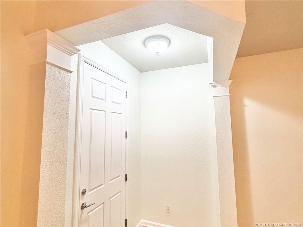 An elegant arched entry adds architectural charm, while the eat-in kitchen features granite countertops, rich wood cabinetry, and generous workspace ideal for daily living and entertaining.