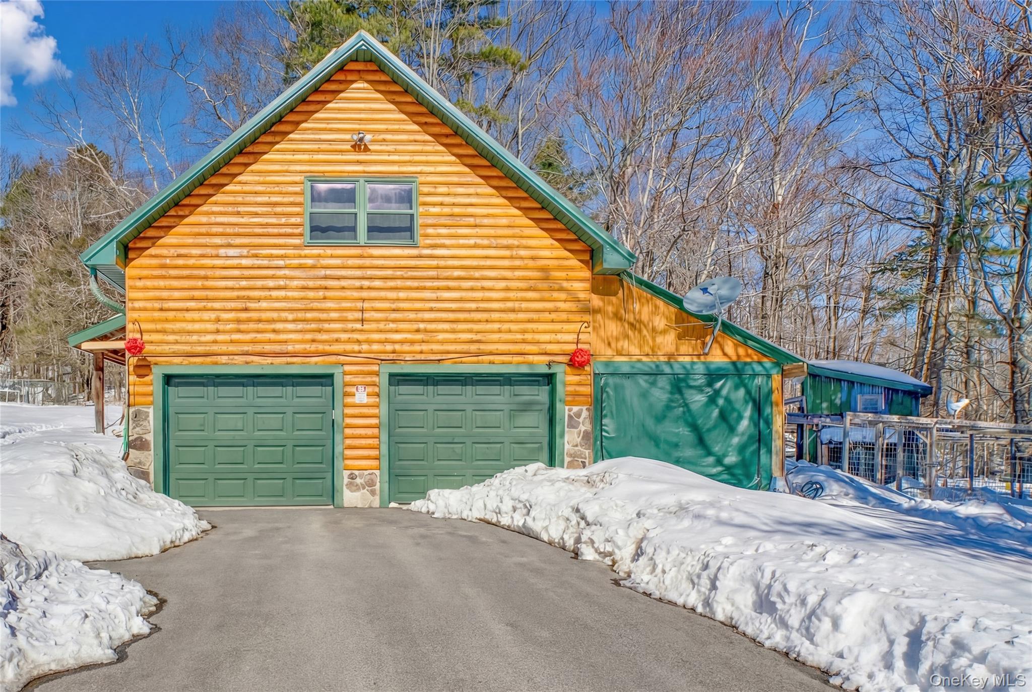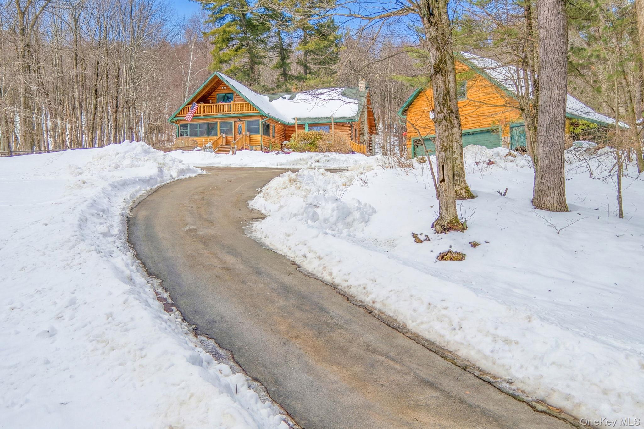 Welcome to 189 Yeagerville Road situated in one of Ulster County's most well kept secret spots in the pristine hill country just north of the Hamlet of Napanoch. This stunning log home on nine acres presents a multitude of possibilities both inside and out. Come up the hill on the well-maintained driveway to see the expansive lawn, surrounding woodlands, home and adjacent, oversized two-car garage with ample space for a workshop and 400 sq. ft. second level loft, perfect for guest overflow, home gym, crafts/hobbies or home office. A third bay with lean- to provides plenty space for equipment, off road vehicles and all manor of outdoor gear. Enter by the steps to the three-season enclosed porch that covers the width of the house. Mature gardens grace the front of the property in growing season. A fully fenced in side yard is perfect for pets and protected garden space. There is ample area for indoor and outdoor entertainment with a large decks to the side in front and on off the back by the above ground pool. An open-concept kitchen/dining area leads to a very large living room in modern log style. There are two bedrooms and a full bath on the main floor as well. The second floor features a loft overlooking the living room, ideal for home office or a variety of uses. Continue to the primary bedroom, full bath and the beautiful full balcony with endless south views. Perfect for morning coffee, afternoon tea or an evening drink. Nestled under the peaked roof this enchanting space provides the perfect place for quiet moments. Acres of woodlands behind the house features numerous trails suitable for walking, hiking or ATV style exploration. A large pellet stove keeps the entire house warm without the use of fossil fuels but a back up system of baseboard oil fired system is in place. 15 minutes down the hill to the charming town of Ellenville with all it offers, including many restaurants, cafes, shops and the prestigious Shadowland Stage regional theater and all services including local farms awaits exploration. This enchanting home awaits its next chapter. Come and see the possibilities of 189 Yeagerville.