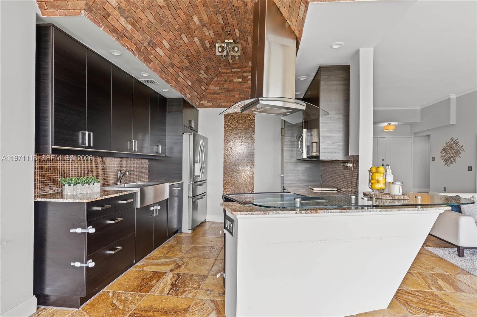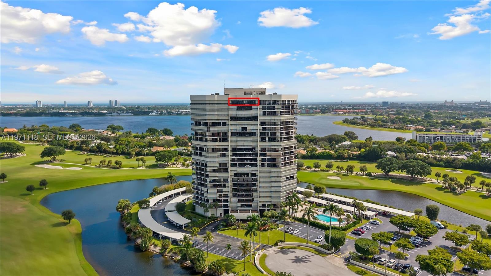 Experience penthouse living with breathtaking golf and city panoramas from a 50-ft balcony. This 2-bed, 2-bath residence spans 1, 557 sq ft and blends architectural drama with modern sophistication. The featured vaulted brick ceiling and natural stone floors create a European-inspired ambiance, complemented by a remodeled kitchen with sleek cabinetry, granite counters, and mosaic accents. Spa-style baths showcase designer tile work and custom finishes, while motorized blinds add comfort and convenience. An assigned storage room on the same floor provides useful utility. The Consulate, a full-service tower within The Lands of the President, offers 24-hr security, pool and spa, fitness center, tennis, social room, and more. One assigned covered parking spot and plenty of guest spaces.
