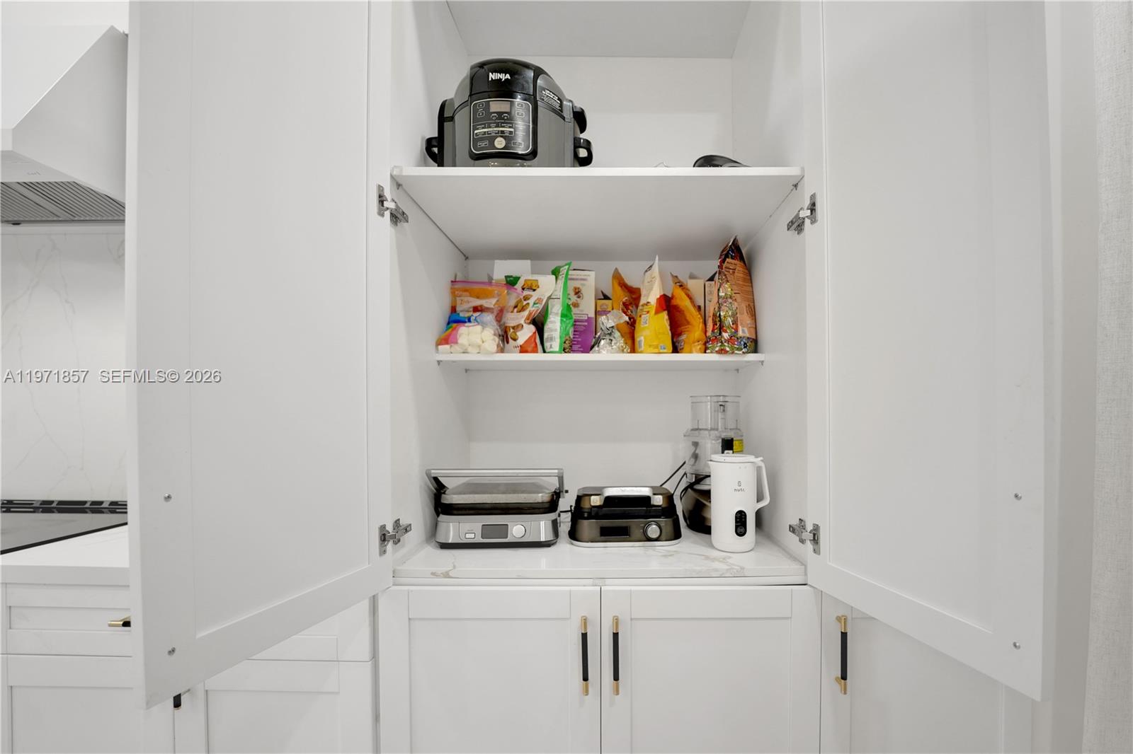 The stunning chef’s kitchen showcases white shaker cabinetry, quartz countertops, custom backsplash, oversized island, and upgraded appliances—perfect for entertaining. Light wood flooring flows throughout, complementing the high ceilings and clean contemporary finishes. The spacious primary suite offers a private bath and ample closet space, while the additional bedrooms are generously sized.