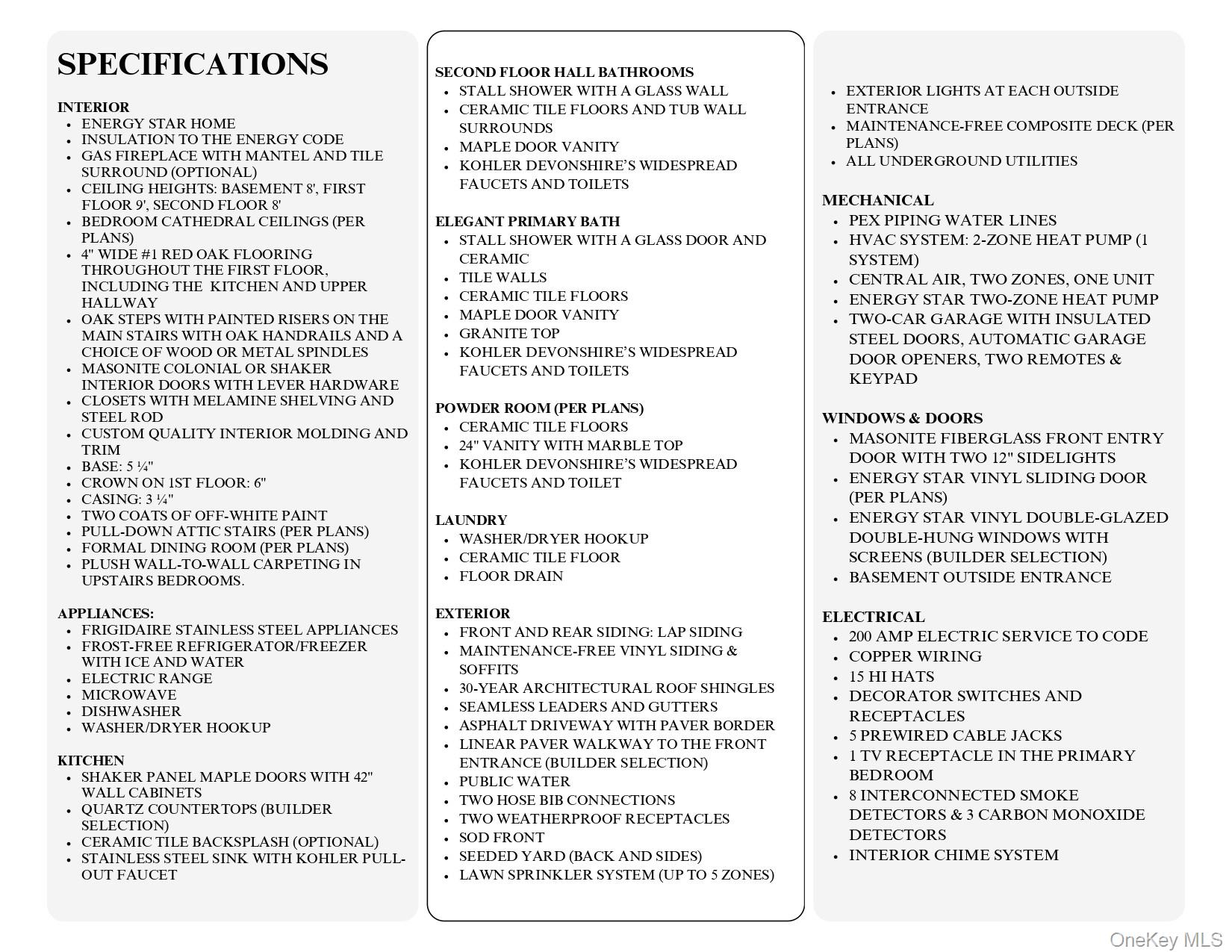 To be built. 2, 400 Sq Ft Energy Star 2-Story Home on a 9, 700 Sq Ft Lot in Holbrook. Featuring 4 Bedrooms, 2. 5 Baths, 9’ Ceilings on First Floor, 4” Red Oak Flooring, Custom Moldings, and a Formal Dining Room. Designer Kitchen with 42” Shaker Cabinets, Quartz Countertops, Stainless Steel Appliances, and Kohler Fixtures. Elegant Primary Suite with Glass-Enclosed Shower and Granite Vanity. Two-Zone Heat Pump with Central Air, 200 Amp Electric, 2-Car Garage, Sprinkler System, and Maintenance-Free Exterior. Buyer to Pay Transfer Tax, Survey, Sewer Connection, Gas Connection, Water Tap Fee. Convenient to LIRR, Major Highways, and Shopping.
