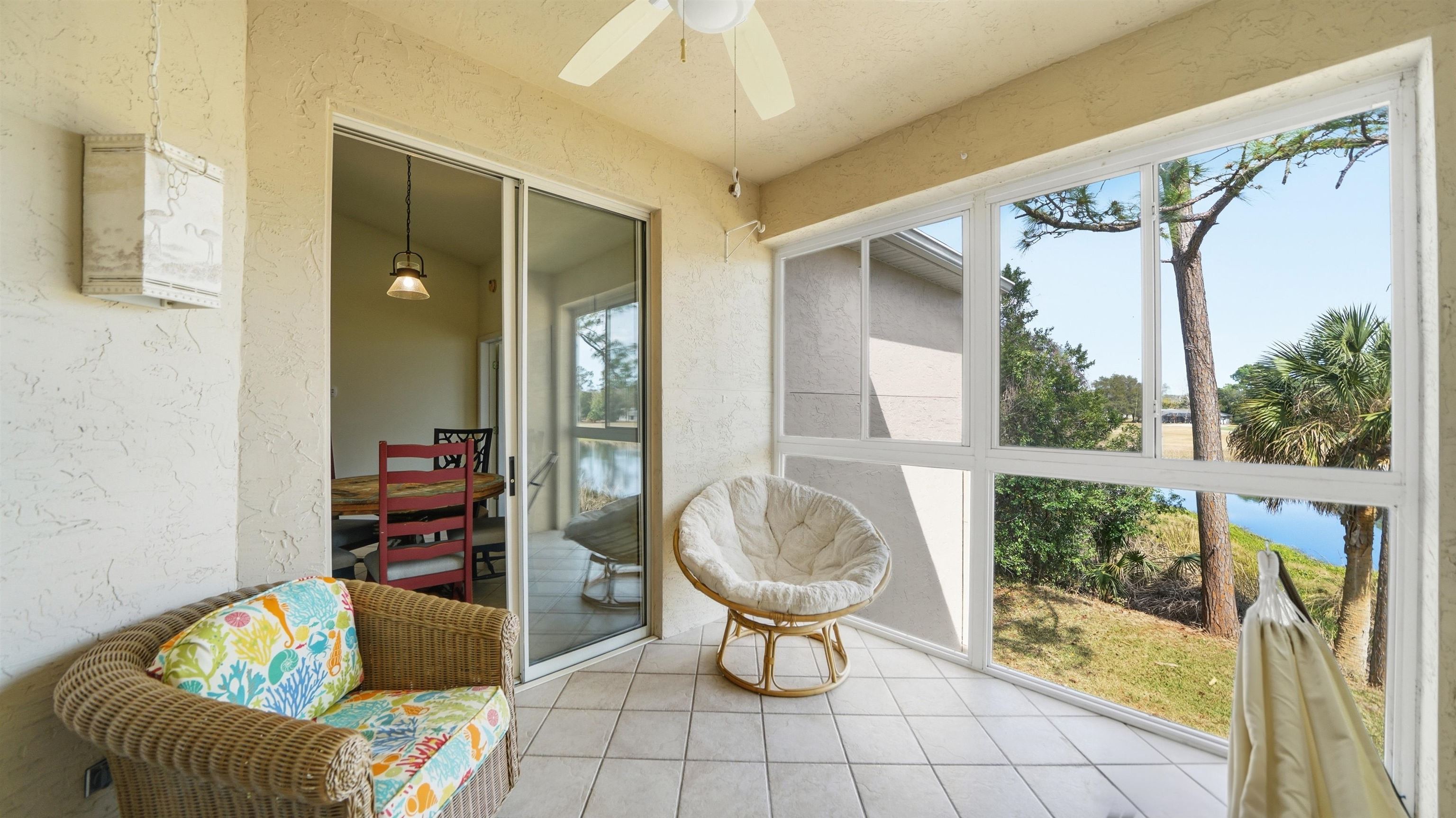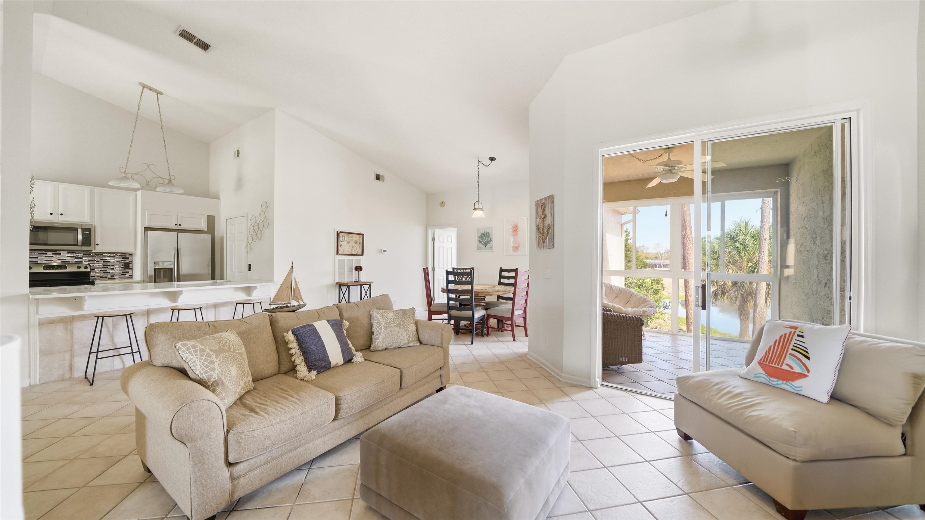 Updated and move-in ready, this beautifully refreshed second-floor condo offers stunning lake and golf course views in a prime St. Augustine Shores location. Soaring cathedral ceilings and a spacious split floor plan create an open, airy layout ideal for everyday living. Recent upgrades include new bathroom vanities and fixtures, brand-new kitchen appliances, granite countertops, fresh neutral interior paint, and no carpet, with tile and LVP flooring throughout. The enclosed lanai provides flexible living space, perfect for enjoying the scenery year-round with windows and air conditioning. A private exterior storage closet just outside the unit is ideal for beach gear, pool items, or golf clubs. Located in The Greens at St. Augustine Shores, residents enjoy access to a pool, hot tub, tennis courts, fishing dock, playgrounds, walking trails, and parks. The community is known for its peaceful setting, scenic landscapes, and miles of paved walking and biking paths. Conveniently situated just 15 minutes from Historic Downtown St. Augustine, 10 minutes to I-95, the beach, and medical facilities, and 5 minutes to schools, grocery stores, and restaurants. Golf course access is just steps away. Monthly condo dues include water, sewer, trash, basic cable, exterior maintenance, pest control, and the master insurance policy. All information pertaining to the property is deemed reliable, but not guaranteed. Information to be verified by the Buyer. Be advised that cameras may exist recording audio and video inside/outside the property, such as ring doorbells. Photos are digitally enhanced and could be altered, please verify.