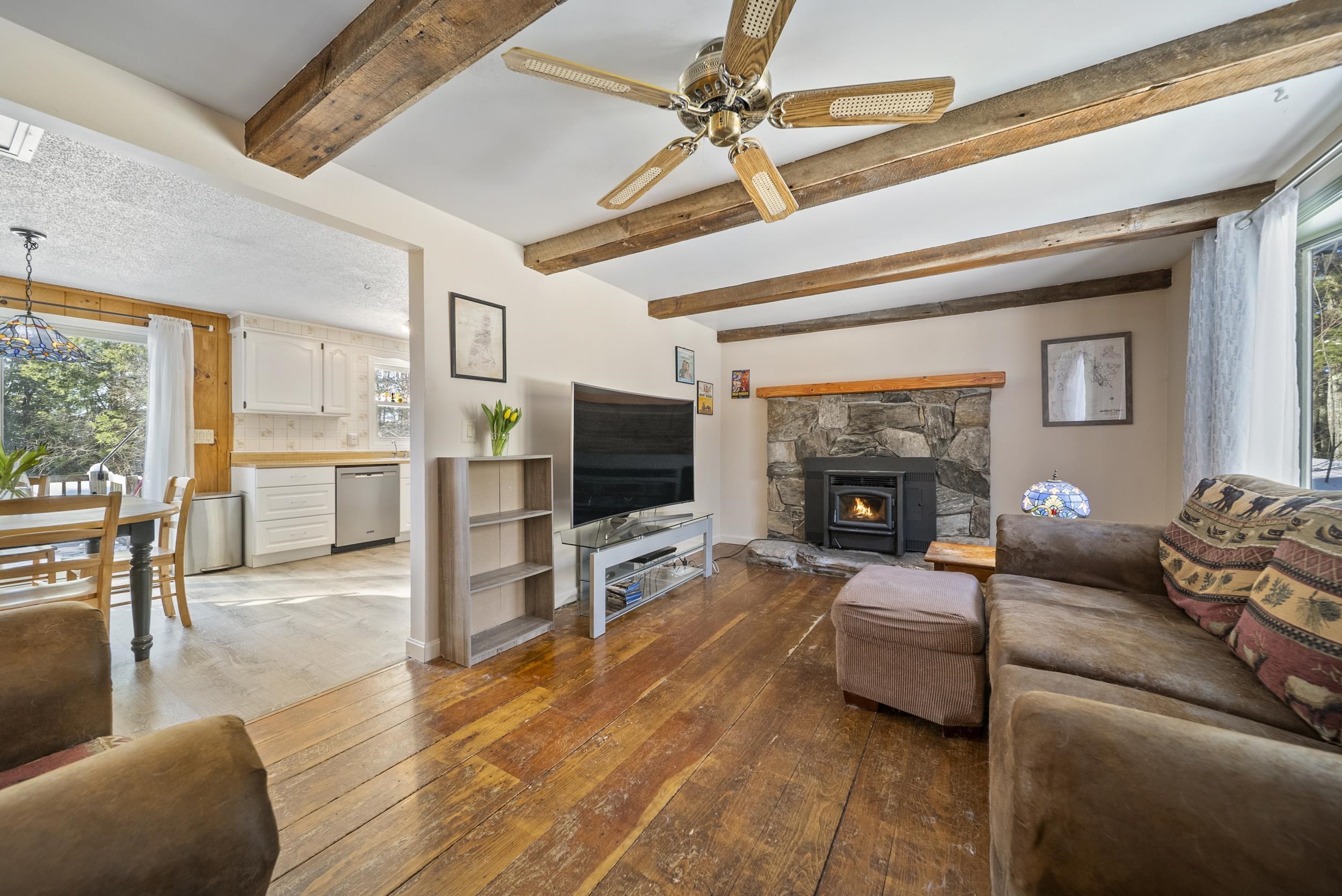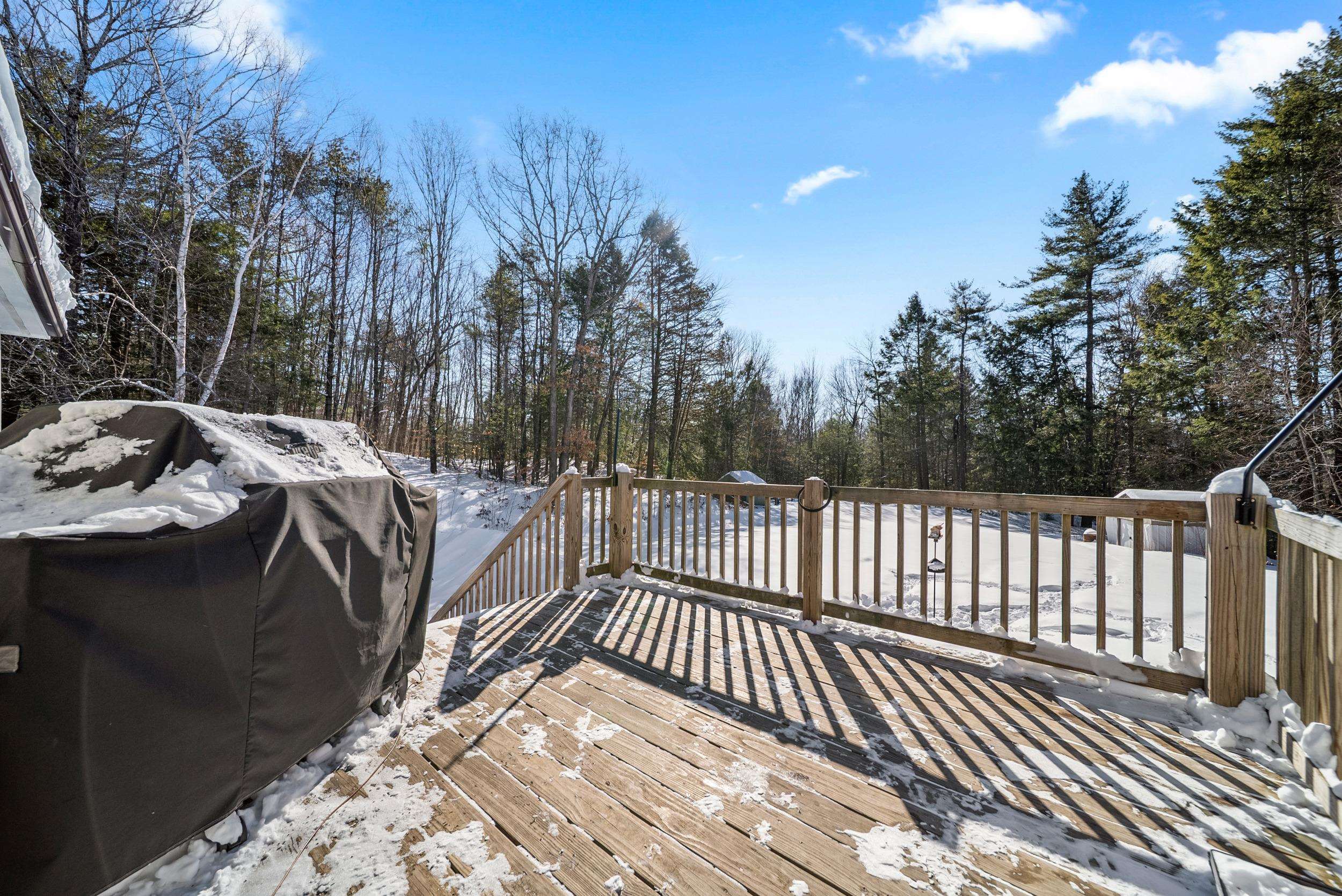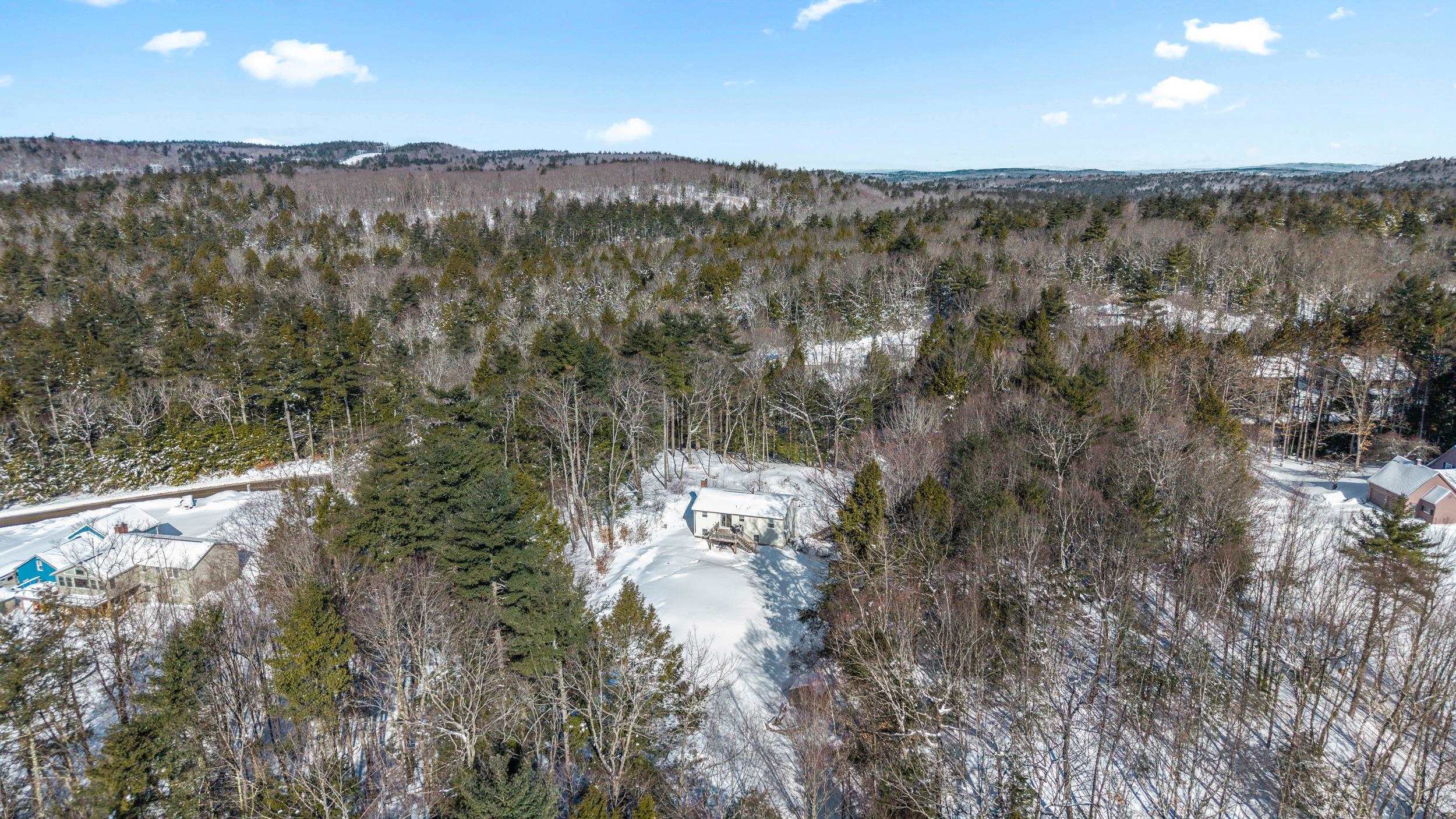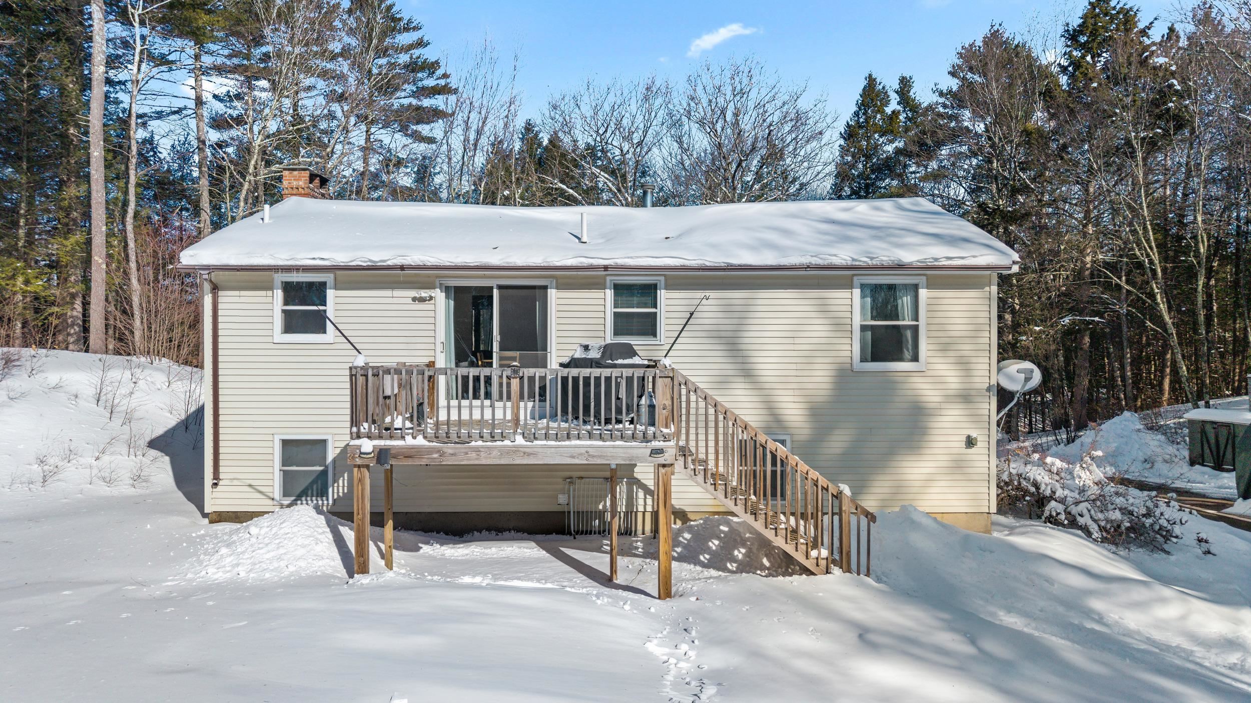 Set along a scenic country backroad in the heart of Dunbarton, this private retreat offers the space, serenity, and natural surroundings buyers crave. Nestled on over 7 acres of wooded land and abutting conservation land, this well-maintained 2-bedroom, 1-bath home delivers exceptional privacy in one of southern New Hampshire’s most sought-after towns. The main level features a sun-filled living room with wide pine floors, anchored by a cozy pellet stove—perfect for efficient, comfortable warmth during New England winters. The bright eat-in kitchen opens to a deck overlooking the expansive backyard, where you can enjoy peaceful views of the woods and frequent sightings of local wildlife, including deer and wild turkeys. Two comfortable bedrooms and a full bath complete the upper level, while the partially finished lower level provides flexible living space ideal for a home office, guest area, gym, or hobby rooms, along with laundry, workshop space, and generous storage. Notable features include a Kinetico water treatment system and reverse osmosis, whole-house fan, laundry chute, and oversized hot water tank. Surrounded by nature yet conveniently located for access to Concord, commuter routes, and nearby amenities, this property offers a rare combination of scenic backroad living, conservation frontage, and everyday functionality. A special opportunity to enjoy acreage, privacy, and the quiet beauty of Dunbarton, NH.