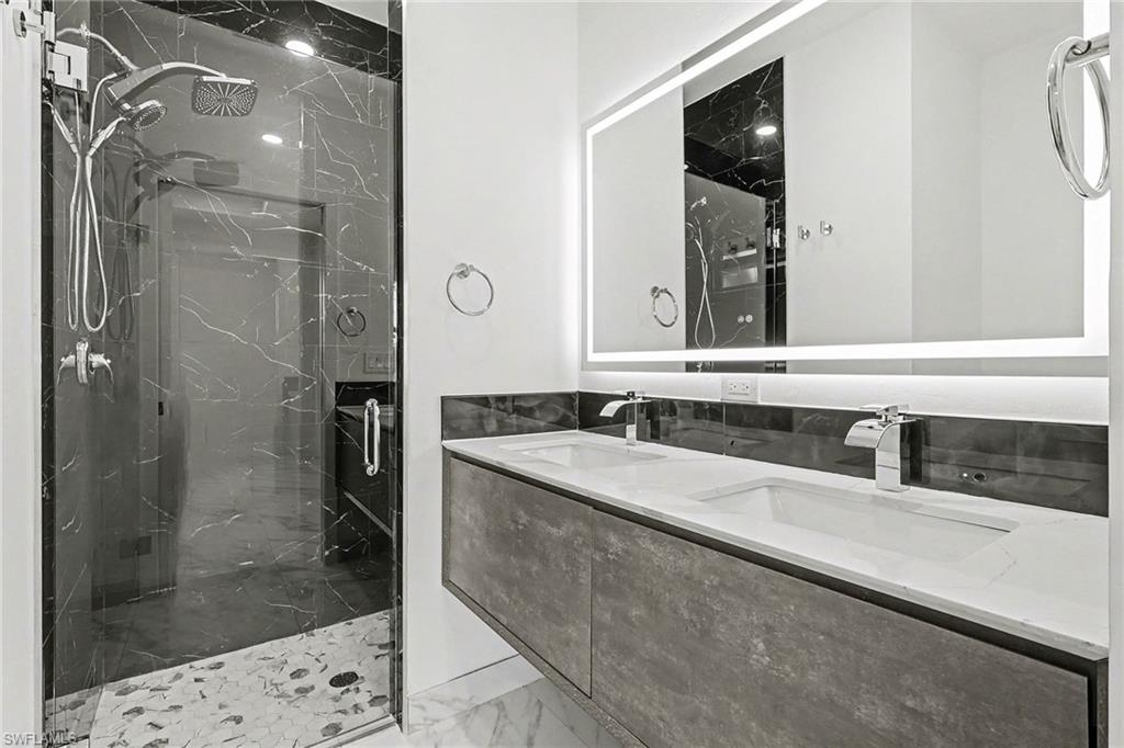 Bathrooms feature LED mirrors, floating vanities, and glass-enclosed rainfall showers — the type of finishes today’s buyers actively seek.