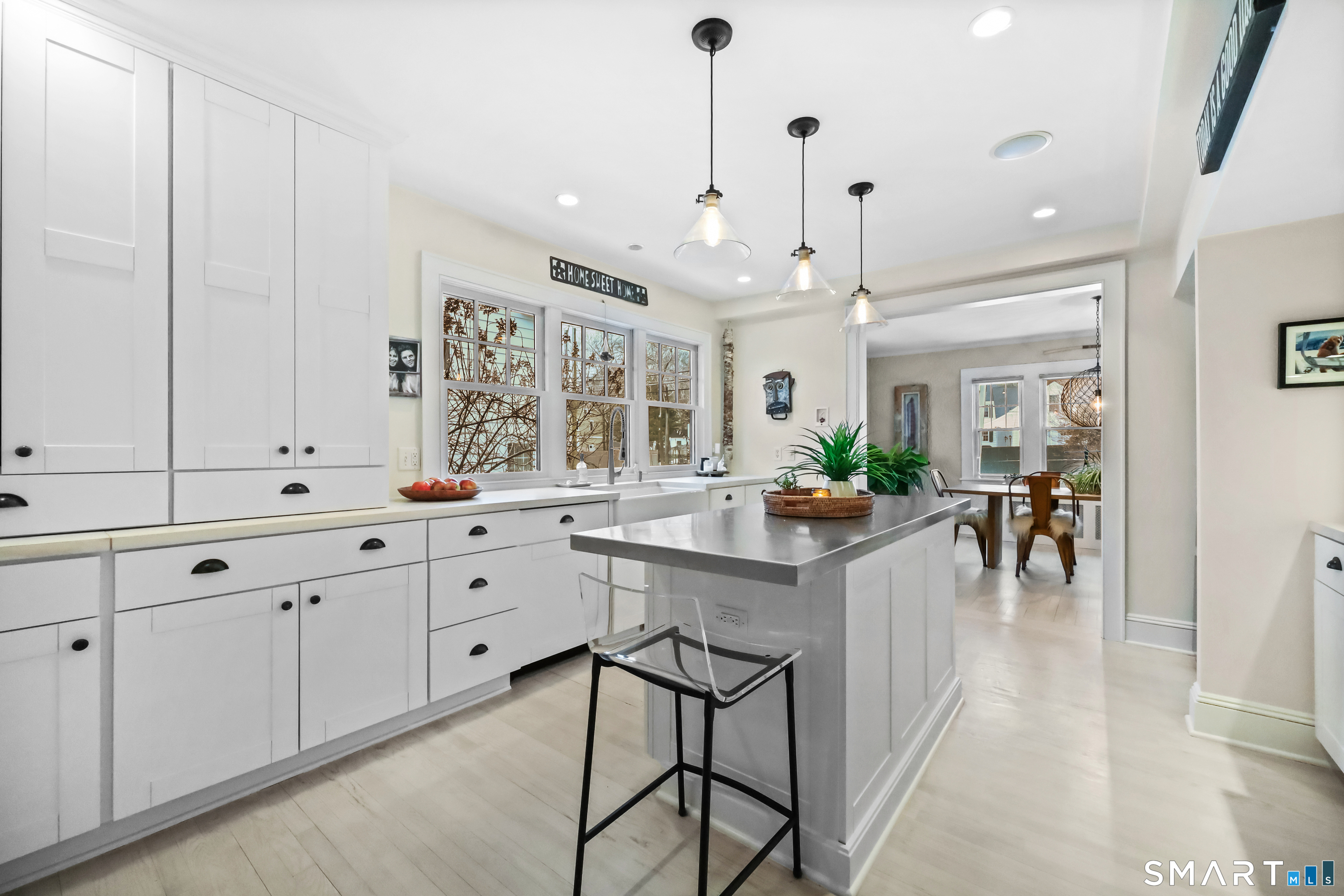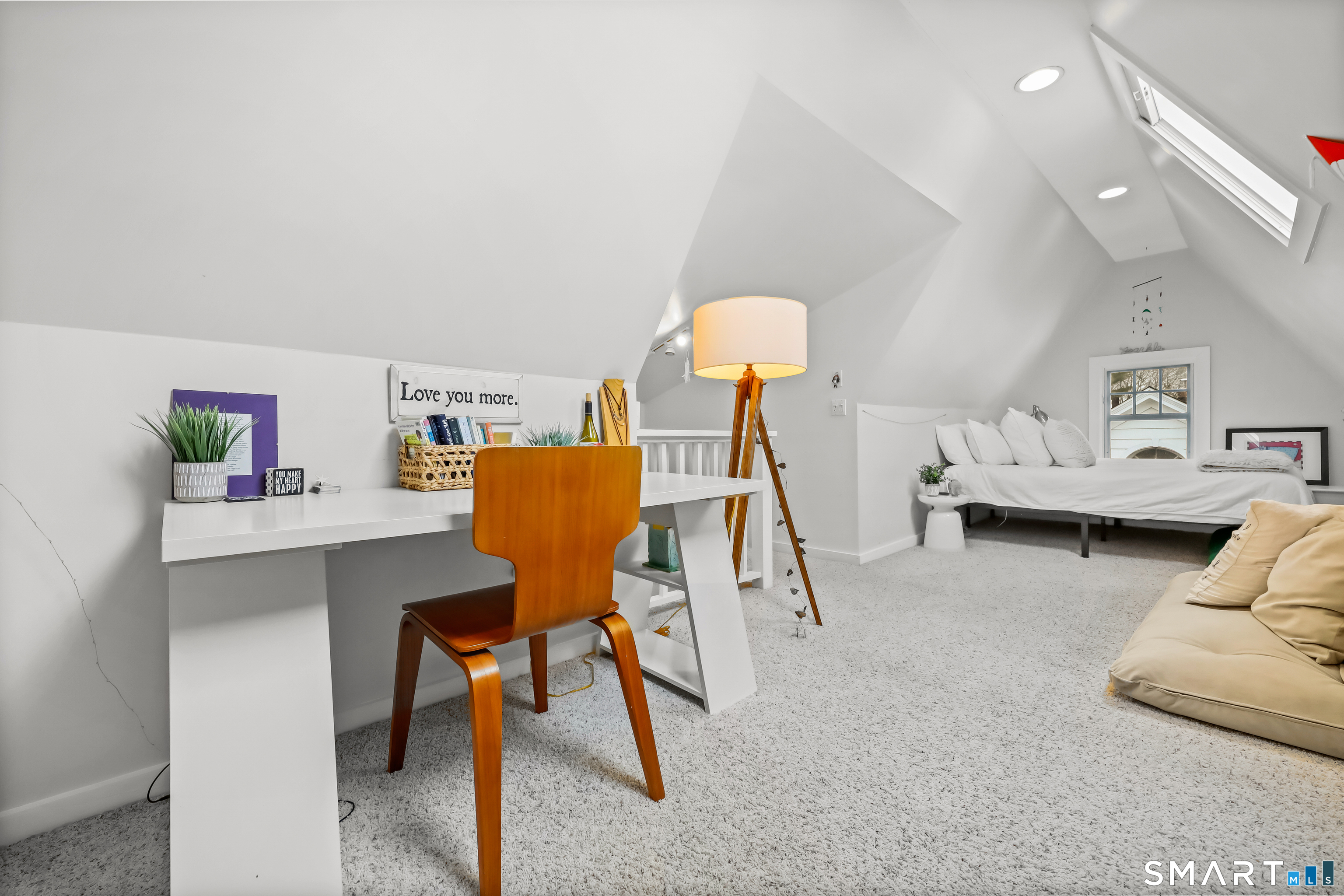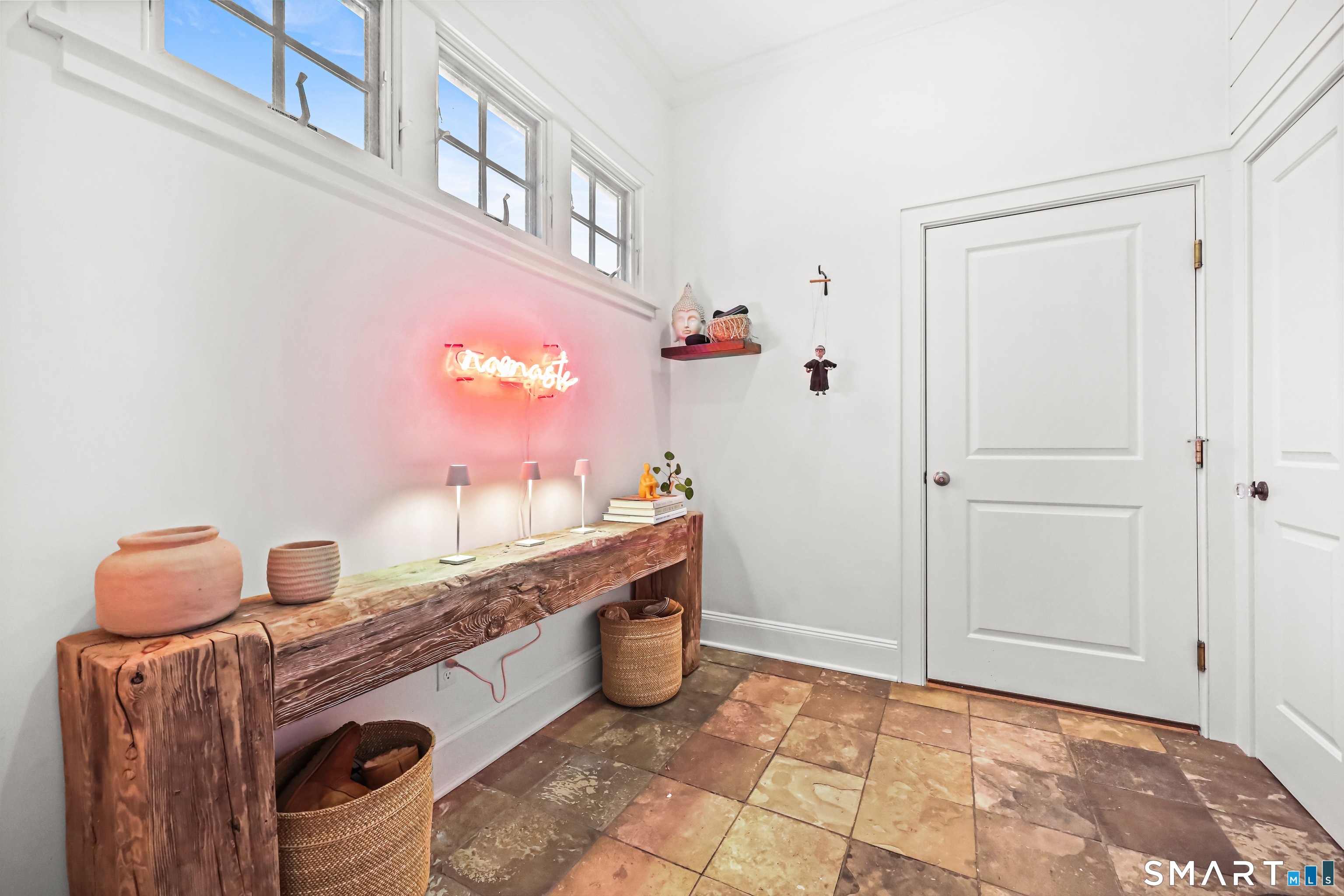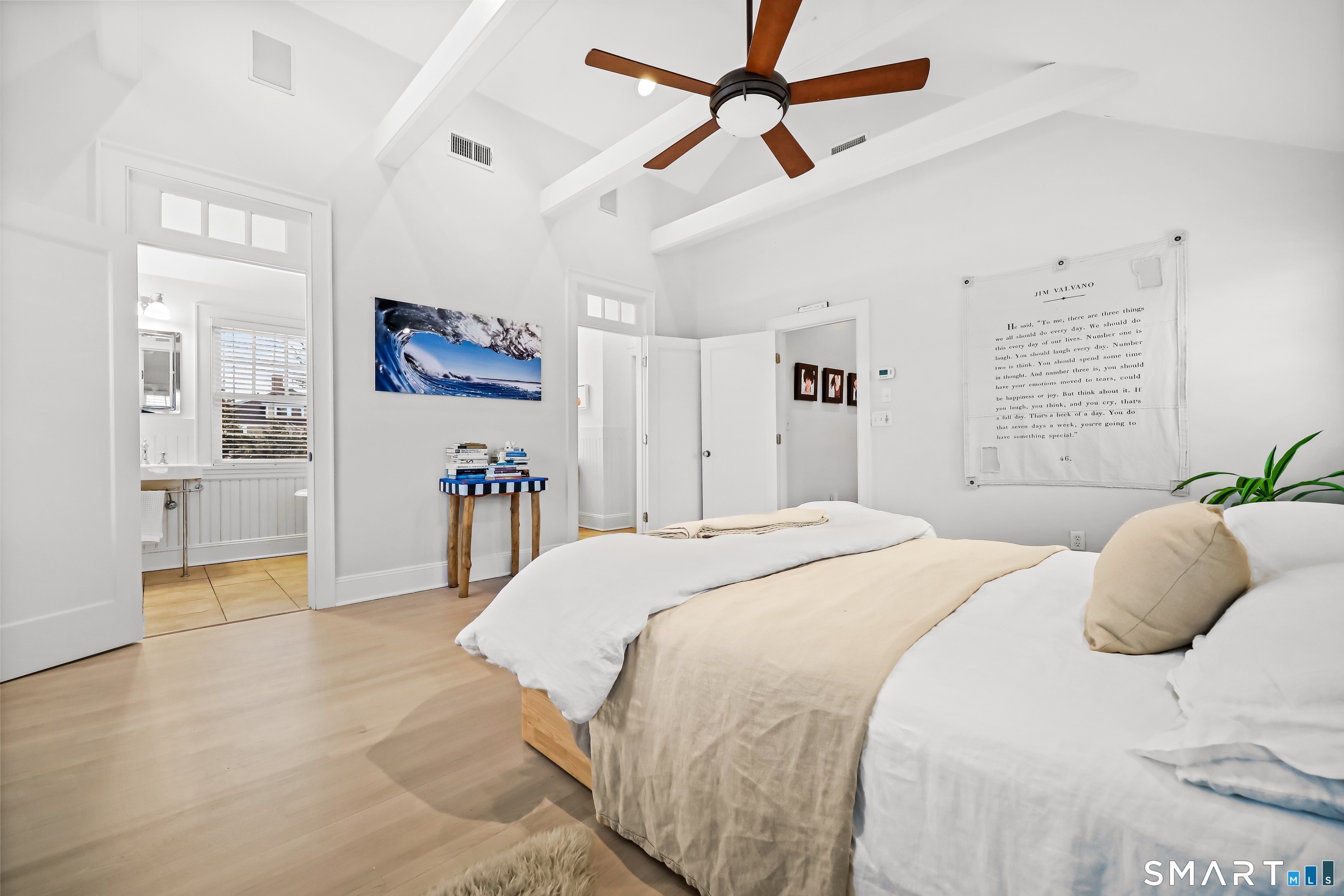 Nestled in Fairfield's highly sought-after University neighborhood, this exceptional home beautifully blends timeless vintage charm with a warm, modern aesthetic. Set on a private, arborvitae-lined property, the outdoor space features a stone patio and gas fire rock seating area. Inside, the inviting layout offers effortless flow and abundant natural light. The living room, anchored by a wood-burning fireplace and French doors to the patio, opens seamlessly to the dining room and sunny kitchen. The custom kitchen connects to a family room with soaring 10-foot ceilings & roaring stone fireplace. Spacious primary bedroom with vaulted ceilings, beams, bath with glass shower, soaking tub & walk-in closet is a lovely oasis. Guest room with ensuite bath & walk-in closet plus 2 additional bedrooms complete the 2nd level. 3rd level bonus area offers flexible space with 5th bedroom. The finished lower level provides versatility and extra living space. Additional amenities include, study, mudroom, 2 laundry rooms, irrigation system, 2 car garage and much more. Ideally located just minutes from vibrant Fairfield town center and train (1 mi), Beach (1. 3 mi), Marina (1. 1 mi), Tennis & golf. Waterfront community offering historic charm, dining, shopping, arts & 2 universities, just 50 miles from NYC.