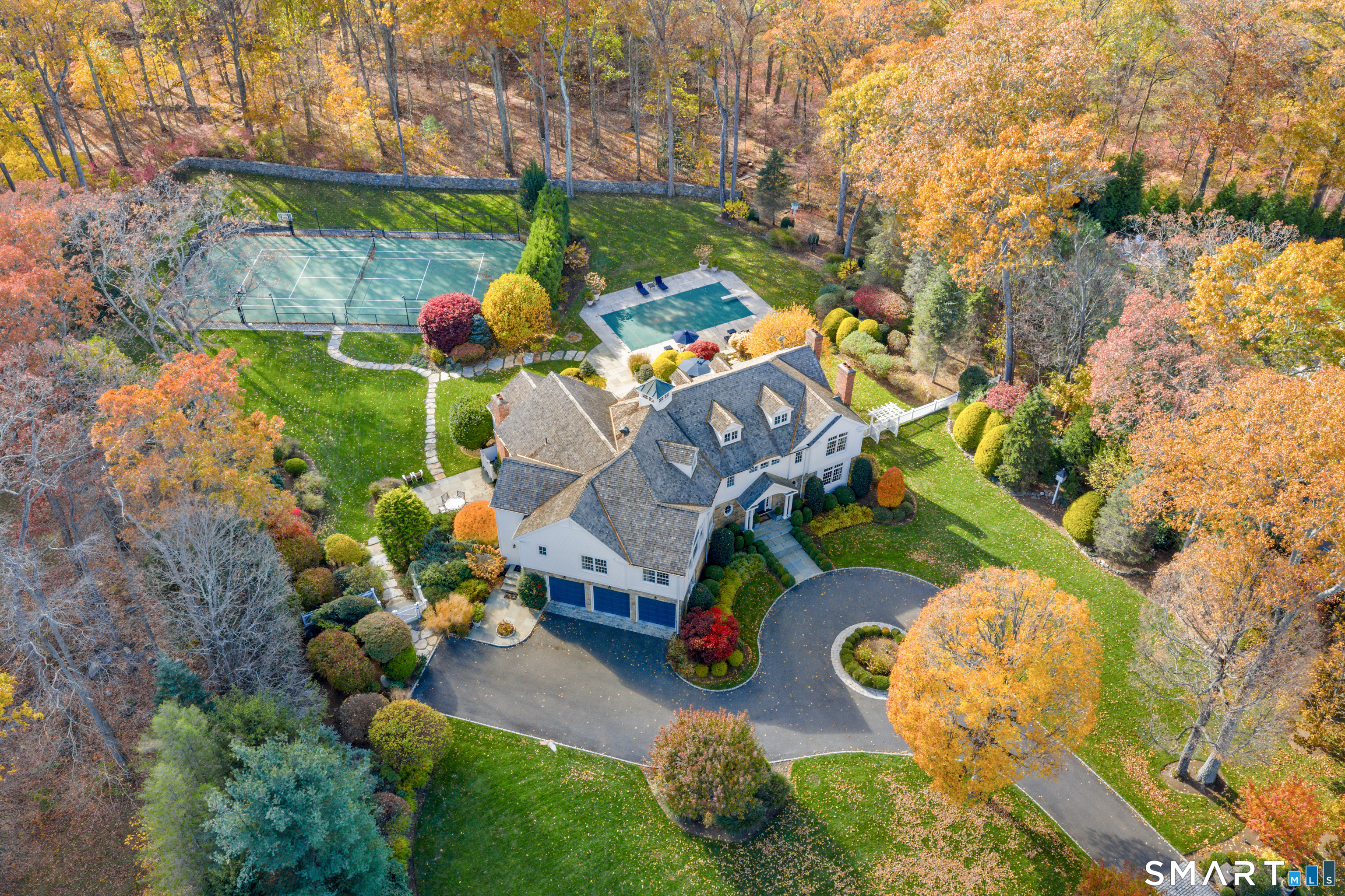 Your Private Five-Star Resort in New Canaan: Experience the pinnacle of luxury at this 2-acre custom estate, where "vacationing at home" is your daily reality. Tucked behind commanding stone columns near the vibrant town center, this park-like sanctuary is framed by gorgeous stone walls and lush, professional landscaping and sited on a quiet cul-de-sac. The sun filled open-concept interior boasts 9'+ and vaulted ceilings, extensive millwork and gleaming hardwood floors, anchored by four fireplaces that radiate warmth and sophistication. At the heart of the home lies a breathtaking chef's kitchen featuring a legendary island with enough room for a large gathering and a dreamy walk-in pantry. The formal living room with gas fireplace and formal dining room with butler's pantry offer an easy flow for entertaining. With 5 bedrooms, 6. 5 baths, a stately library and two additional offices, there is unparalleled space for both high-stakes productivity and total relaxation. The lifestyle continues outdoors with a sparkling pool and a private sports/tennis/pickleball court designed for endless summer afternoons. Whether hosting a grand gala or retreating to your private oasis, this property offers a seamless blend of modern elegance with New England charm.