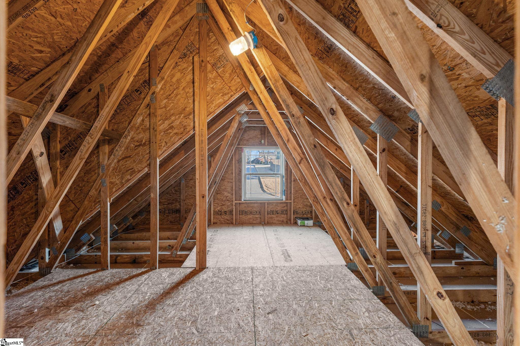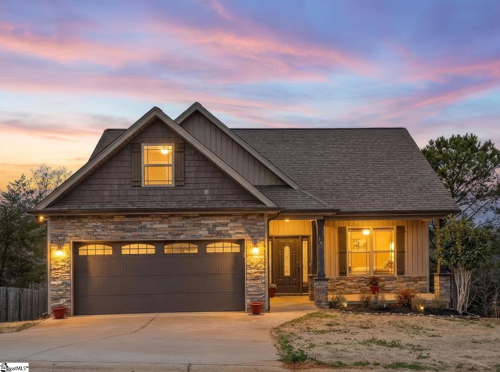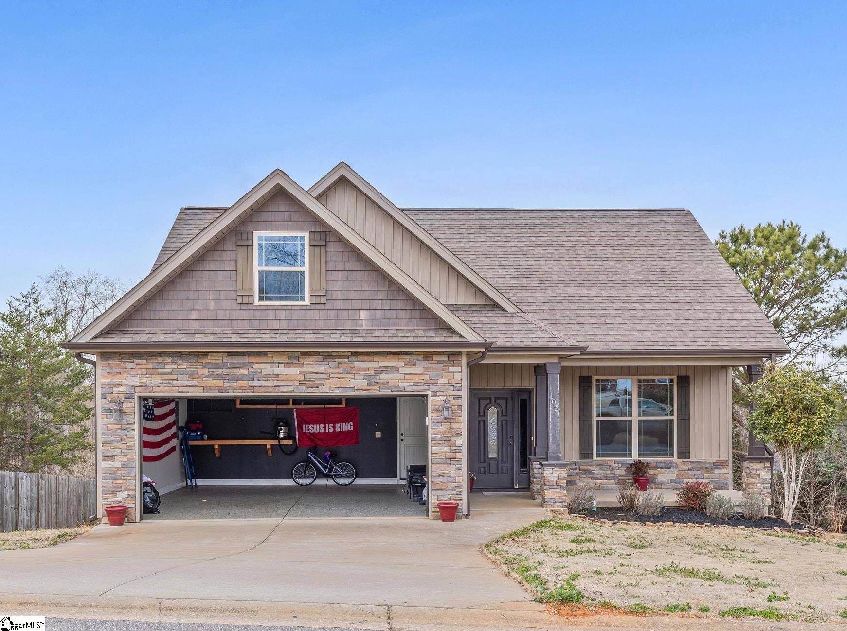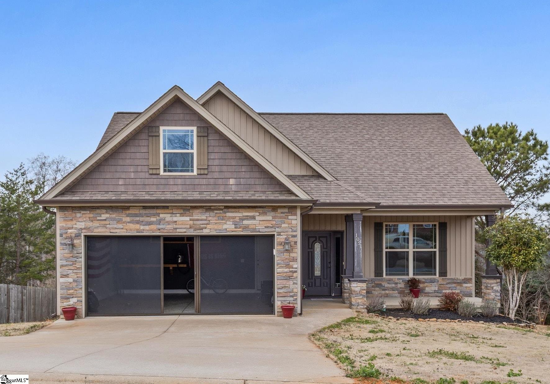 Designed for easy living, this home features no-step entry and a main-level primary suite. Attractive stone accents create great curb appeal, while the yard stays simple with just one mulched bed with fragrant lavender for low-maintenance landscaping. The two-car garage includes epoxy floors and a pull-down screened door, perfect for space for parking, projects, or enjoying fresh air without the bugs. Stepping inside, you'll find a bright, open floor plan featuring gorgeous wood floors that flow seamlessly from the living room to the kitchen, dining, and into the primary bedroom, creating a warm feel throughout the main level. The inviting living room showcases a stunning stacked-stone fireplace, while the kitchen impresses with rich-looking cabinetry, uniquely gorgeous granite countertops, ample storage, and a center island — perfect for gathering, prep work, and entertaining. Throughout the home, you will appreciate all the extra touches from elegant wood molding to custom blinds that elevate the overall craftsmanship and character. The primary suite on the main level feels like a true retreat, complete with a beautiful wood trim accent wall, tray ceiling with accent lighting, spa-like soaking tub, separate walk-in shower, double sink vanity with granite countertops, and a walk-in closet with custom organization shelving and dedicated vanity space. A private door leads directly from the primary bedroom to the back deck, creating a peaceful escape to enjoy morning coffee or unwind in the evenings. Upstairs, you’ll find two spacious bedrooms, a full bathroom, plus additional unfinished attic space with a window -- offering exceptional storage potential or maybe even future expansion to offer a dual owners suite, ensuite office or other additional sqft. Outdoor living shines with a spacious covered front porch, leaded glass front door, and an awesome back deck featuring roll-down privacy/shade screens overlooking the tree-lined, fenced backyard creating perfect spaces for gathering, relaxing, and enjoying the outdoors year-round. Below, a walk-in crawlspace accessible through double doors provides storage that feels almost like having a basement. And the garage? Truly next-level — boasting magnificent epoxy floors and sliding screen doors, making it the perfect space for hobbies, a home gym, workshop, or ultimate hangout zone. All of this plus beautiful stacked-stone curb appeal, a private wooded backdrop, and access to a fantastic community with pool and playground — this home offers an ideal blend of comfort, convenience, and craftsmanship, and is ready to impress from the moment you arrive. Great for multigenerational living! Less than 5 miles from I-85. Less than 10 miles from BMW. Less than 10 miles from downtown Spartanburg. 14 miles from GSP Airport.