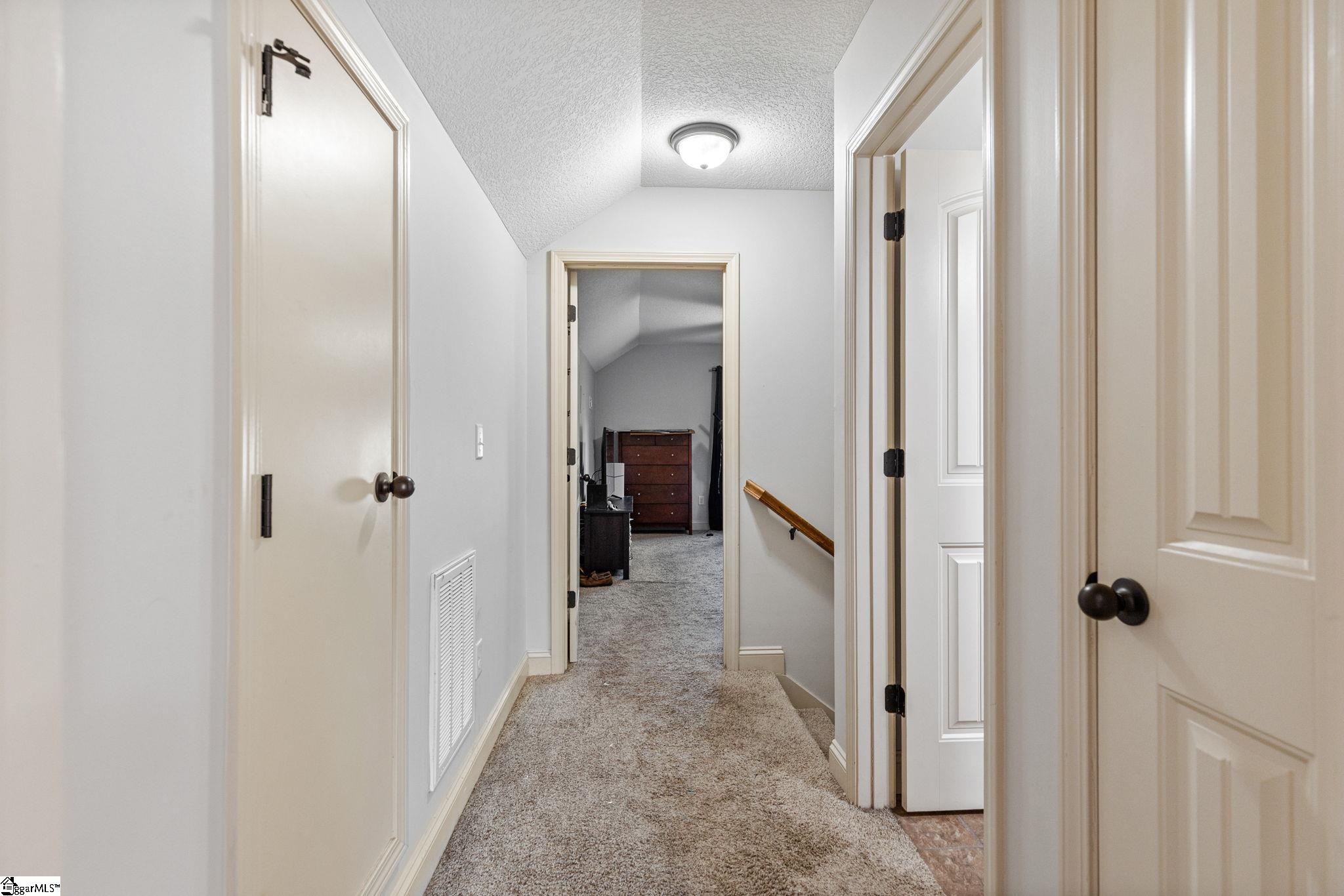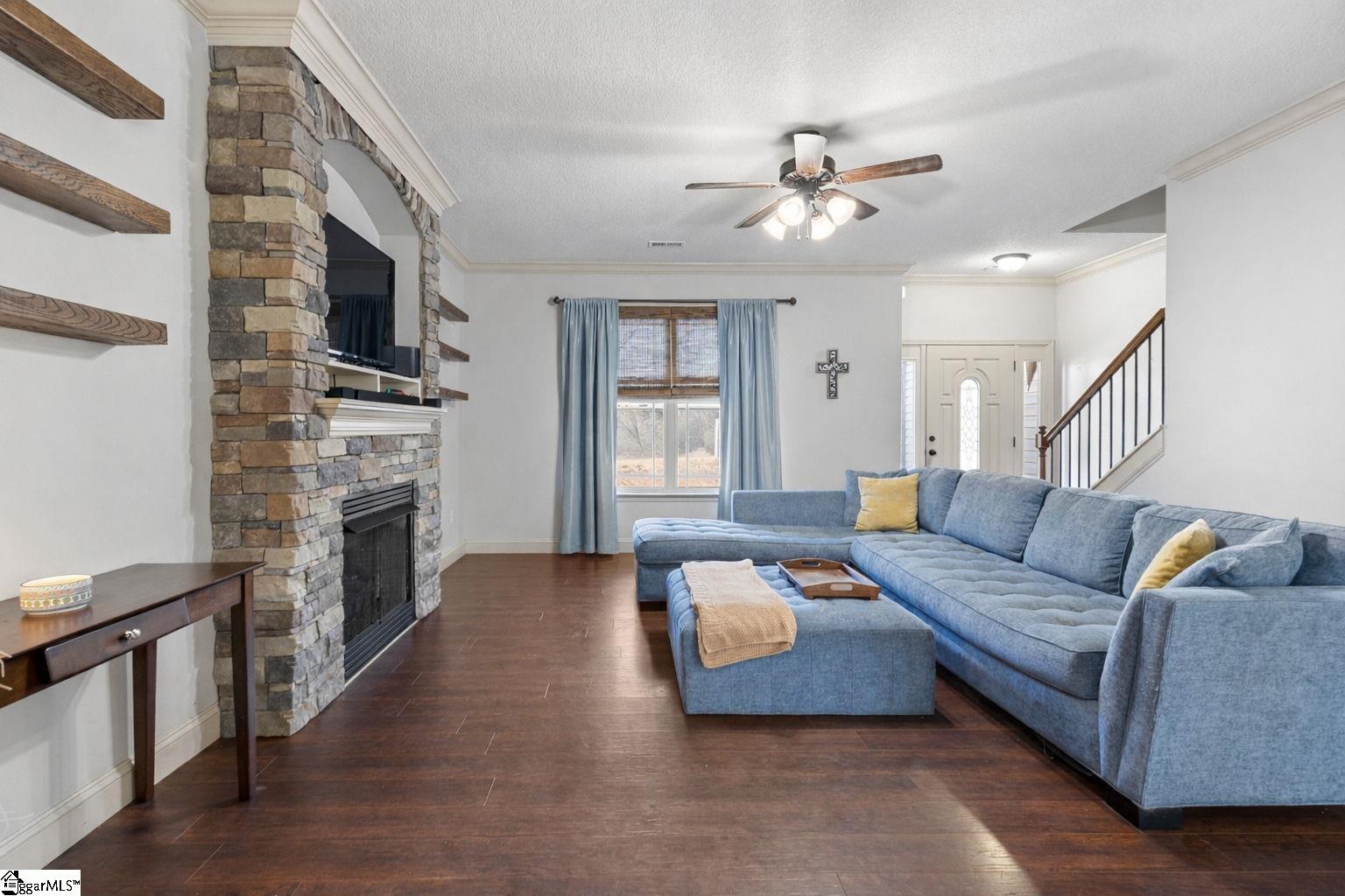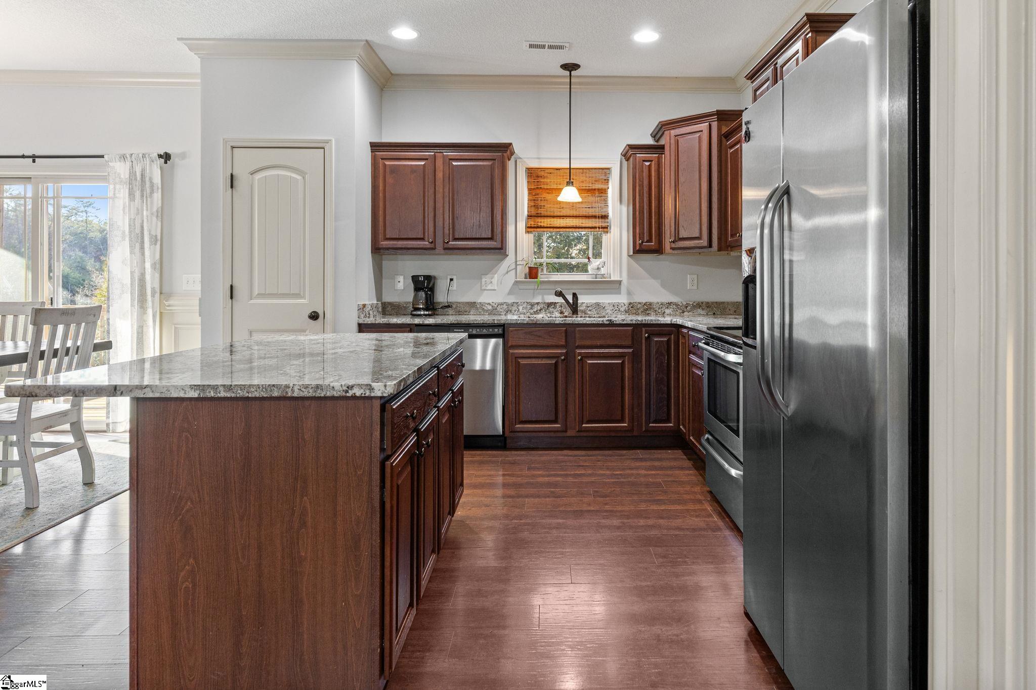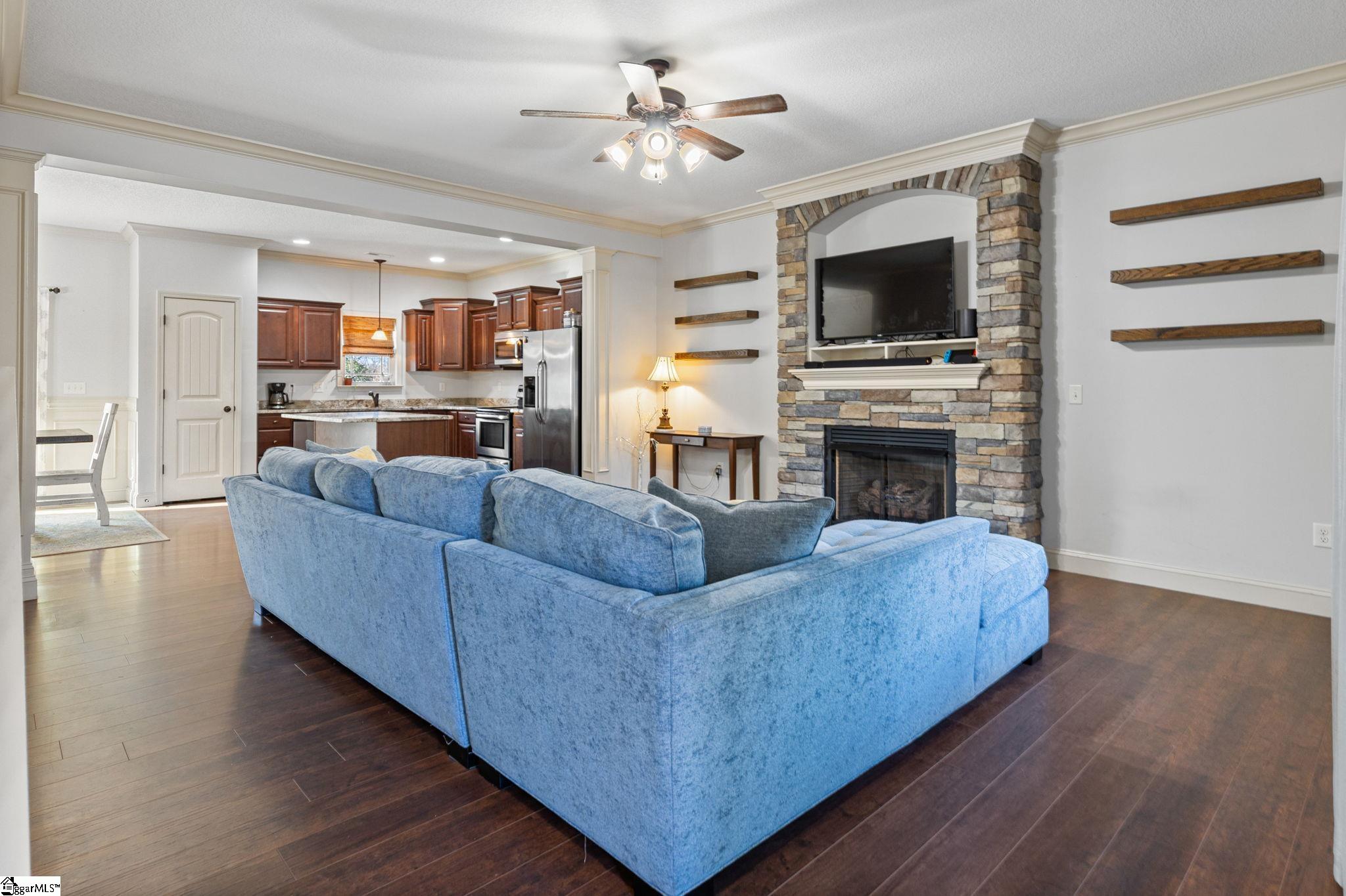 Designed for easy living, this home features no-step entry and a main-level primary suite. Attractive stone accents create great curb appeal, while the yard stays simple with just one mulched bed with fragrant lavender for low-maintenance landscaping. The two-car garage includes epoxy floors and a pull-down screened door, perfect for space for parking, projects, or enjoying fresh air without the bugs. Stepping inside, you'll find a bright, open floor plan featuring gorgeous wood floors that flow seamlessly from the living room to the kitchen, dining, and into the primary bedroom, creating a warm feel throughout the main level. The inviting living room showcases a stunning stacked-stone fireplace, while the kitchen impresses with rich-looking cabinetry, uniquely gorgeous granite countertops, ample storage, and a center island — perfect for gathering, prep work, and entertaining. Throughout the home, you will appreciate all the extra touches from elegant wood molding to custom blinds that elevate the overall craftsmanship and character. The primary suite on the main level feels like a true retreat, complete with a beautiful wood trim accent wall, tray ceiling with accent lighting, spa-like soaking tub, separate walk-in shower, double sink vanity with granite countertops, and a walk-in closet with custom organization shelving and dedicated vanity space. A private door leads directly from the primary bedroom to the back deck, creating a peaceful escape to enjoy morning coffee or unwind in the evenings. Upstairs, you’ll find two spacious bedrooms, a full bathroom, plus additional unfinished attic space with a window -- offering exceptional storage potential or maybe even future expansion to offer a dual owners suite, ensuite office or other additional sqft. Outdoor living shines with a spacious covered front porch, leaded glass front door, and an awesome back deck featuring roll-down privacy/shade screens overlooking the tree-lined, fenced backyard creating perfect spaces for gathering, relaxing, and enjoying the outdoors year-round. Below, a walk-in crawlspace accessible through double doors provides storage that feels almost like having a basement. And the garage? Truly next-level — boasting magnificent epoxy floors and sliding screen doors, making it the perfect space for hobbies, a home gym, workshop, or ultimate hangout zone. All of this plus beautiful stacked-stone curb appeal, a private wooded backdrop, and access to a fantastic community with pool and playground — this home offers an ideal blend of comfort, convenience, and craftsmanship, and is ready to impress from the moment you arrive. Great for multigenerational living! Less than 5 miles from I-85. Less than 10 miles from BMW. Less than 10 miles from downtown Spartanburg. 14 miles from GSP Airport.