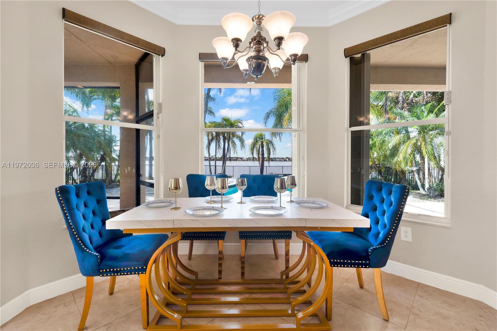 Breathtaking sunset views from your resort style backyard. Beautiful 5-bedroom, 3-bath waterfront residence showcasing abundant natural light, an open-concept design, and sweeping panoramic water views. A separate first-floor bedroom plus office provides excellent flexibility—ideal for guests, extended family, or in-law quarters with its own separate entrance. The expansive primary suite features a comfortable sitting area and a spa-style bathroom complete with Jacuzzi tub, freestanding shower, dual vanities, and custom-designed closets. An open kitchen with breakfast nook connects seamlessly to the spacious family room, complemented by formal living and dining areas—perfect for entertaining and everyday living. Volume ceilings enhance the airy feel. Accordion shutters throughout, heated pool via solar panels for improved energy efficiency. Enjoy peaceful waterfront living every day. Community amenities include a resort-style pool, tennis courts, and clubhouse. Rented furnished or unfurnished.