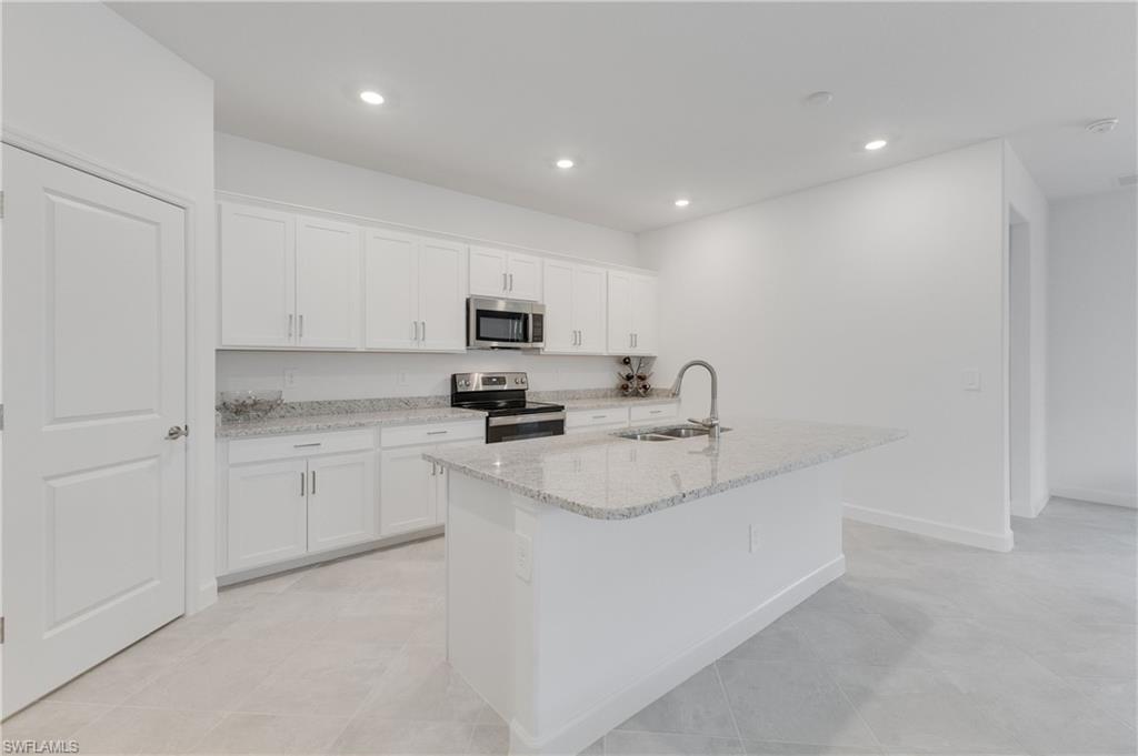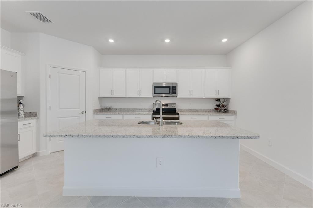 The split-bedroom floorplan provides individual privacy, while the open-concept living room, dining area, and kitchen create a seamless central gathering space, ideal for both everyday living and entertaining. The well-appointed kitchen features abundant cabinetry, a walk-in pantry, stainless steel appliances, stunning stone countertops, and a generous island with breakfast bar seating. Beautiful, neutral tile runs throughout the home, adding both style and durability with timeless appeal.