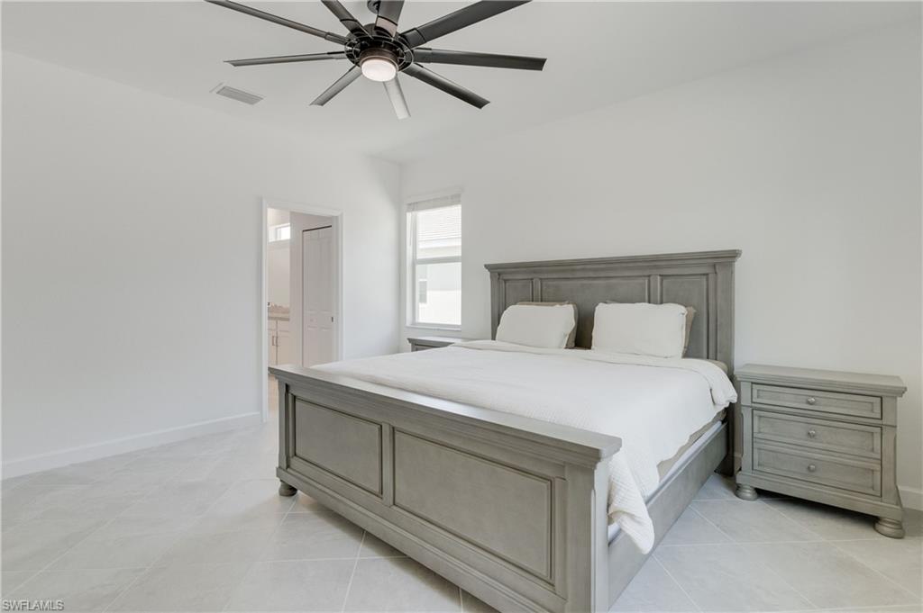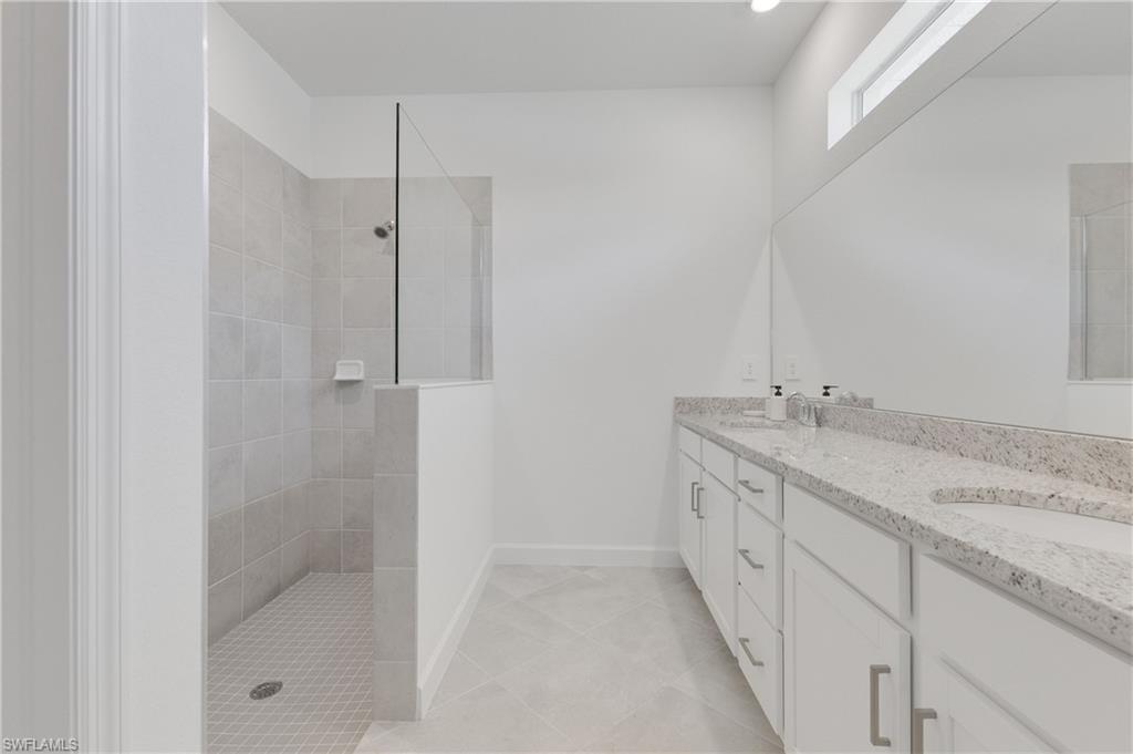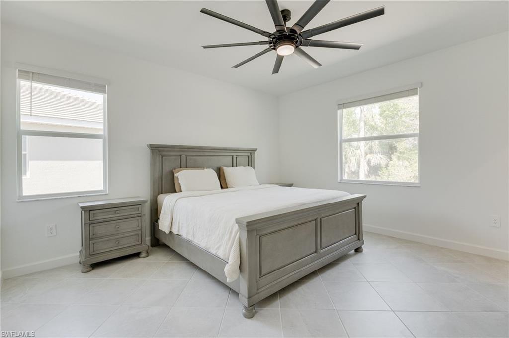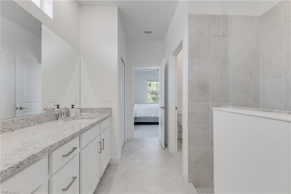 The serene primary suite is filled with natural light and includes a large walk-in closet and a thoughtfully designed en-suite bathroom with ample cabinet storage, a linen closet, sleek stone counters, and an impressive walk-in shower. Two additional bedrooms and bathrooms offer comfort and flexibility for family, guests, or a home office. The home provides peace of mind with hurricane-impact windows and doors.