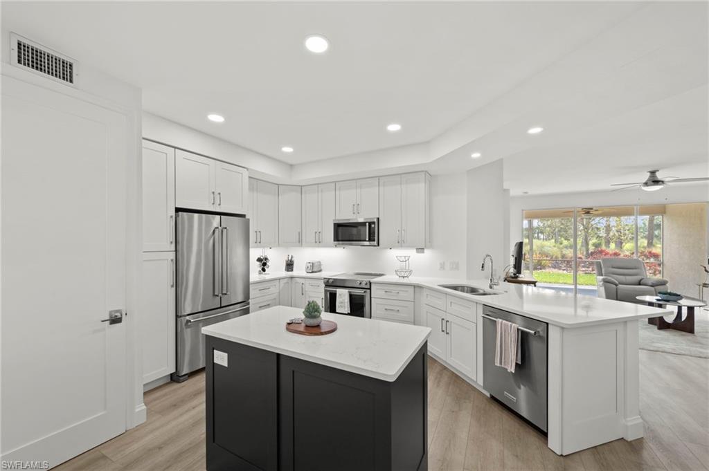 Beautifully renovated first-floor 2-bedroom, 2-bath condominium in Spring Run at The Brooks, offering an exceptional combination of upgraded interior finishes, functional improvements, and the highly sought-after bundled golf lifestyle in Estero. This move-in-ready residence has been thoughtfully reimagined with quality updates throughout, creating a more modern, open, and efficient living environment. Interior renovations include luxury vinyl tile (LVT) throughout and 5-inch baseboards, providing a clean, cohesive look and an updated feel from room to room. The kitchen area has been completely redesigned and reimagined to enhance both style and everyday functionality, with the addition of extra cabinetry for improved storage and a new kitchen island that adds workspace, seating potential, and a natural gathering area. The laundry space was also improved with a stackable washer and dryer configuration, allowing for more usable interior space and better overall flow within the unit. Both bathrooms have been updated with new vanities, adding to the home’s refreshed and well-maintained appeal. From the living areas and lanai, enjoy private water and golf course views, providing a relaxing backdrop and a true Southwest Florida lifestyle setting. The unit is also ideally located next to the community pool, offering convenient access to one of the neighborhood’s popular amenities. Spring Run at The Brooks is widely recognized as one of Southwest Florida’s premier bundled golf communities, featuring private golf membership, a renovated clubhouse, and an enhanced outdoor amenity area including an outdoor bar. In addition, owners in Spring Run and The Brooks have the opportunity to join The Commons Club, which, offers additional membership options and amenities for Brooks residents. The Commons Club membership opportunities are for Brooks residents only (including Gold/Silver/Bronze options) and amenities such as a private Beach Club, Health & Lifestyle Center, Enrichment Center, dining, and pickleball. Prime Estero location near shopping, dining, entertainment, Coconut Point Mall, boating and the beach.