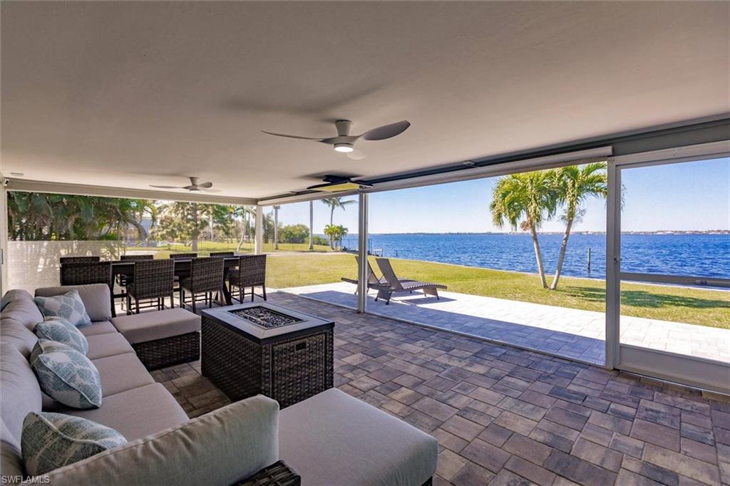 The large patio offers electric outdoor blinds, a tv that drops down from the ceiling, an outside bar, multiple fire pits, and plenty of seating to fully enjoy the waterfront lifestyle.