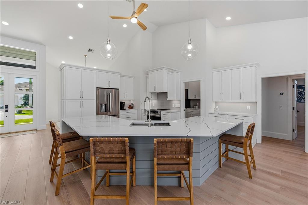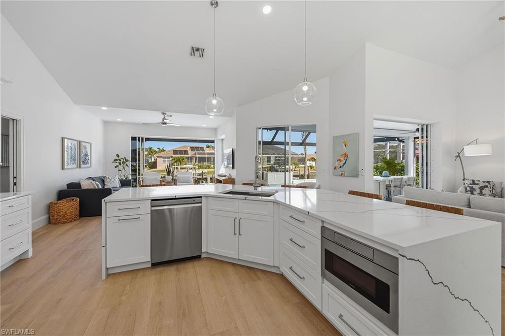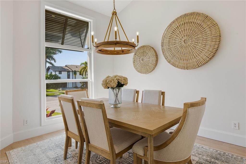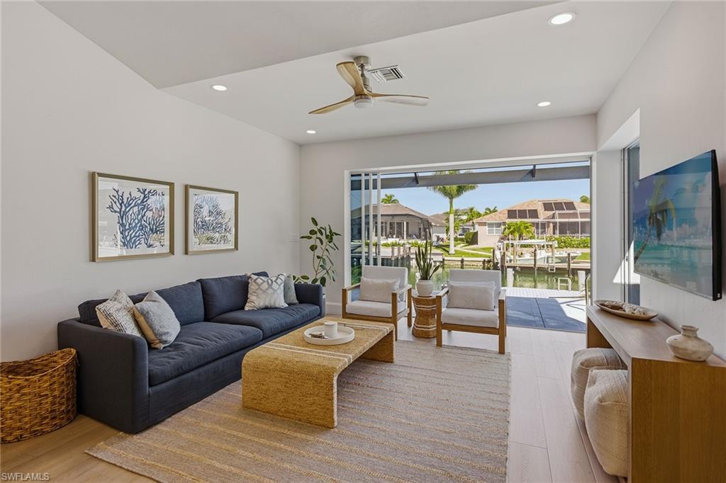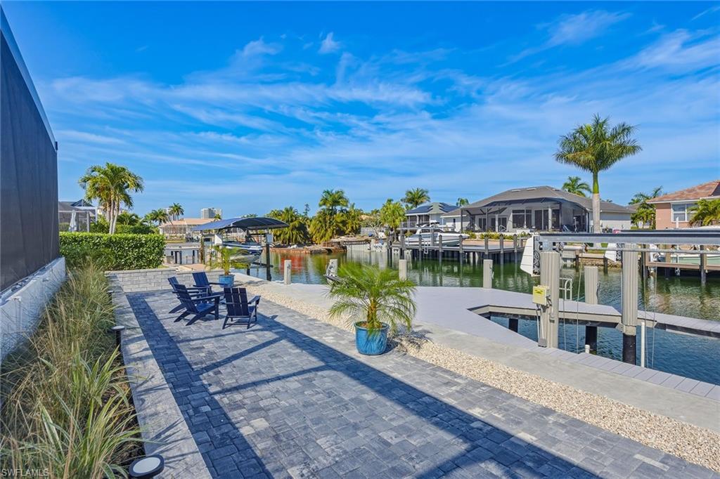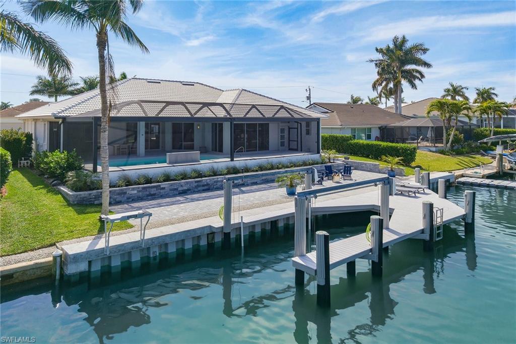 Welcome to this stunning 2025 fully remodeled waterfront residence offering three bedrooms, two baths and a versatile den, ideal for a home office, guest space, or media room. A new 2025 vinyl seawall and remodeled dock headline the outdoor enhancements, offering long-term durability and the ideal setup for boating, fishing or relaxing by the water. The expansive new paver deck in the rear provides ample space for entertaining. Inside, the complete home remodel showcases a new door and trim package, all-new fixtures, and LVP CoreTec Premium flooring throughout. The beautifully reimagined kitchen features all-new appliances, custom cabinetry and designer finishes, while both baths have been completely remodeled with high-end materials and contemporary styling. Large new impact windows and doors across front of the home flood the interior with natural light while adding security and energy efficiency. The pool area has been fully refreshed with a re-tiled and resurfaced pool. This is complemented by new 1 ¼-inch marble pavers throughout the lanai, a new pool heater, and a panoramic screen enclosure (2018) for unobstructed views. Additional exterior improvements include a new paver driveway and walkway, new retaining wall and planting beds, updated landscaping and a striking new façade that enhances curb appeal. Thoughtfully redesigned from top to bottom, this home delivers modern luxury, peace of mind and exceptional outdoor living. This home is being sold furnished, including new furniture throughout, creating a move-in-ready opportunity. Major system updates provide added confidence, including a new air conditioner (12/2024), new water heater (12/2024), electric shutters and a roof replaced in 2018. A transferable flood insurance policy offers additional value and peace of mind. With its new seawall, remodeled dock and comprehensive 2025 remodel, this waterfront home is the complete package, stylish, turnkey and designed for effortless coastal living.
