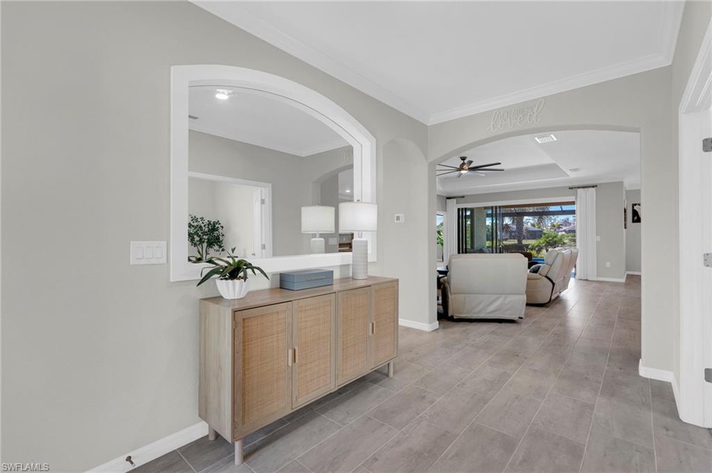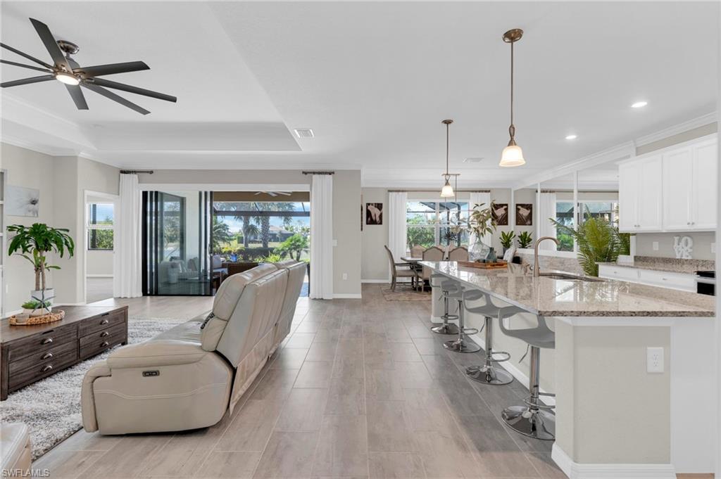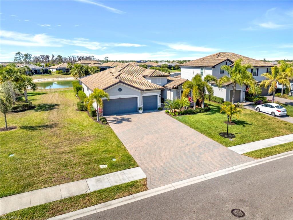 WESTERN LAKEFRONT VIEWS + CUSTOM SALT WATER POOL WITH SPA AND SUNSHELF! This SUMMERVILLE FLOOR PLAN in resort-style The Place at Corkscrew was made for gathering with 3 BEDROOMS PLUS A DEN, 3 FULL BATHS, & 2, 445 SQ FT of open single-story living. Out back, WESTERN LAKE VIEWS deliver golden sunsets over your CUSTOM SALTWATER POOL & SPA with SUNSHELF, APP CONTROL, & AUTO-FILL, finished in MIDNIGHT BLUE PEBBLETEC with HIDDEN FRENCH DRAINS. ALASKAN SILVER TRAVERTINE PAVERS elevate the lanai, while the PANORAMIC SUPER SCREEN keeps views crystal clear & blocks no-see-ums. TALL PRIVACY HEDGING & CUSTOM LANDSCAPING frame the space, with an extra side easement for added breathing room. HURRICANE PREPAREDNESS includes a PORTABLE WHOLE-HOUSE GENERATOR WITH TRANSFER SWITCH. Inside, DOUBLE GLASS ENTRY DOORS WITH BUILT-IN INVISIBLE SCREENS provide natural light & the flexibility to enjoy fresh air. The great-room design is bright & open with TILE THROUGHOUT MAIN LIVING AREAS, CROWN MOLDING, 10-FOOT TRAY CEILINGS, & a custom mirrored foyer inlay. The kitchen flows into the living & dining areas & features GE STAINLESS APPLIANCES, SIDE-BY-SIDE REFRIGERATOR WITH WATER/ICE, MATCHING DISHWASHER, MICROWAVE, & STOVE, plus an 11-FOOT GRANITE ISLAND seating five, CORNER STEP-IN PANTRY WITH CUSTOM WOOD SHELVING, STACKED STONE ACCENT WALL WITH CUSTOM MIRRORS, CUSTOM DRAPERY, REMOTE-CONTROLLED HUNTER DOUGLAS SHADES, & negotiable BEVERAGE COOLER. The PRIMARY SUITE offers CROWN MOLDING, TRAY CEILING, LAKE VIEWS, DIRECT LANAI ACCESS, SPLIT DUAL VANITIES, LARGE WALK-IN SHOWER WITH UPDATED SHOWERHEAD & HANDHELD, & DUAL WALK-IN CLOSETS, one with CUSTOM BUILT-INS. Two additional guest bedrooms plus a DEN WITH SOLID FRENCH DOORS provide a home office, media room, or overflow space; one guest suite has a PRIVATE EN-SUITE BATH WITH FULL SHOWER, the second adjacent to a FULL BATH WITH TUB/SHOWER COMBO. Laundry includes UPPER CABINETRY, LAUNDRY SINK, & GE WASHER & DRYER. A 3-CAR GARAGE with EPOXY-COATED FLOORS, BIKE RACKS, & KAYAK HOIST fits three vehicles or two plus a golf cart, & the THREE-CAR-WIDE DRIVEWAY fits up to nine cars. WHOLE-HOME WATER FILTRATION & negotiable furnishings complete this move-in-ready home. Resort-style amenities include lagoon-style pool with waterfalls, 100-foot waterslide, splash pad, fitness center, café, restaurant & bar. Sports lovers enjoy tennis, pickleball, bocce, basketball & sand volleyball, plus playground & dog park. Nearby Old Corkscrew Golf Club is being redesigned into a premier private golf experience. Close to Publix, Miromar Outlets, Gulf Coast Town Center, RSW Airport & Southwest Florida beaches, this home offers the perfect blend of luxury & convenience.