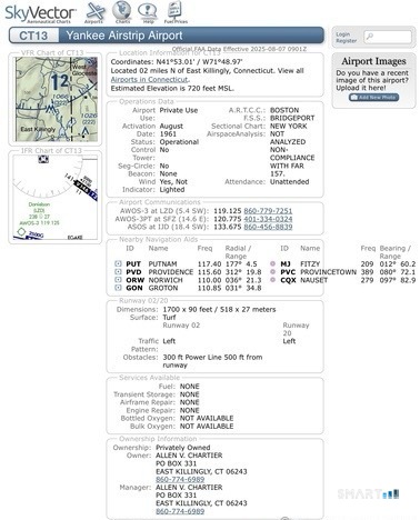 Discover an extraordinary aviation opportunity in the heart of Connecticut's country side. This licensed private landing area known as Yankee Airstrip - CT 13 offers pilots and aviation enthusiasts a rare chance to own their piece of the sky. Positioned at a 720 ft. elevation, the property features a well-maintained 1700 ft. turf runway that's 90 ft. wide. The airfield fits perfectly in Dayville's rolling landscape, where morning mist dances across the landing field and afternoon flights offer breathtaking views of New England's changing seasons. Whether you're a seasoned pilot looking for a base of operations or an aviation dreamer ready to take flight, this property offers functionality wrapped in natural beauty. . The surrounding area provides convenient access to essential amenities. 3 Prep-Schools and shopping options within a reasonable distance. Hartford and Boston are an approximately 30 minute flight, with Providence even closer at less than 20 minutes. Don't miss out on this exciting opportunity, schedule a showing today!