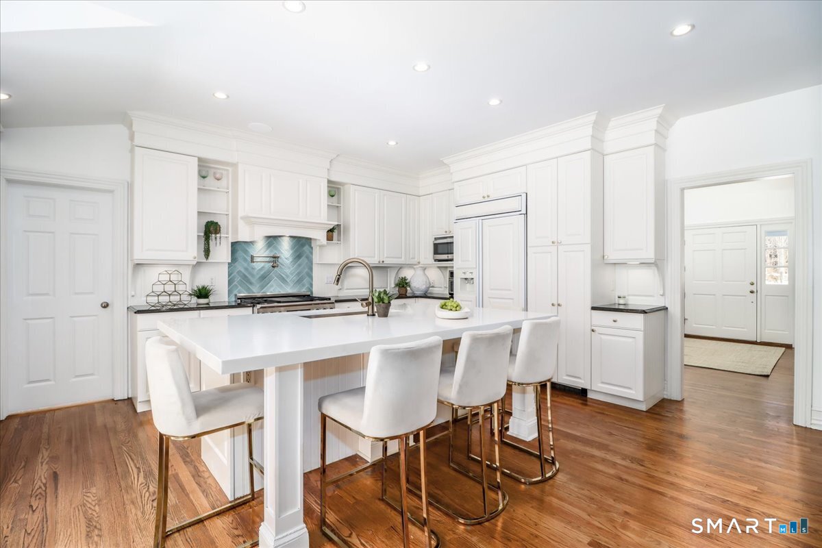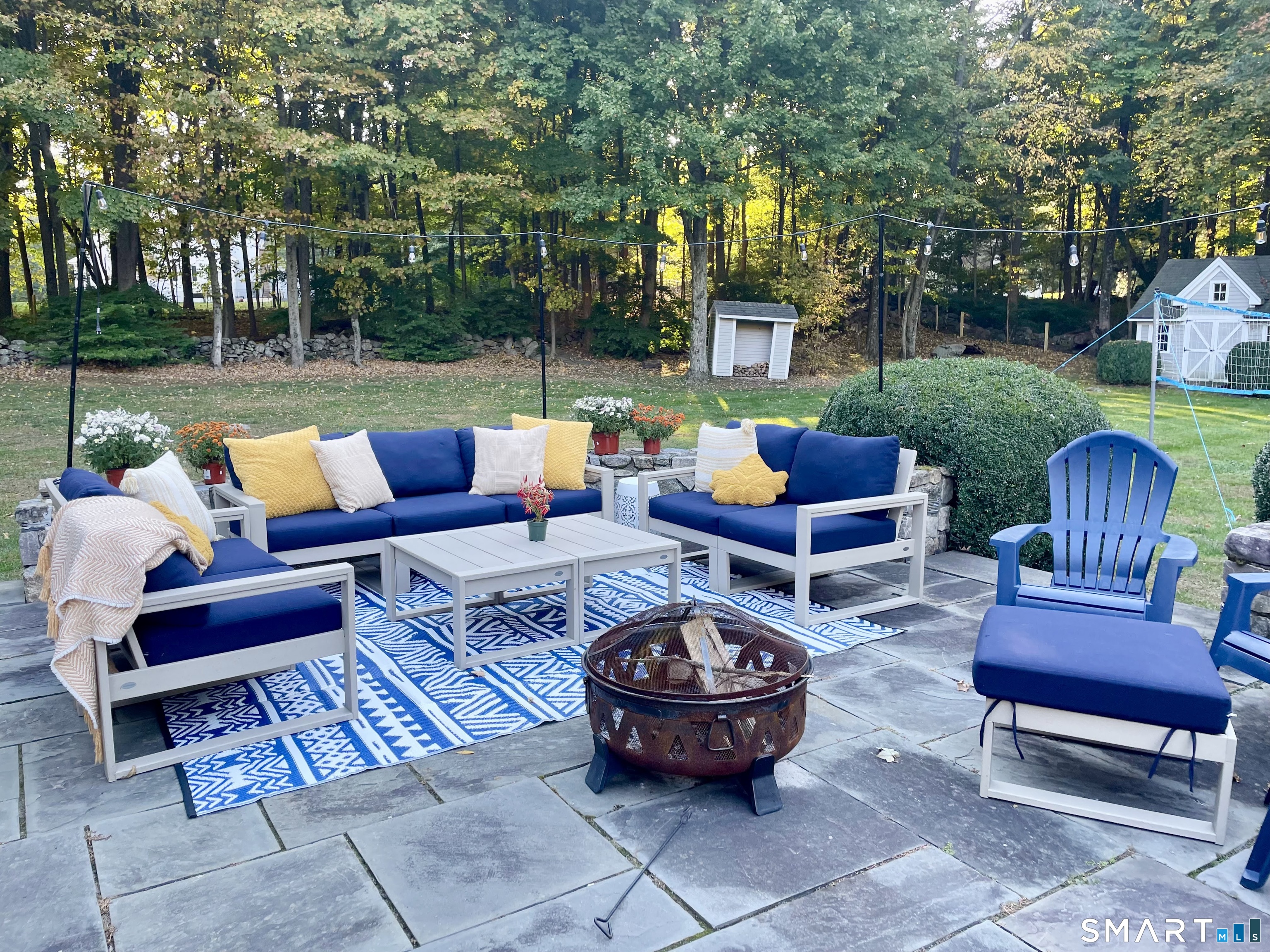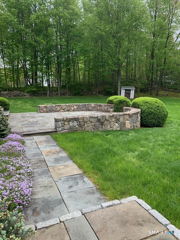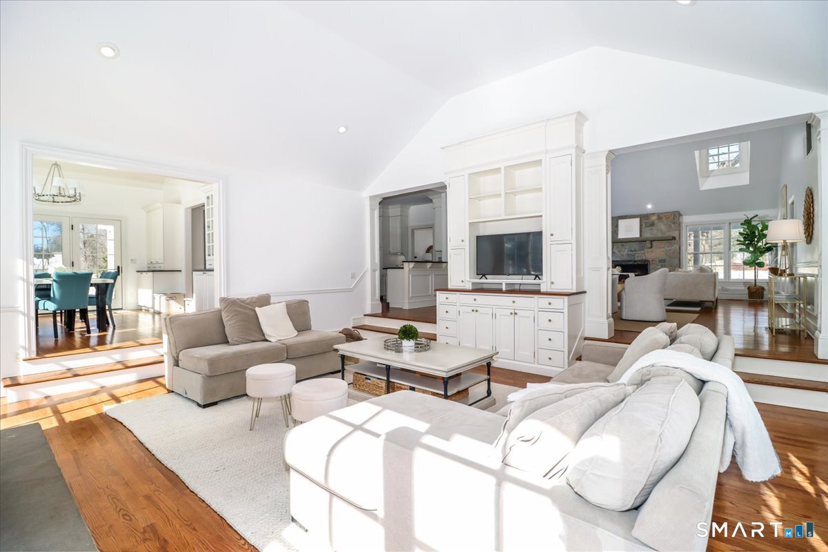 Set in a highly sought after south Wilton, CT cul de sac, this light-filled home offers refined design and effortless indoor-outdoor living. Rebuilt in 1999 and thoughtfully renovated in 2009, the open layout feels both expansive and welcoming. From the moment you enter, front-to-back and side-to-side sightlines, soaring ceilings, and oversized windows create an airy, elegant first impression. The gracious living room features custom millwork, a striking stone fireplace, dining area, and upper dormer windows that add architectural detail and natural light. The open kitchen with recent upgrades is designed for both daily living and entertaining, showcasing high-end appliances, custom cabinetry, and a walk-in pantry. A sun-filled breakfast room with built-ins and a wall of windows overlooks the beautifully landscaped, level backyard and in-ground gunite pool, offering a seamless connection to outdoor living. Multiple gathering spaces include a cozy family room with built-ins and stone fireplace, a flex space or recreation room, and a large second-floor bonus room. The first-floor primary suite provides privacy and convenience with 2 walk-in closets and a pristine full bath. A 5th bedroom, full bath off the bonus room is perfect for guests or extended living needs. Bluestone patios, private and level backyard, lighted basketball court, room for volleyball, soccer and more. Convenient to Wilton Center, Metro-North train service, major highways, schools, dining and shopping. Who doesn't love a front porch? This home delivers luxury, comfort, and lifestyle ease in one of Fairfield County's most desirable communities. Sun-Drenched unique colonial rambler with Private Backyard Oasis in a Top-Rated School District.