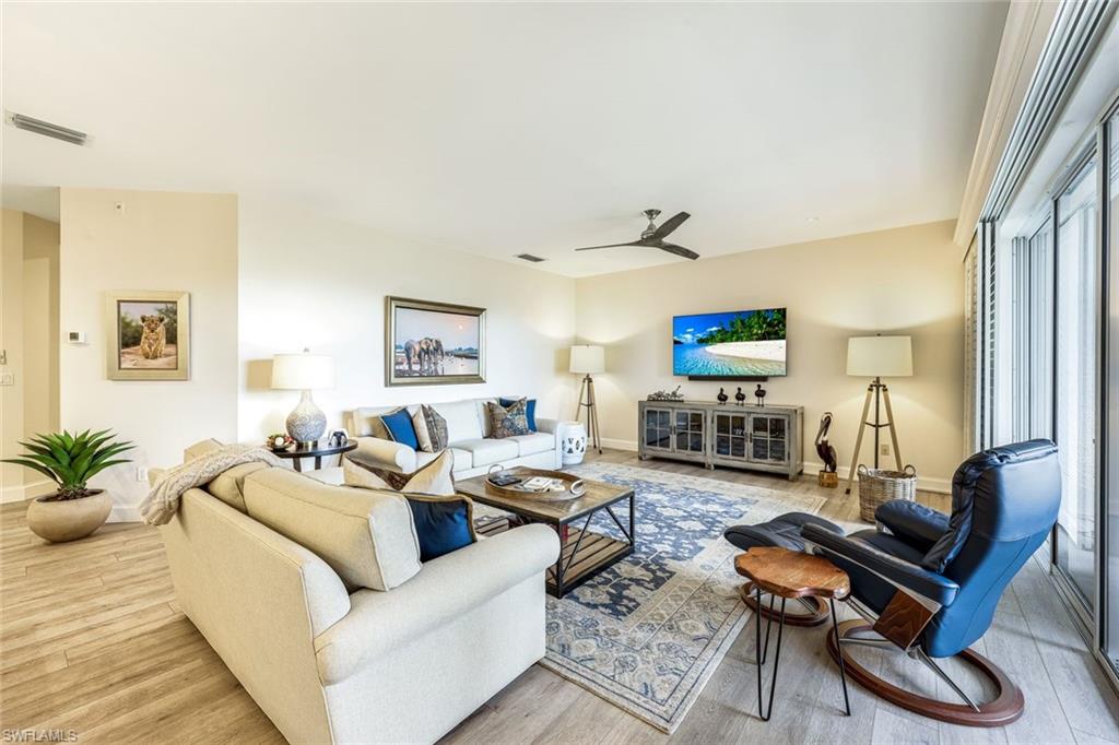 Wall of glass lead to your private screened lanai, perfect for morning coffee or hosting sunset gatherings against the backdrop of uninterrupted fairway and lush manicured greens.