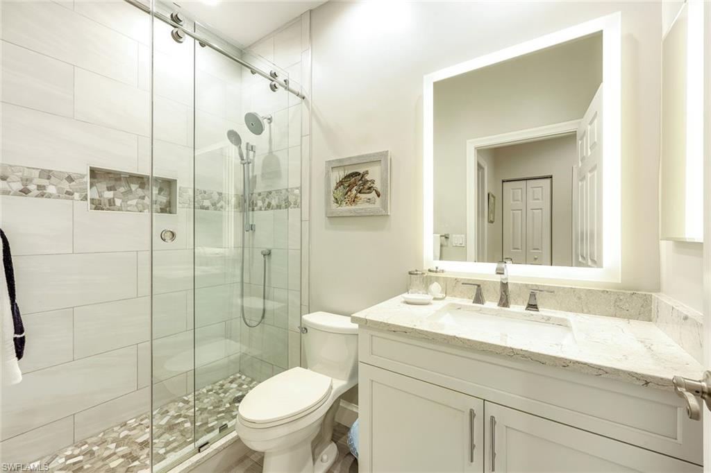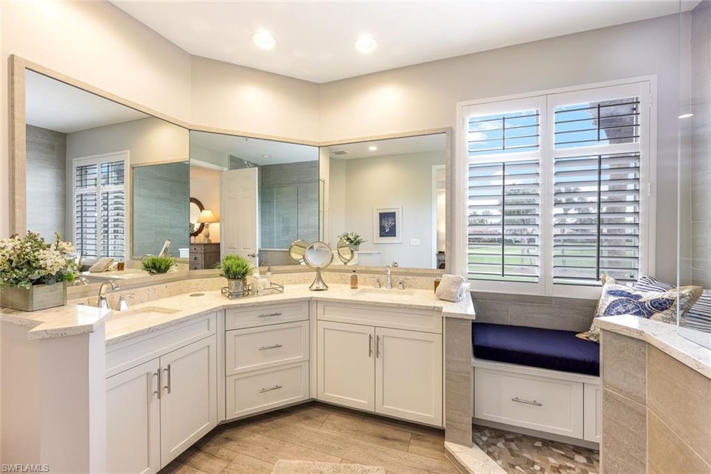 Retreat to the newly renovated primary suite where panoramic lake and golf course views await. The spa inspired bathroom boasts dual sinks, a walk-in shower with bench, and updated fixtures, providing a serene escape at the end of the day.