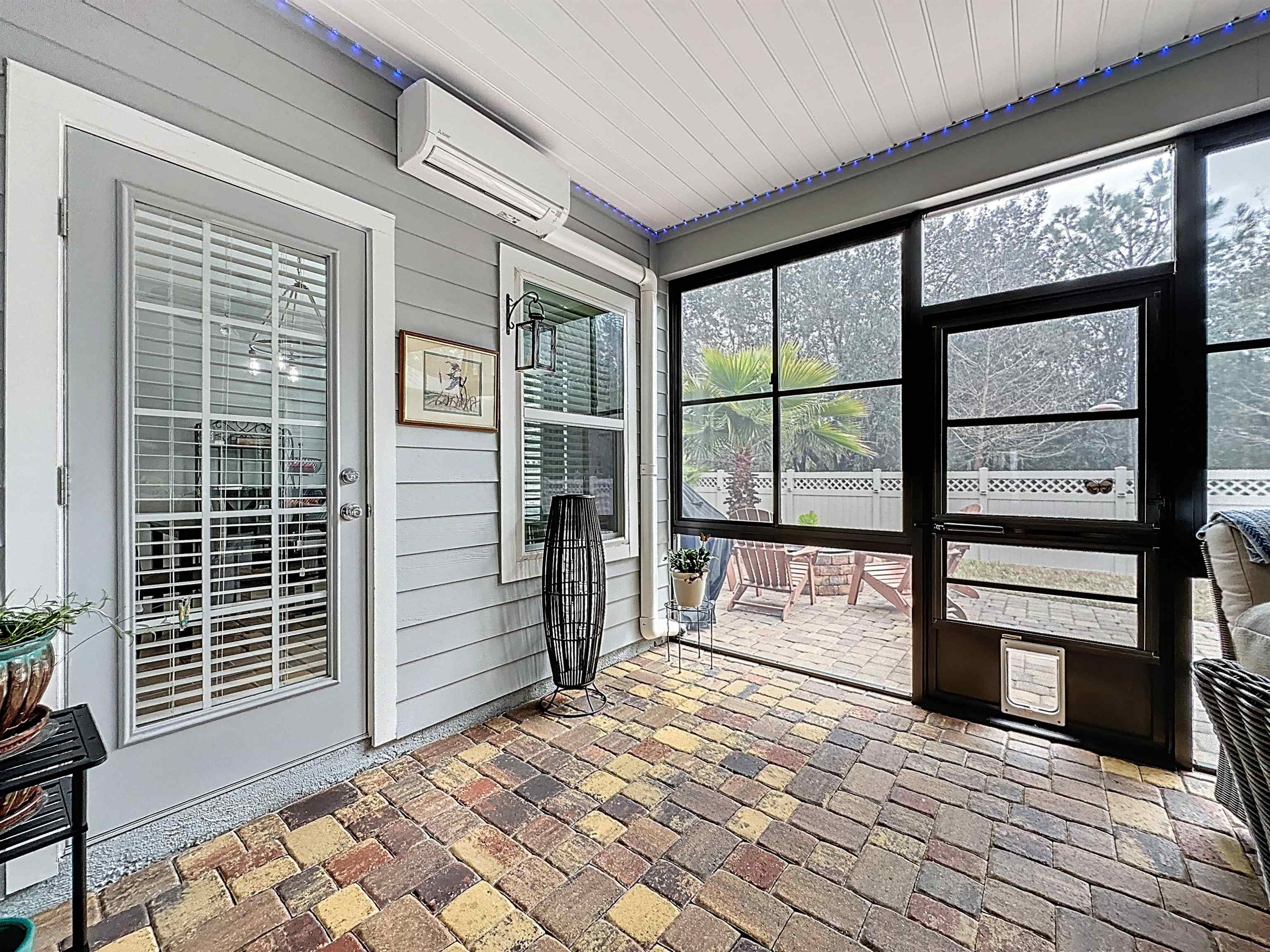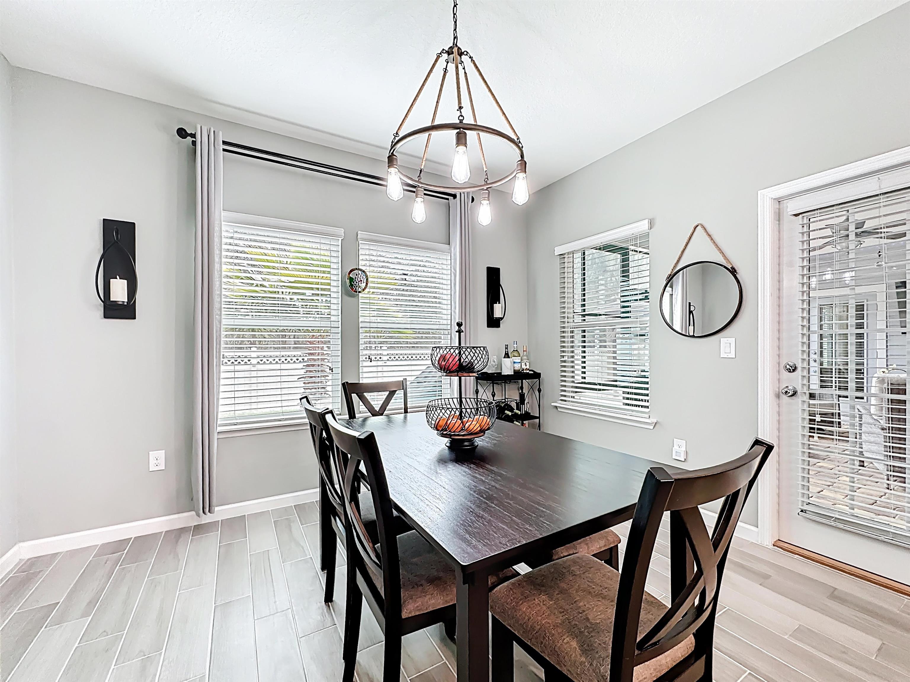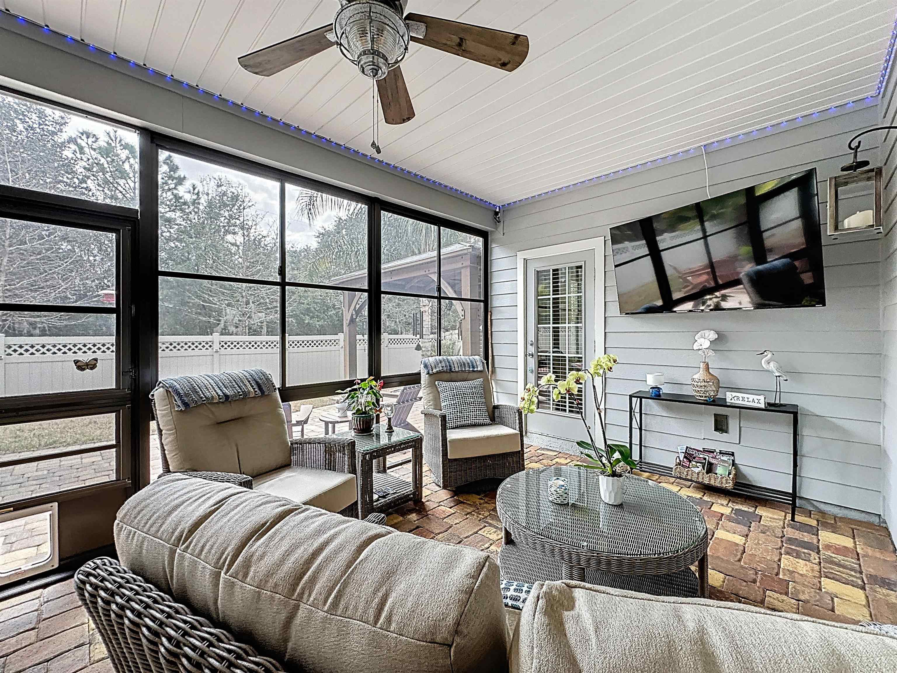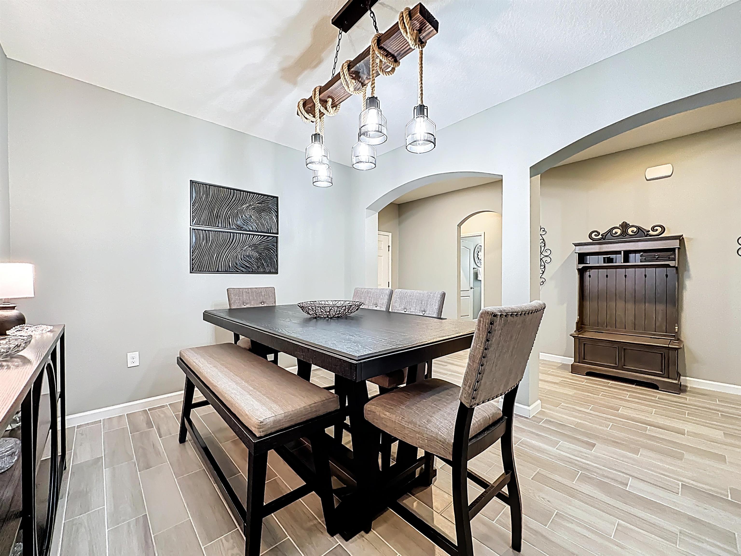 MOVE-IN READY in Desirable Arbor Mill – NO CDD Fees! Welcome to this impeccably maintained 4-bdrm, 2-bath home in the sought-after Arbor Mill community which offers 2, 268 square feet of thoughtfully designed open-concept living space filled with upscale finishes and modern comforts. Elegant wood-plank tile flooring, designer lighting, and seamless flow ideal for both everyday living and entertaining. A gourmet kitchen. . . featuring quartz countertops, stone backsplash, stainless steel appliances, and a large island perfect for gathering and entertaining. The split floor plan provides privacy and flexibility. This spacious primary suite is a true retreat, highlighted by a tray ceiling, large walk-in closet, and a spa-inspired bathroom complete with dual vanities, soaking tub, and separate shower. Bedrooms 2 and 3 are separated by a full bath, while the 4th bedroom, currently used as an exercise room, offers a flex space for an office/bonus rm. Sliding glass doors lead to a 209sf private oasis. . . screen/vinyl-enclosed, heated and cooled Lanai, extending to a beautifully designed paver patio with built-in fire pit and Pergola w/ hot tub — perfect for relaxing evenings or weekend gatherings. Additional exterior upgrades include gemstone lighting, a paver driveway, and a fully fenced backyard. This community offers amazing amenities, including clubhouse, pool, playground, sports field, dog park/walk area, and more. . .