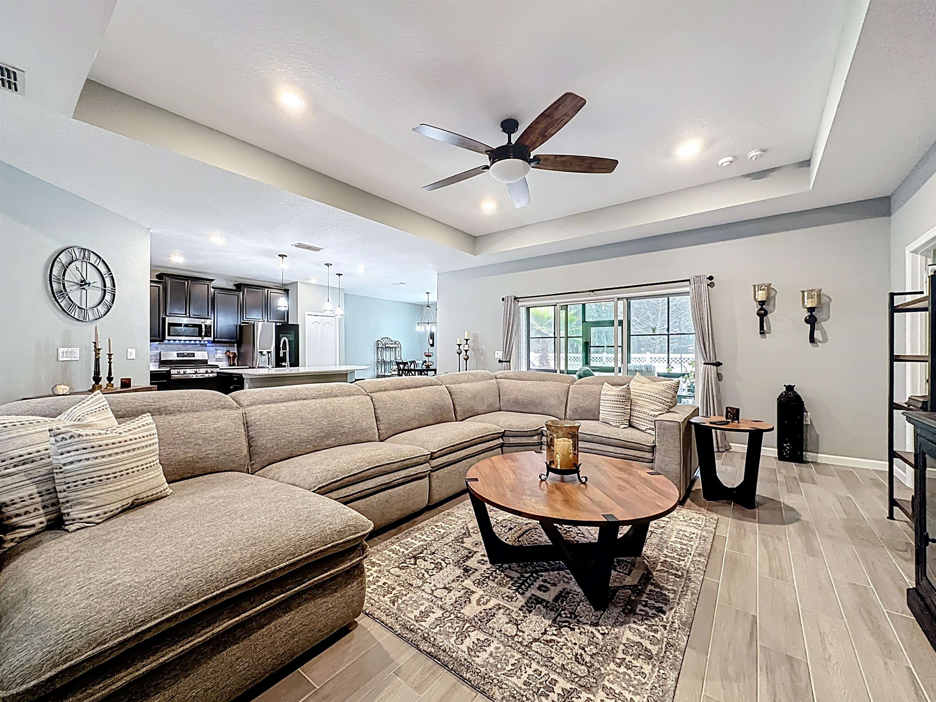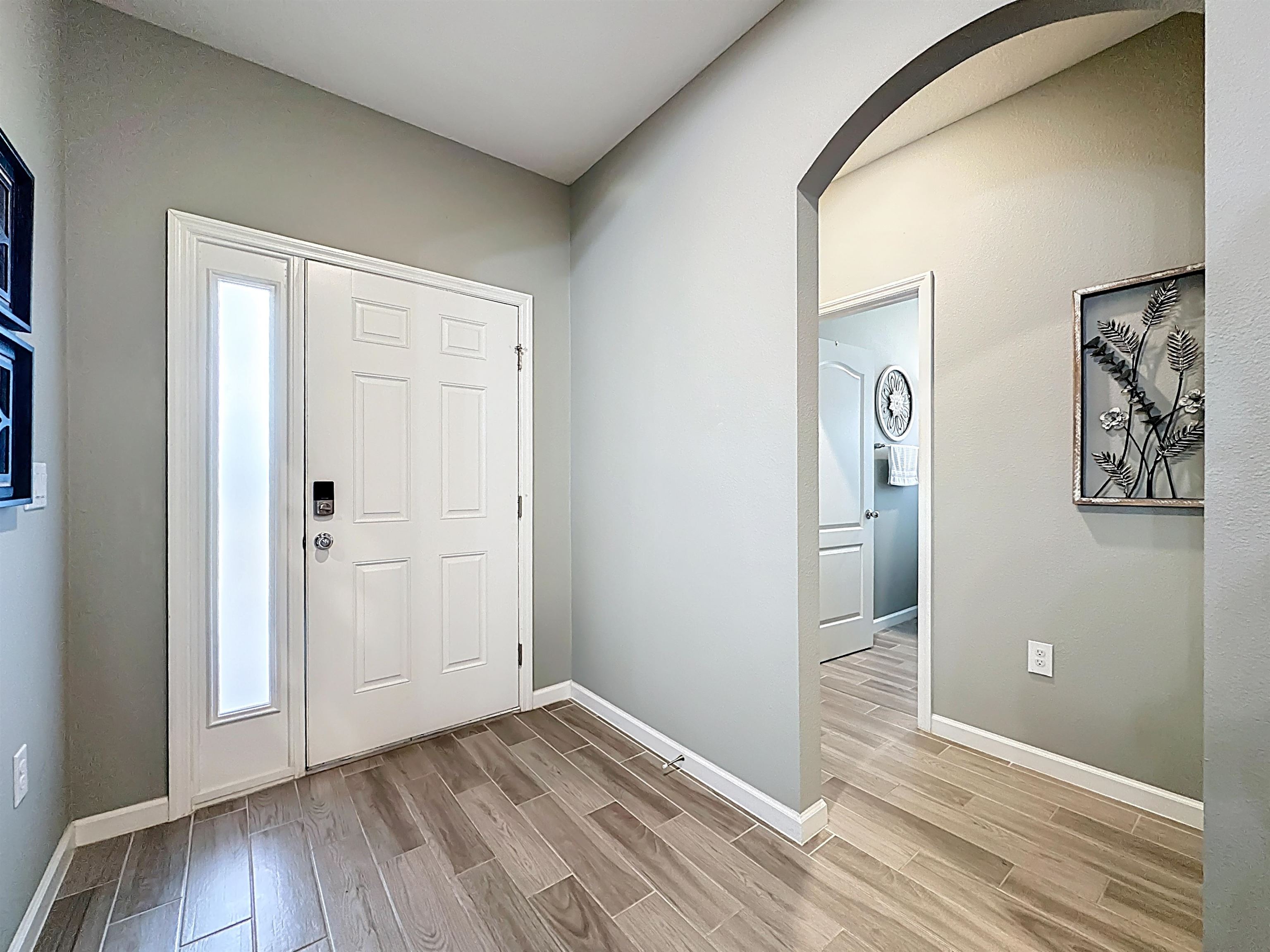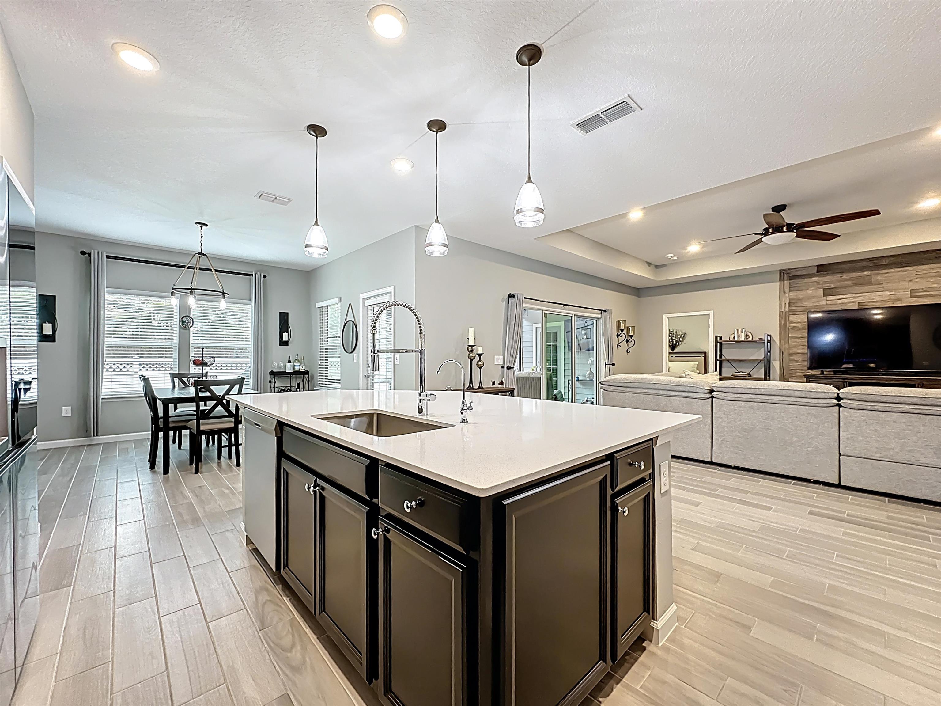 MOVE-IN READY in Desirable Arbor Mill – NO CDD Fees! Welcome to this impeccably maintained 4-bdrm, 2-bath home in the sought-after Arbor Mill community which offers 2, 268 square feet of thoughtfully designed open-concept living space filled with upscale finishes and modern comforts. Elegant wood-plank tile flooring, designer lighting, and seamless flow ideal for both everyday living and entertaining. A gourmet kitchen. . . featuring quartz countertops, stone backsplash, stainless steel appliances, and a large island perfect for gathering and entertaining. The split floor plan provides privacy and flexibility. This spacious primary suite is a true retreat, highlighted by a tray ceiling, large walk-in closet, and a spa-inspired bathroom complete with dual vanities, soaking tub, and separate shower. Bedrooms 2 and 3 are separated by a full bath, while the 4th bedroom, currently used as an exercise room, offers a flex space for an office/bonus rm. Sliding glass doors lead to a 209sf private oasis. . . screen/vinyl-enclosed, heated and cooled Lanai, extending to a beautifully designed paver patio with built-in fire pit and Pergola w/ hot tub — perfect for relaxing evenings or weekend gatherings. Additional exterior upgrades include gemstone lighting, a paver driveway, and a fully fenced backyard. This community offers amazing amenities, including clubhouse, pool, playground, sports field, dog park/walk area, and more. . .