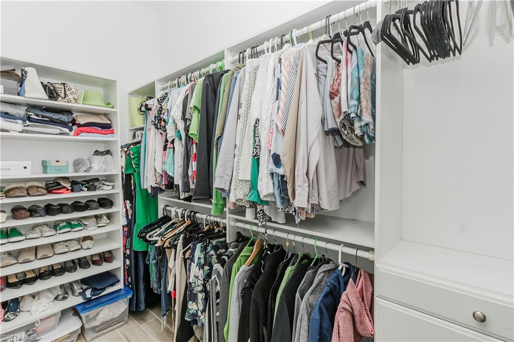 The primary suite and guest spaces are complemented by custom closets, while the guest bath showcases a custom glass shower enclosure. A single-unit washer and dryer allows you to set your laundry and head out for a day on the course with ease. The vinyl finished garage floor and ceiling-mounted storage racks add functionality without sacrificing style and space.