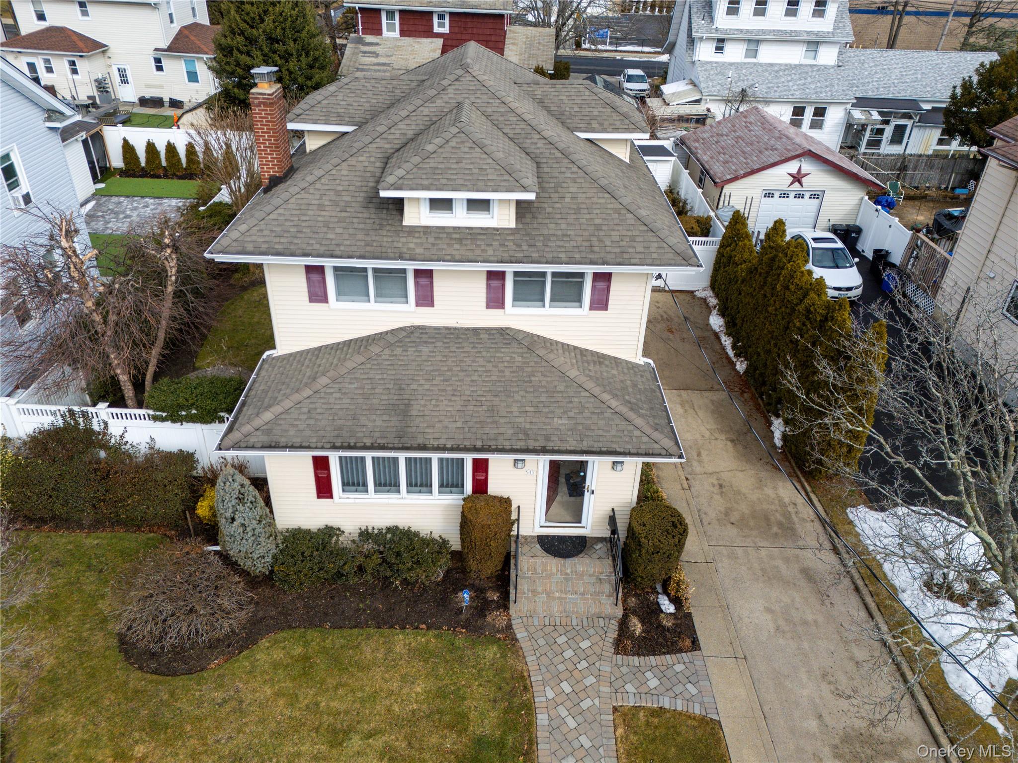 36 W Windsor Parkway — A meticulously maintained and updated 1, 816 sq. ft. Colonial perfectly situated in the heart of Oceanside. The home welcomes you with a classic vestibule, ideal for a functional mudroom transition. Inside, the main level features a seamless open-concept dining and living area, anchored by a cozy wood-burning fireplace and cooled by high-efficiency ductless AC. The sun-drenched floor plan flows effortlessly into a bright sitting room and an eat-in kitchen, which also boasts dedicated ductless cooling. A versatile den (or 5th bedroom) with ductless cooling, a full bathroom with a soaking tub, and a convenient pantry complete the expansive first floor. The second level is home to four spacious bedrooms, each equipped with its own ductless unit for personalized climate control, alongside an updated full bathroom featuring modern subway tiling and a sleek walk-in shower. For those requiring even more space, the massive pull-down attic offers high ceilings and immense storage potential. Practicality meets lifestyle off the kitchen, where egress stairs lead to a full basement housing laundry, utilities, and additional storage. Outside, enjoy a spacious private backyard, providing the perfect retreat for relaxation or entertaining.