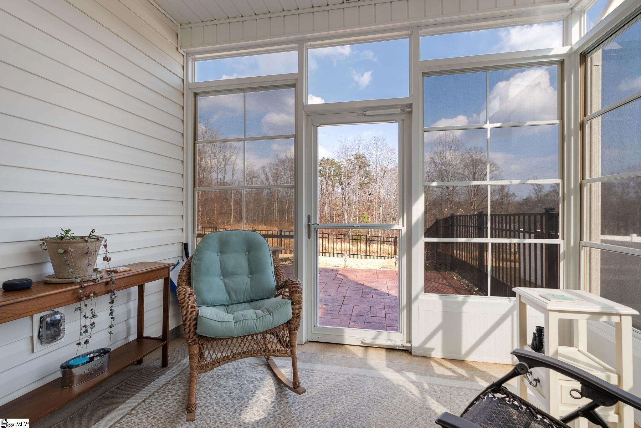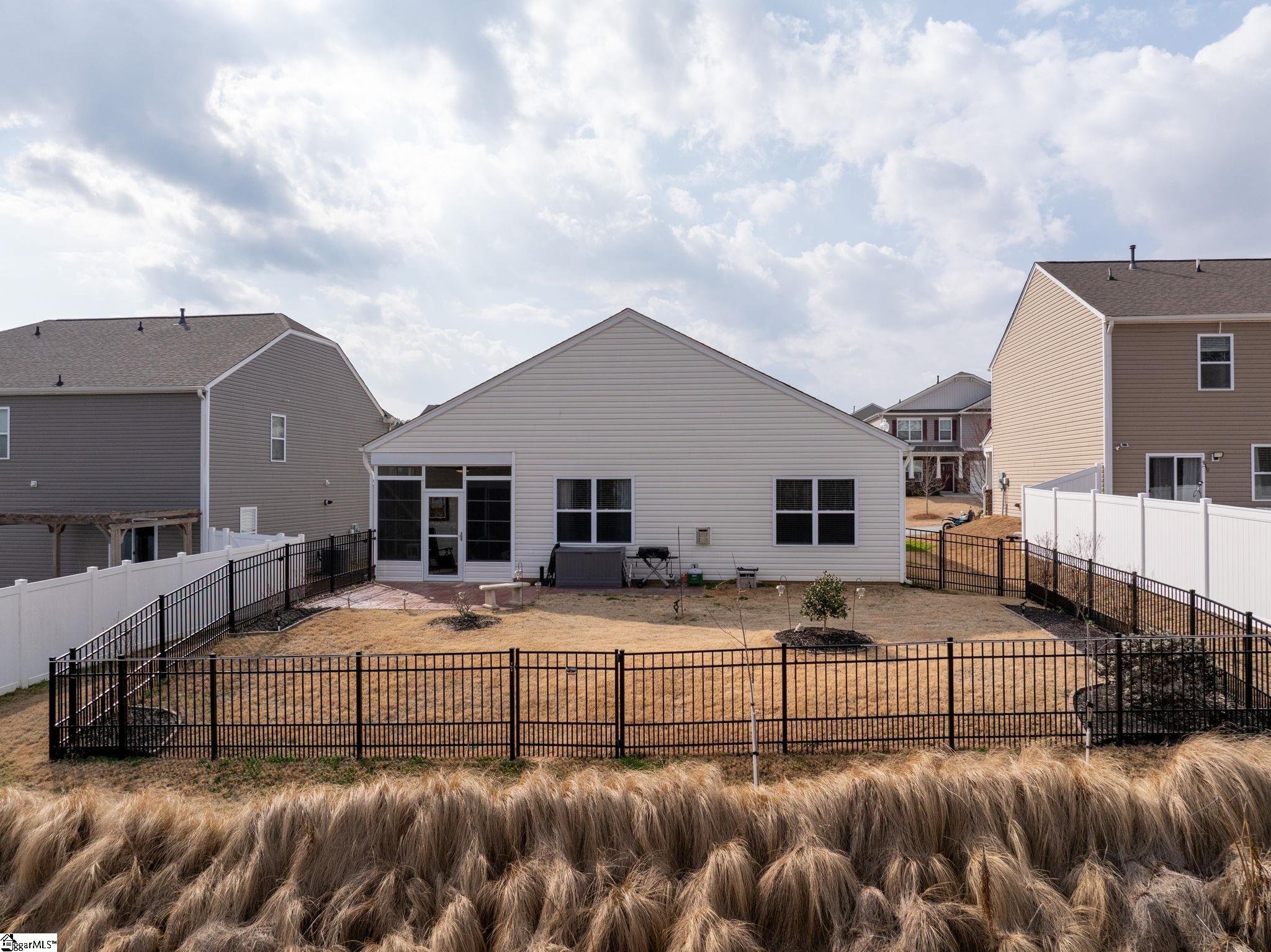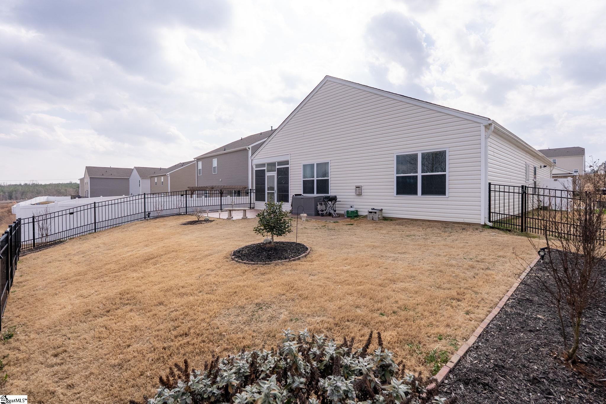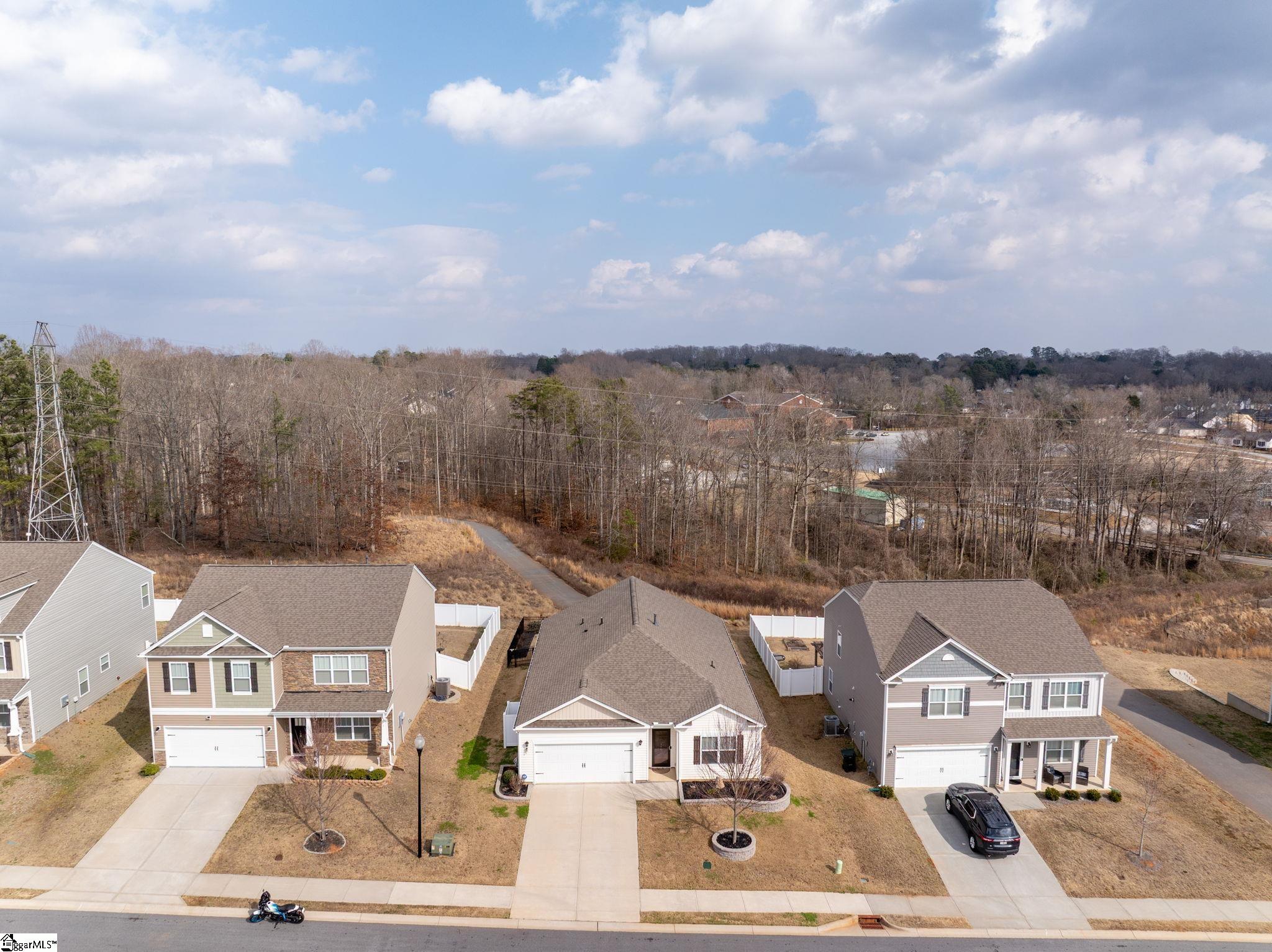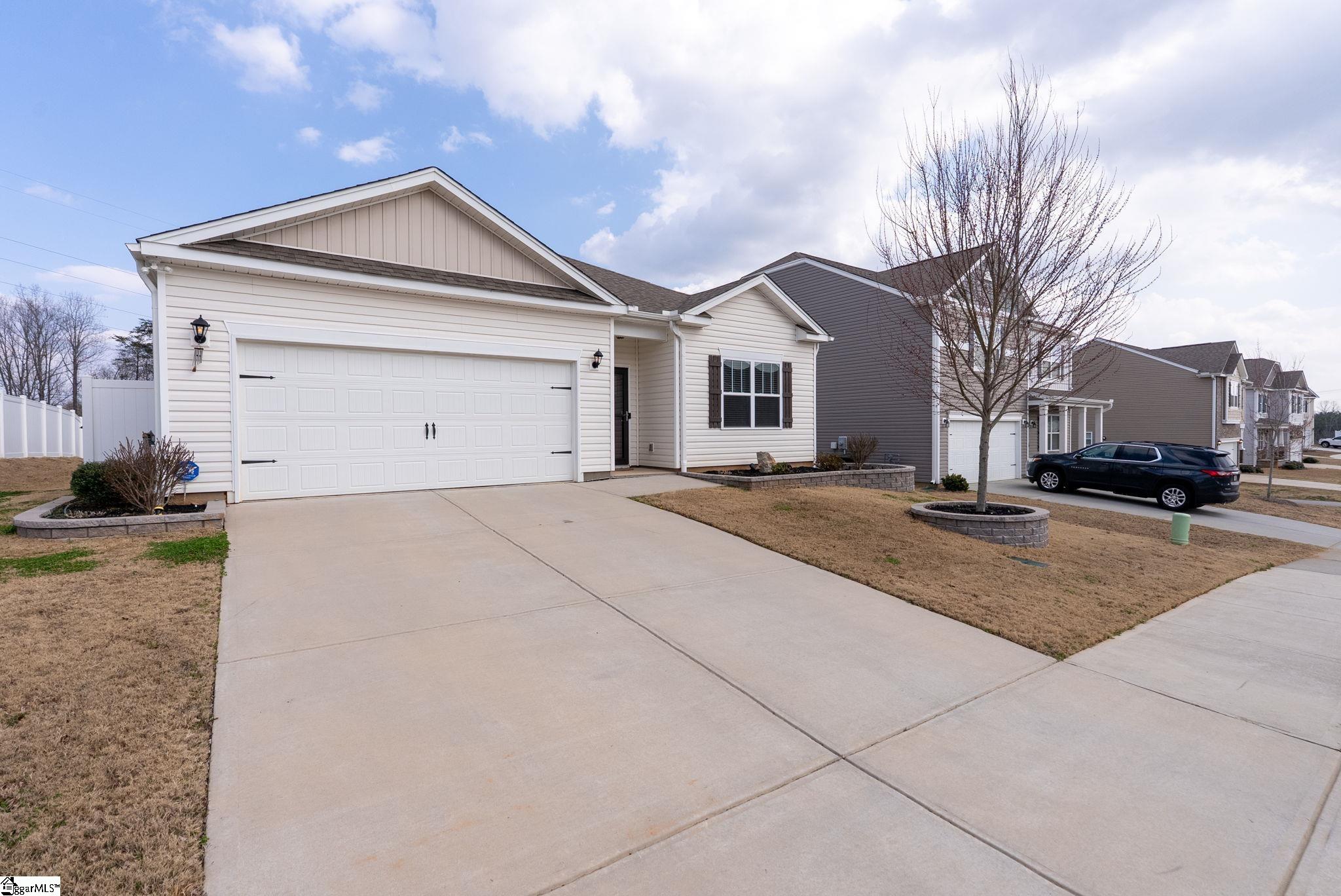 Welcome home to this beautifully maintained 4-bedroom, 2-bath single level home in the sought after Pearson Farms community, zoned for Forest Acres Elementary, Richard H. Gettys Middle, and Easley High School. Built in 2022, this home offers approximately 1, 774 sq ft with a bright, open concept layout perfect for everyday living and entertaining. The inviting living area centers around a cozy gas fireplace and flows effortlessly into the kitchen, complete with dark cabinetry, stainless steel appliances, a spacious walk-in pantry, and an upgraded backsplash. Laminate plank flooring anchors the main living spaces, while the bedrooms offer plush carpet for added comfort. The primary suite impresses with vaulted ceilings, a walk-in closet, and an en-suite bath with double sinks. Step into the enclosed sunroom, a perfect flex space, that leads to the extended back patio with a paved BBQ area and large fenced-in yard. Beyond the fence, a private wooded area offers lasting privacy and is planned to include hiking and walking trails, while still preserving your serene backyard retreat. The home also features a 2-car garage and is within walking distance to the community pool, making it a complete package for comfort, style, and lifestyle.