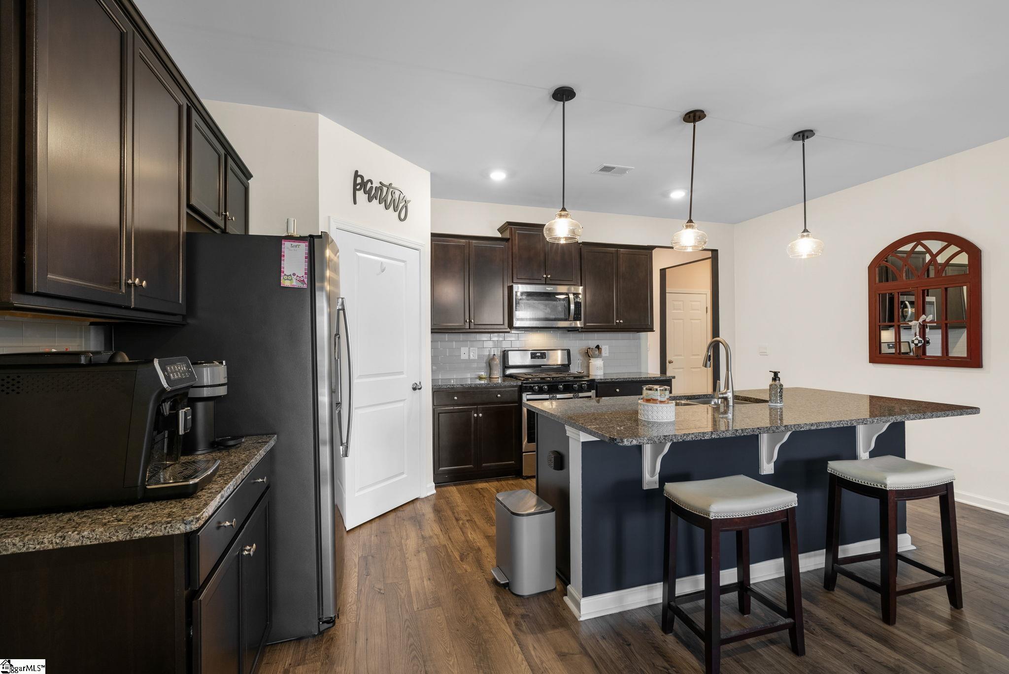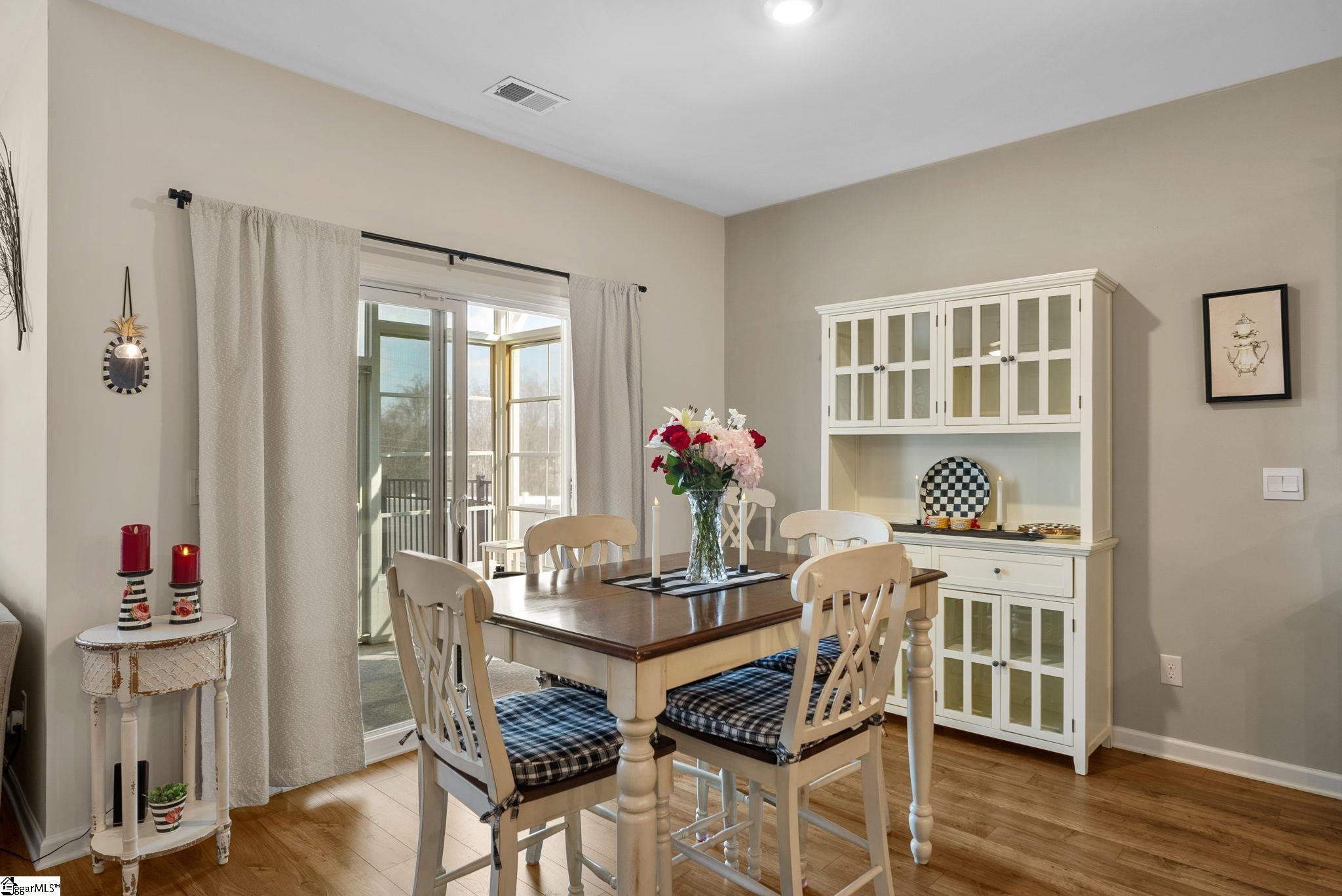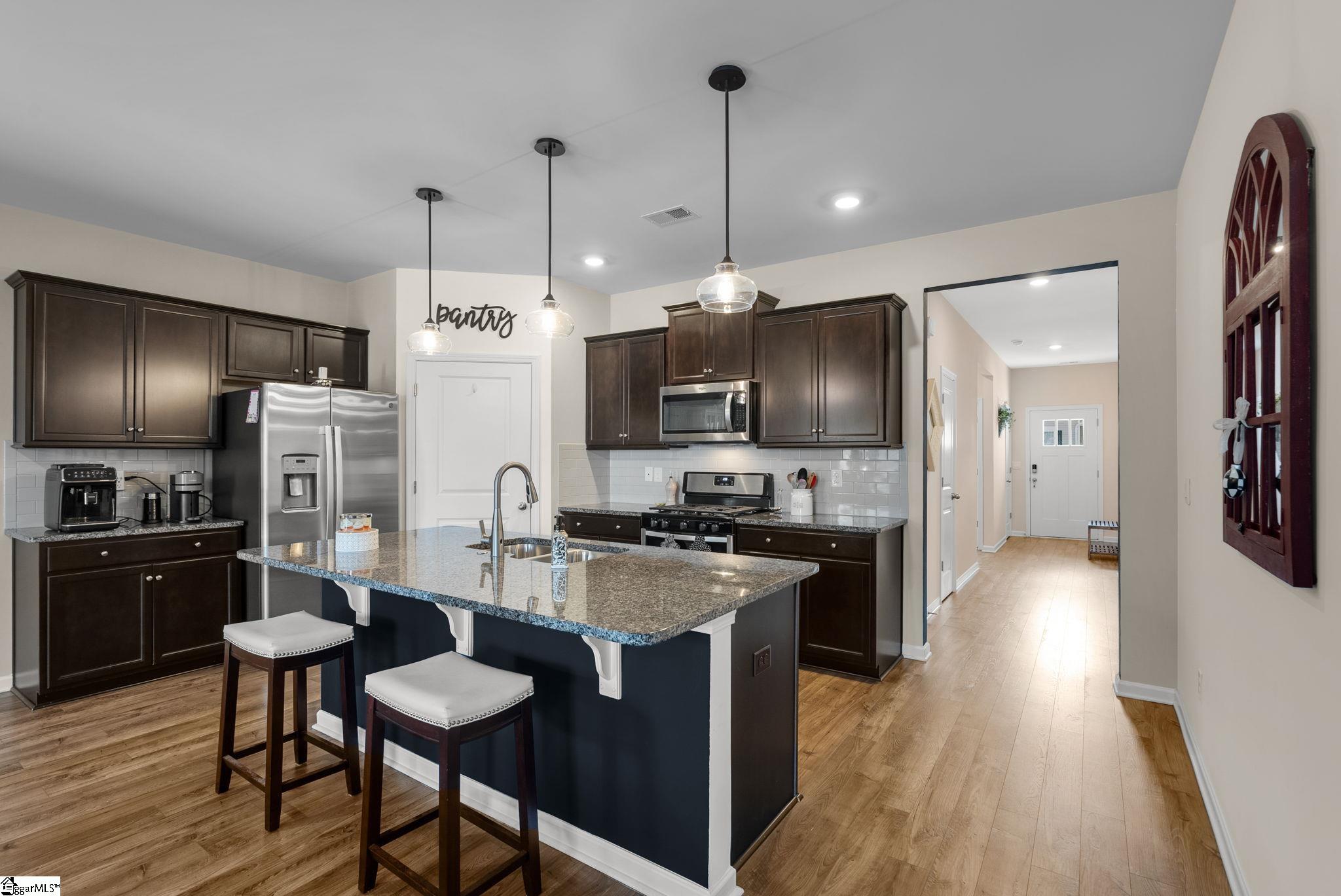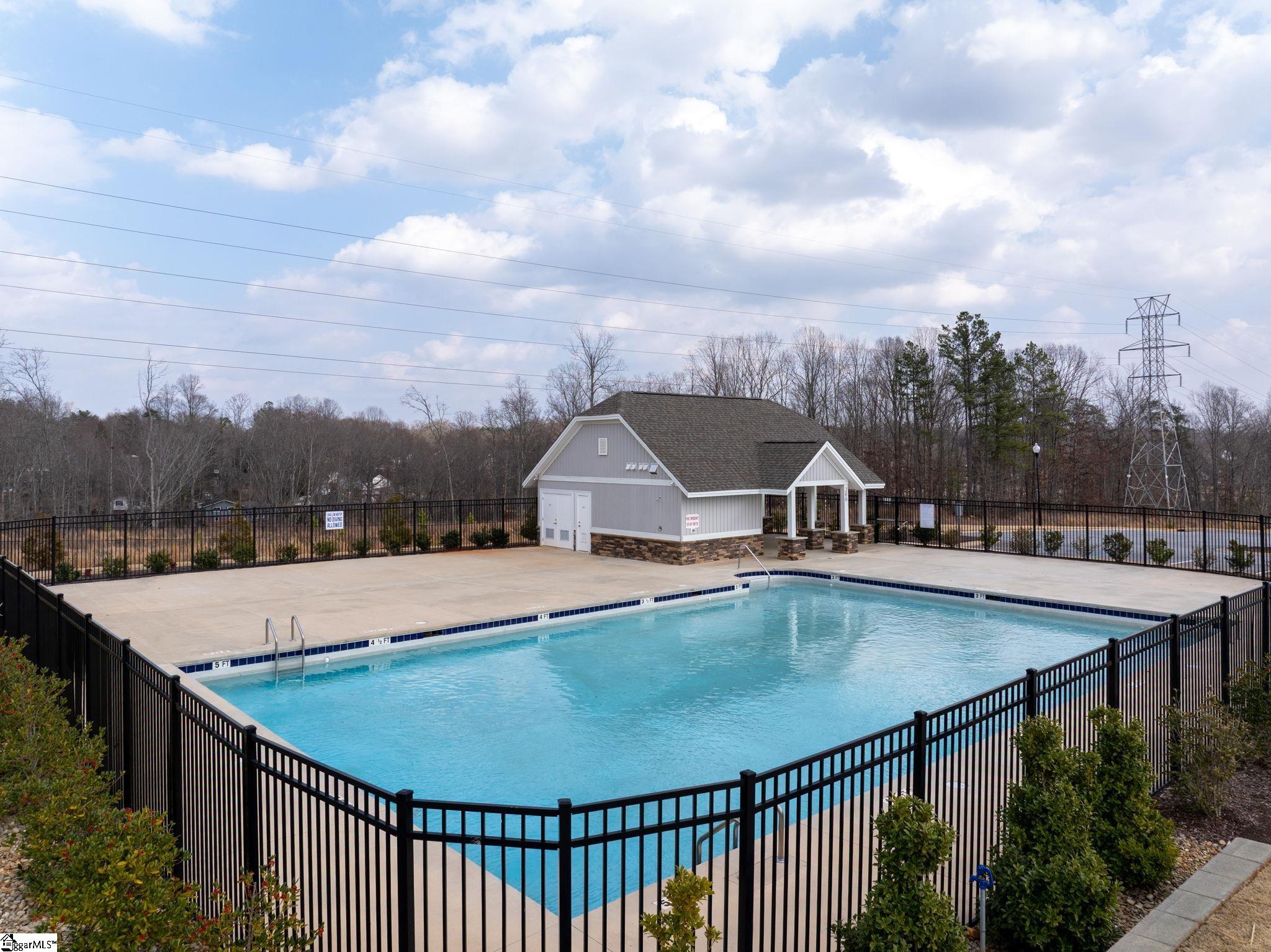 Welcome home to this beautifully maintained 4-bedroom, 2-bath single level home in the sought after Pearson Farms community, zoned for Forest Acres Elementary, Richard H. Gettys Middle, and Easley High School. Built in 2022, this home offers approximately 1, 774 sq ft with a bright, open concept layout perfect for everyday living and entertaining. The inviting living area centers around a cozy gas fireplace and flows effortlessly into the kitchen, complete with dark cabinetry, stainless steel appliances, a spacious walk-in pantry, and an upgraded backsplash. Laminate plank flooring anchors the main living spaces, while the bedrooms offer plush carpet for added comfort. The primary suite impresses with vaulted ceilings, a walk-in closet, and an en-suite bath with double sinks. Step into the enclosed sunroom, a perfect flex space, that leads to the extended back patio with a paved BBQ area and large fenced-in yard. Beyond the fence, a private wooded area offers lasting privacy and is planned to include hiking and walking trails, while still preserving your serene backyard retreat. The home also features a 2-car garage and is within walking distance to the community pool, making it a complete package for comfort, style, and lifestyle.