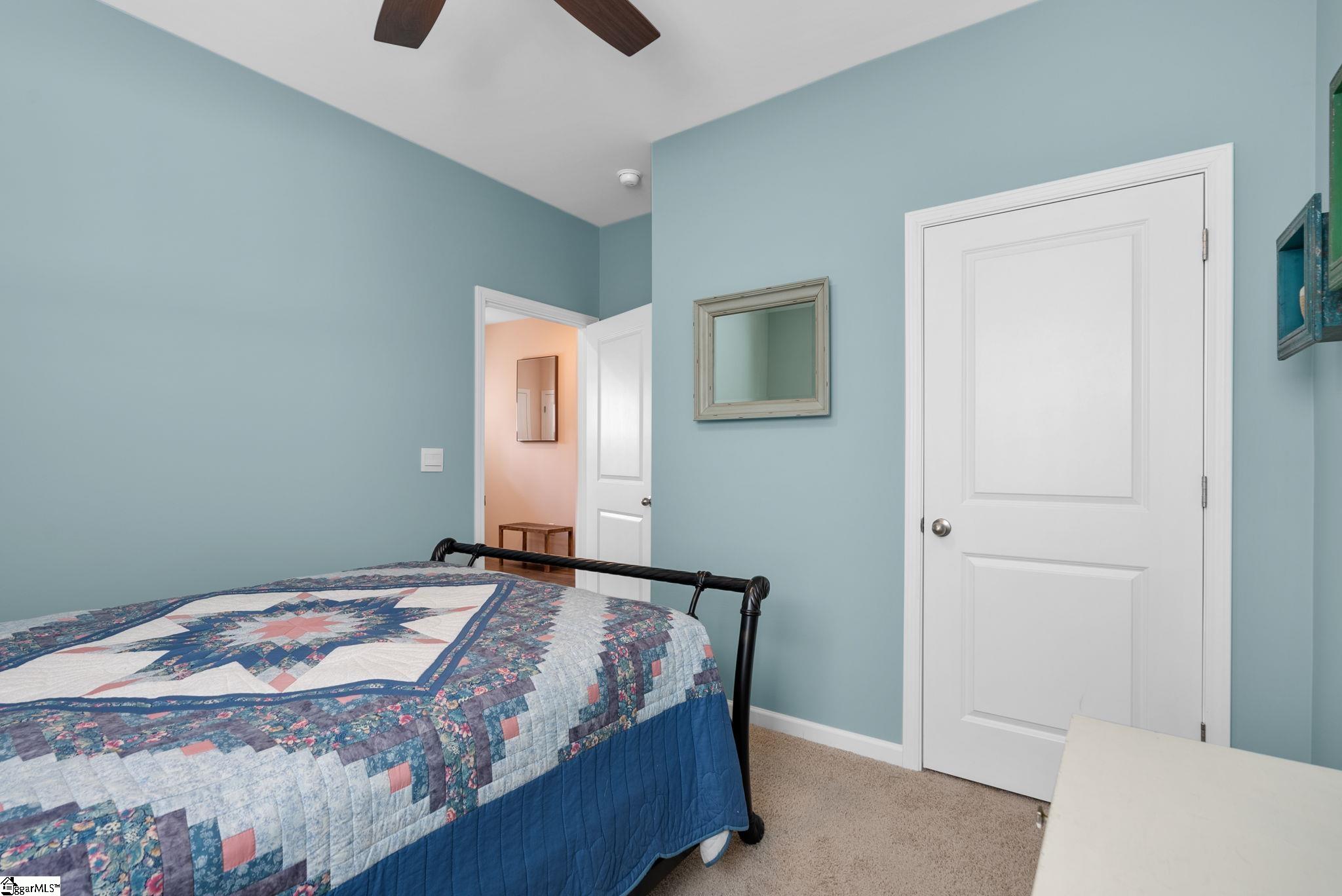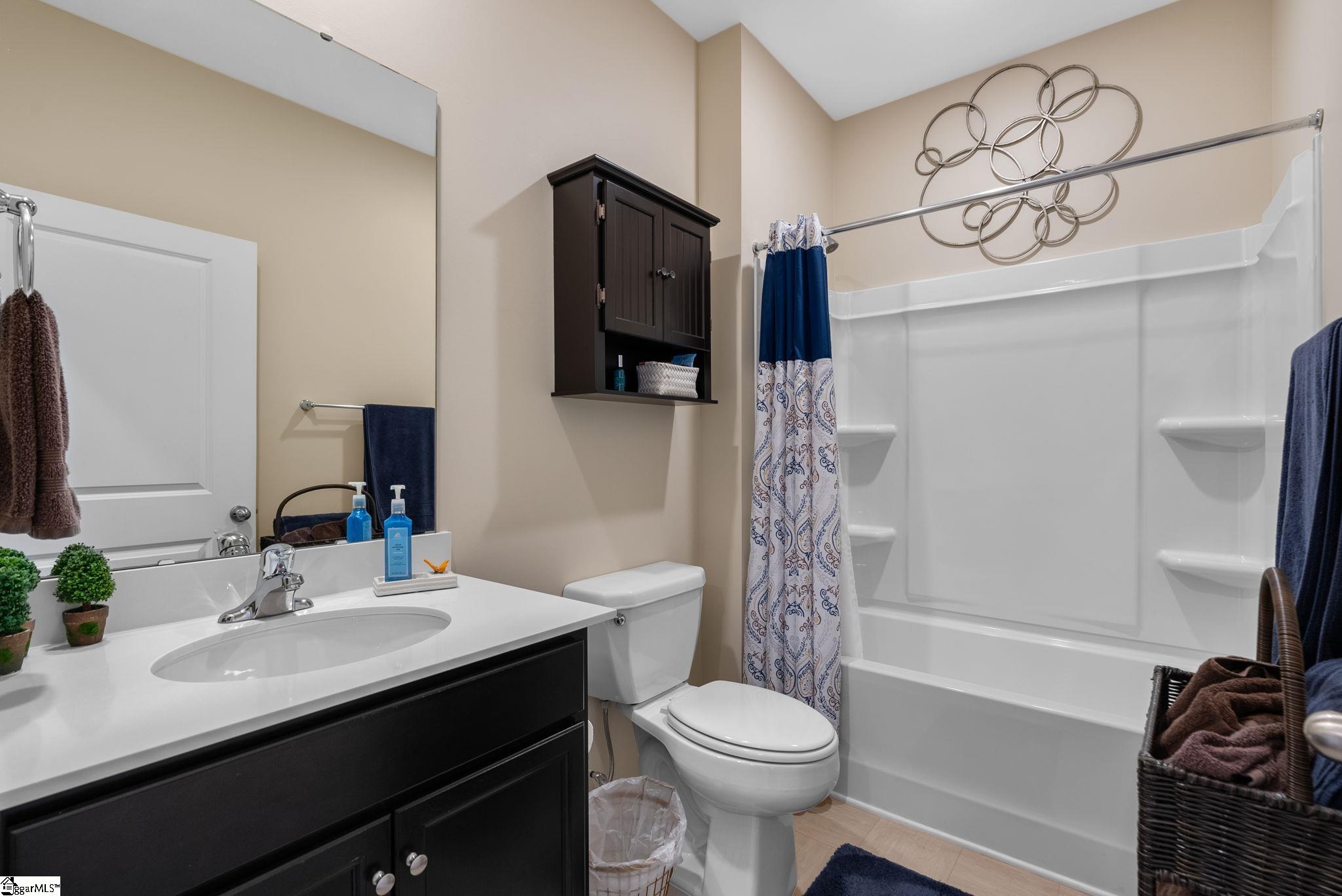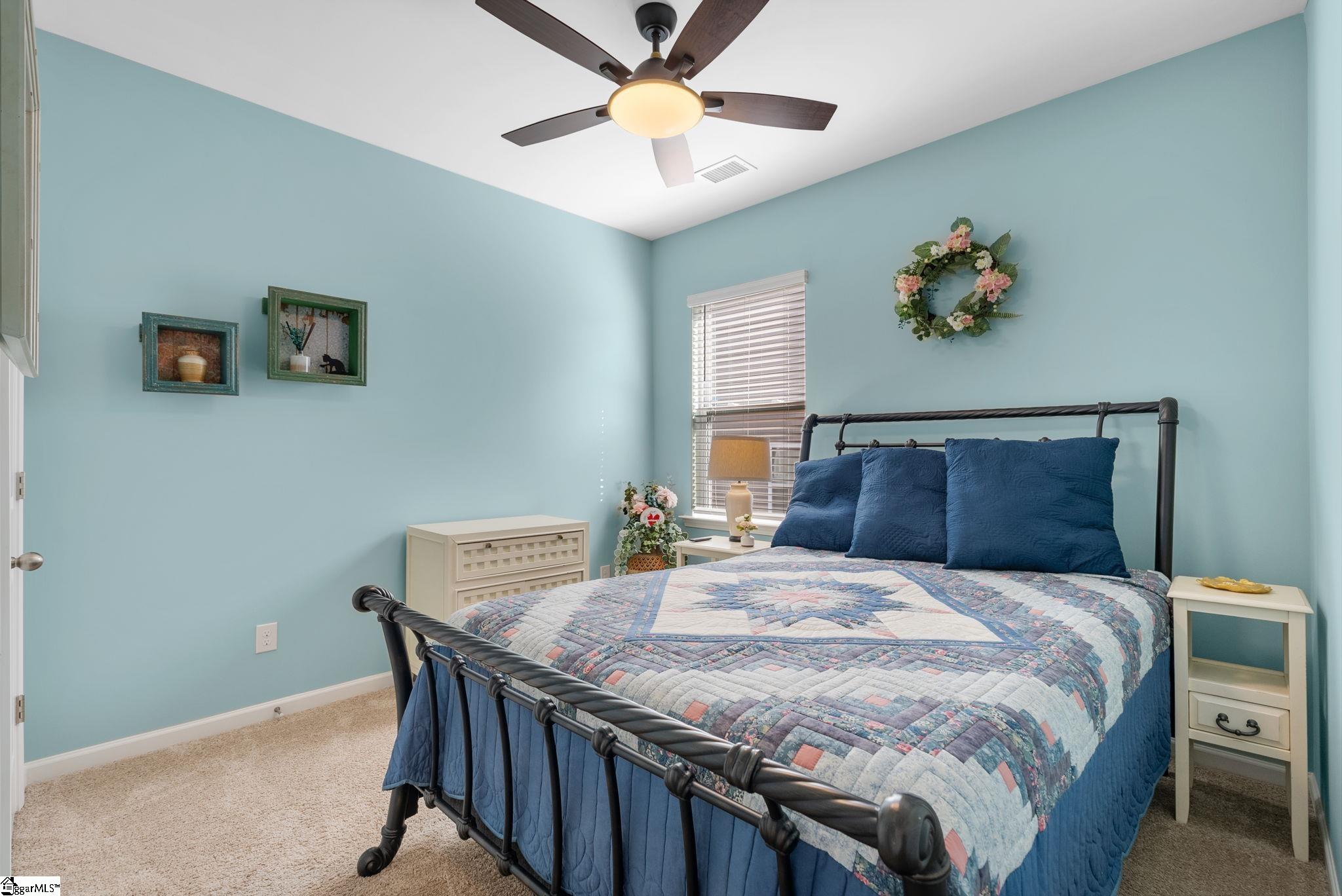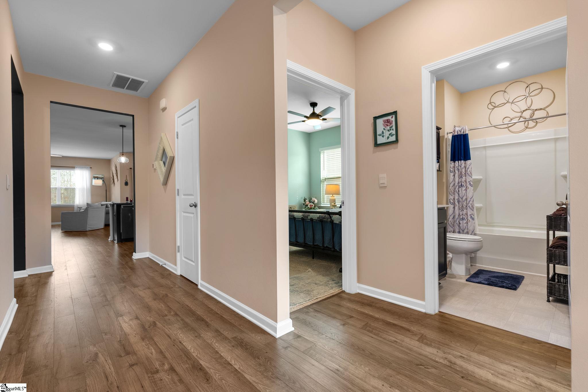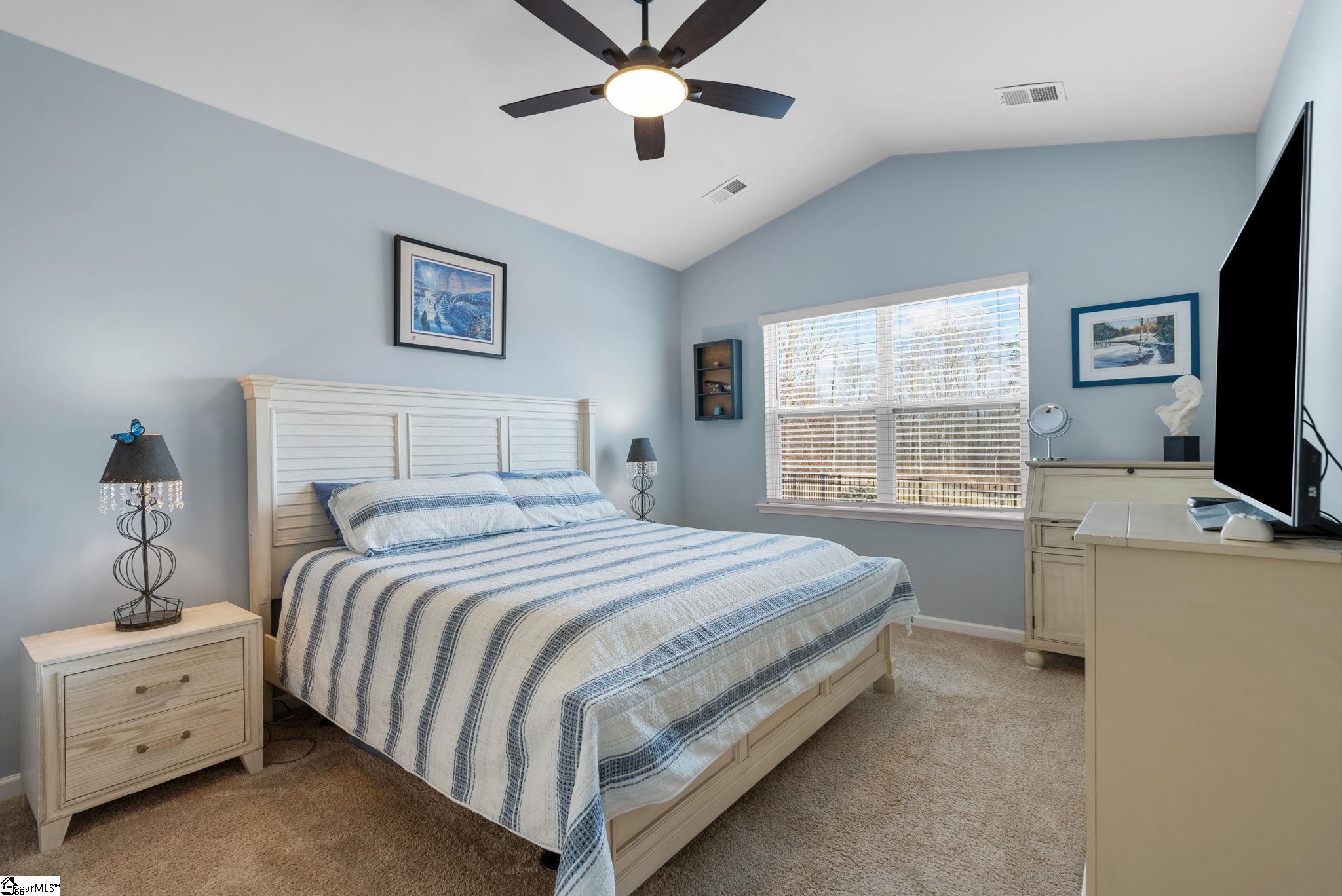 Welcome home to this beautifully maintained 4-bedroom, 2-bath single level home in the sought after Pearson Farms community, zoned for Forest Acres Elementary, Richard H. Gettys Middle, and Easley High School. Built in 2022, this home offers approximately 1, 774 sq ft with a bright, open concept layout perfect for everyday living and entertaining. The inviting living area centers around a cozy gas fireplace and flows effortlessly into the kitchen, complete with dark cabinetry, stainless steel appliances, a spacious walk-in pantry, and an upgraded backsplash. Laminate plank flooring anchors the main living spaces, while the bedrooms offer plush carpet for added comfort. The primary suite impresses with vaulted ceilings, a walk-in closet, and an en-suite bath with double sinks. Step into the enclosed sunroom, a perfect flex space, that leads to the extended back patio with a paved BBQ area and large fenced-in yard. Beyond the fence, a private wooded area offers lasting privacy and is planned to include hiking and walking trails, while still preserving your serene backyard retreat. The home also features a 2-car garage and is within walking distance to the community pool, making it a complete package for comfort, style, and lifestyle.