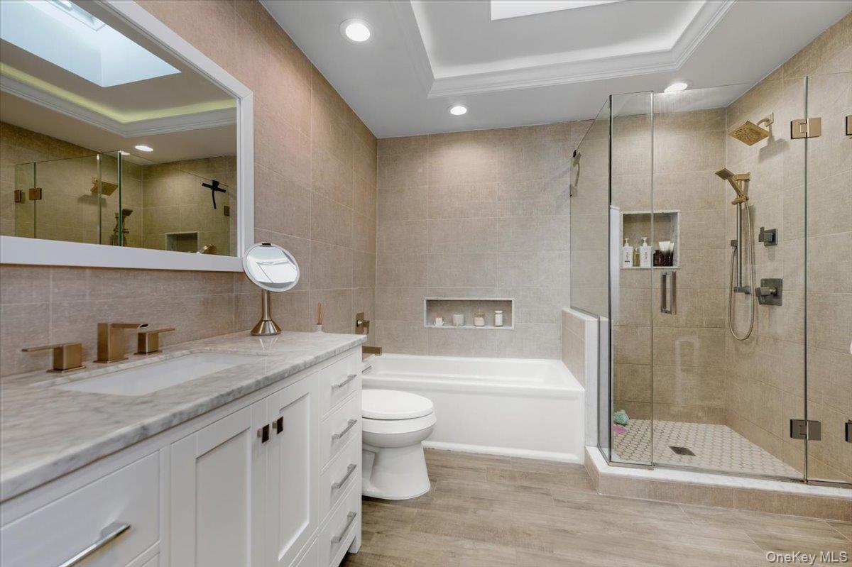 A lovely ranch style home with modern updates and character throughout the entire space. The main living areas have beautiful hardwood floors and molding details adding to the charm. The living room has an oversized bay window that lets in an abundance of natural light. The eat-in kitchen has tile flooring, updated wood cabinets, and granite countertops. A suite of stainless steel appliances complete the look with the stove powered by natural gas. An entry door leads directly to the private side yard, convenient for outdoor cooking. There are three bedrooms, with the primary bedroom featuring a beautiful and large ensuite bath with separate tub and glass enclosed shower. An additional full guest bath has a tile and glass tub / shower combination and wood vanity with a stone top. The lower level has additional living space that has been finished, and includes the laundry area. There is a large storage closet with plenty of space to also add an office. A recreation room has built in shelves and tons of storage. Outside you will find a private backyard that is flat and has plenty of space for dining and entertaining. An outdoor shed provides additional storage.