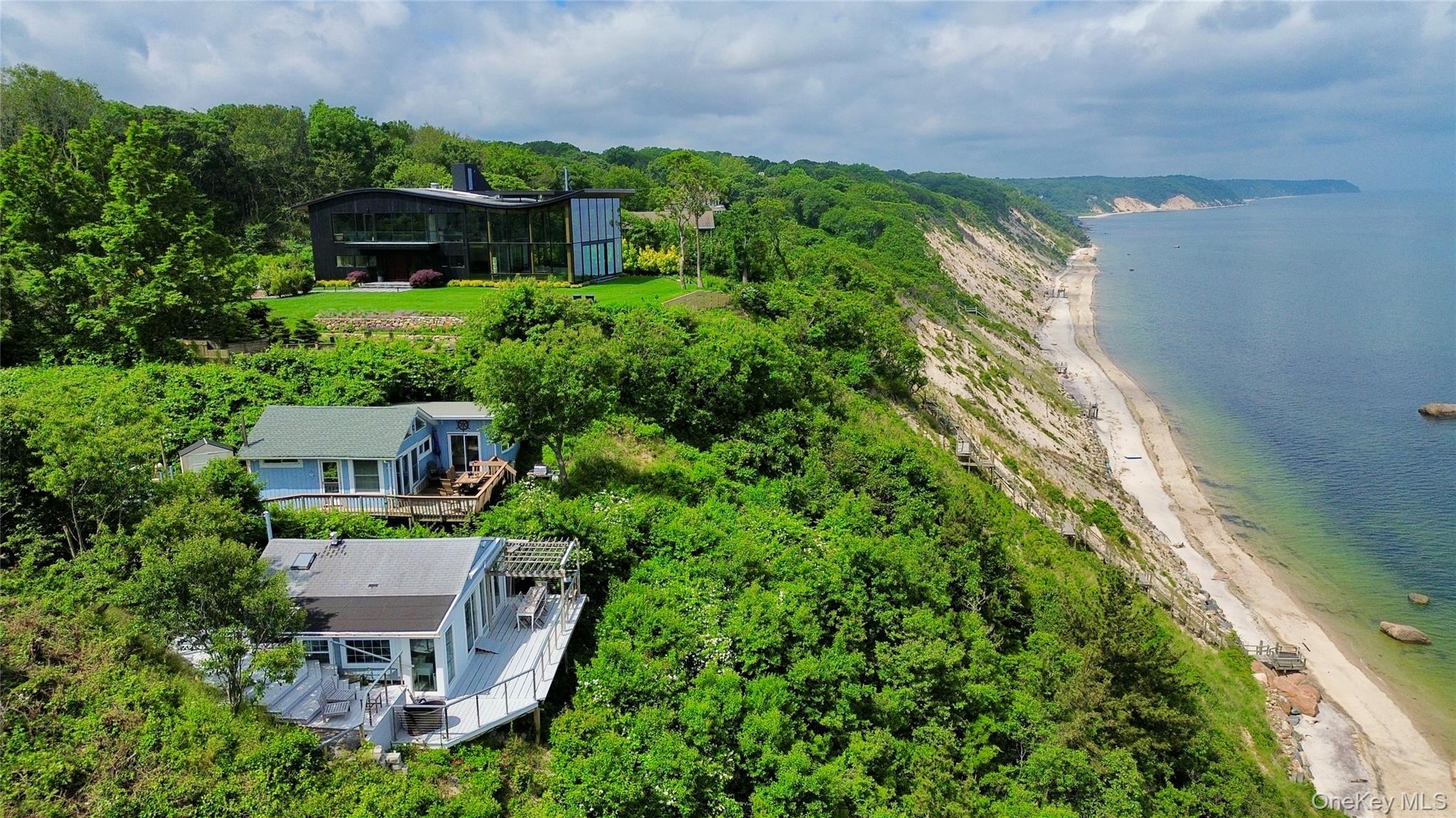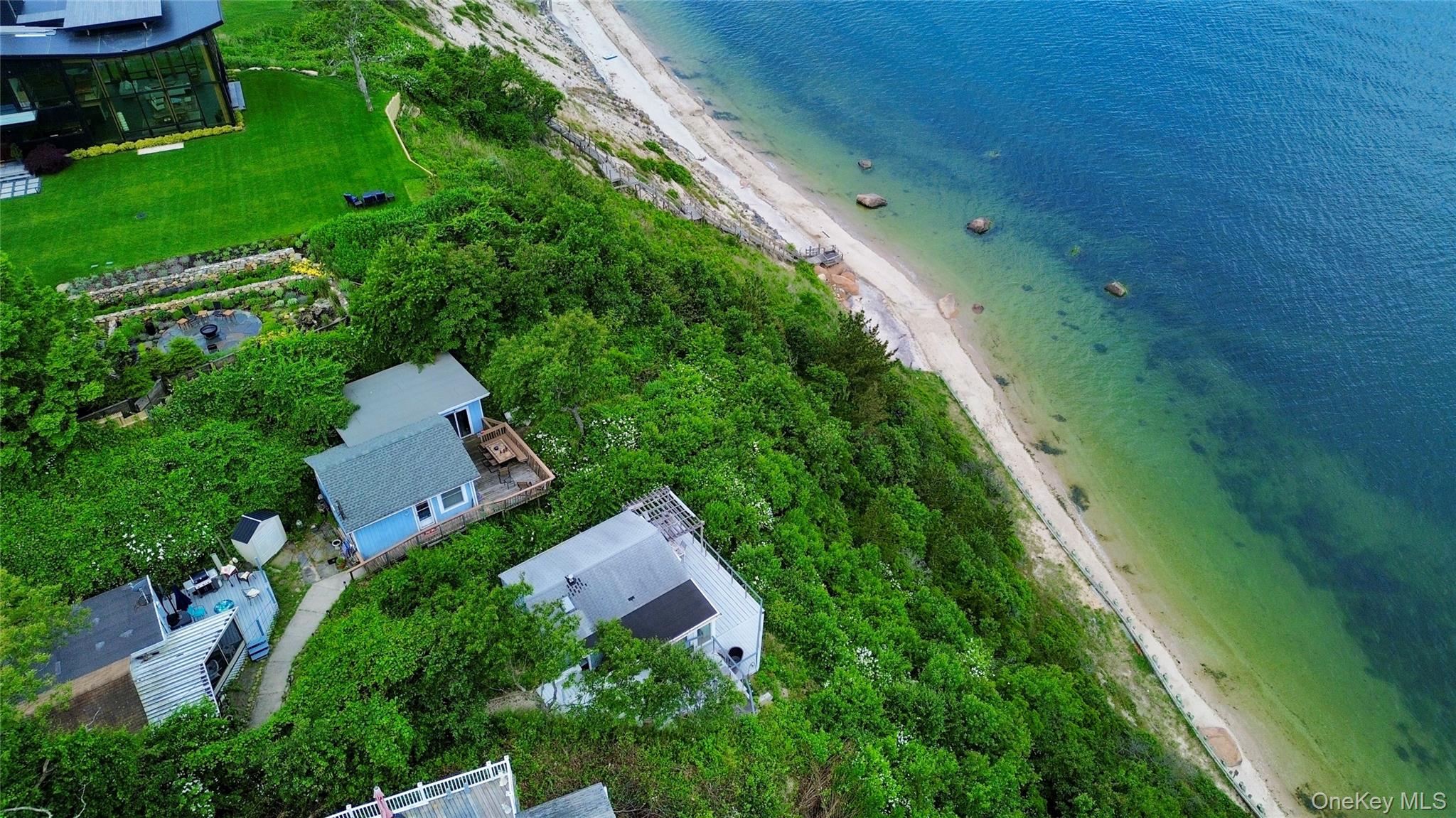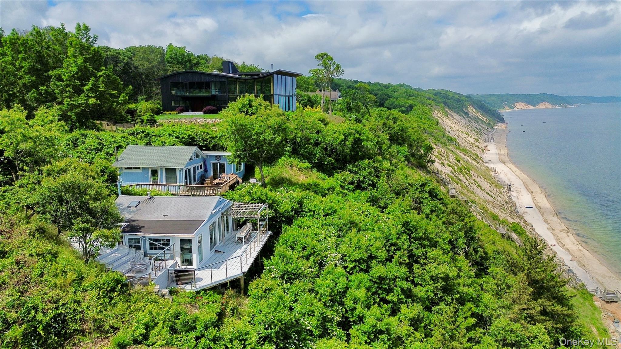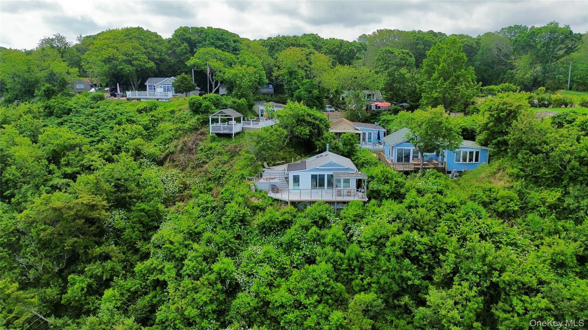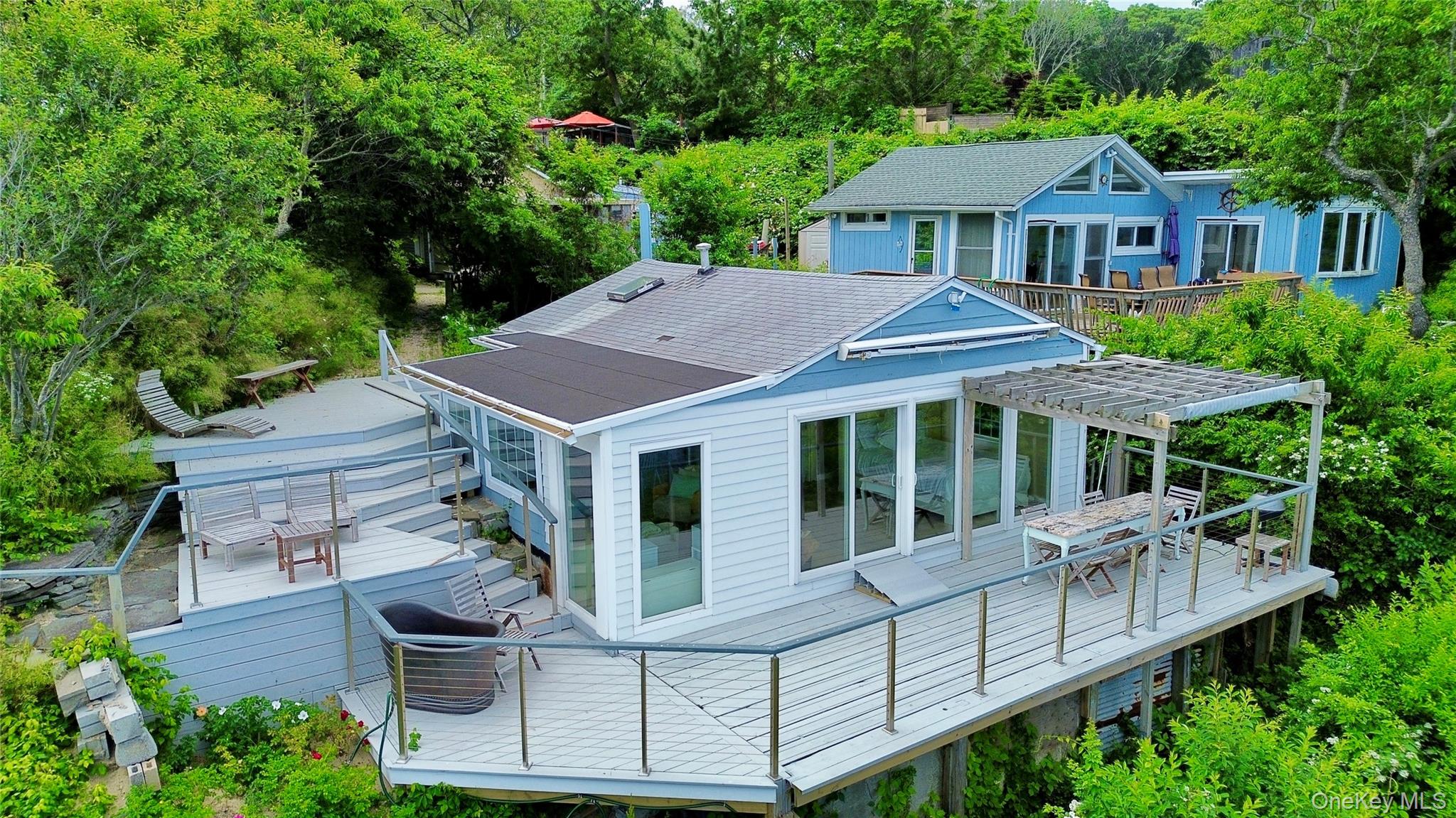 NESTLED ON LONG ISLANDS NORTH SHORE BLUFF~ THIS LITTLE SLICE OF HEAVEN OFFERS THE TRANQUIL SOUND OF THE WATER WASHING ASHORE, UNOBSTRUCTED BREATHTAKING WATER-VIEWS AND BEACH VIEWS, This home was renovated in 2014 and additional Renovations done including Windows, & Sliders Added in 2023 to Accentuate THE WATERVIEWS. Updated Eat In kitchen W/White Cabinetry, Granite Counters, Subway Tile Back Splash, Updated Bathroom accented with Shiplap, Engineered Wide plank White Oak Floors, Vaulted Rustic Beamed Ceilings for the authentic cottage feel, Mini Split for Heat & air, Double SLIDERS to entertainers Deck Also w/Wide Plank Boards, Stackable washer/Dryer, New Stove, New White Storage Cabinetry, 2 Sofas, & Captains Bed with Storage, Exterior Painted 2021 in a Soothing Blue Tone, Interior Freshly Painted 2024, Additional Tiered Deck Off Side for Sunbathing, Rose Bushes & Perennial Plantings offer charm & make it feel like home. Furnished & Ready to Use. Only 1 Hour & 15 Minutes to NYC. Jitney Bus is only 8 Minute Drive from Community. Community is Seasonal open April 15-October 15. Land is Leased at approximately $12, 400 annually. Short term rentals Prohibited. Was two separate bedrooms but currently walls down and set up as Open Concept. Could be put back up. , Additional information: Appearance: Mint