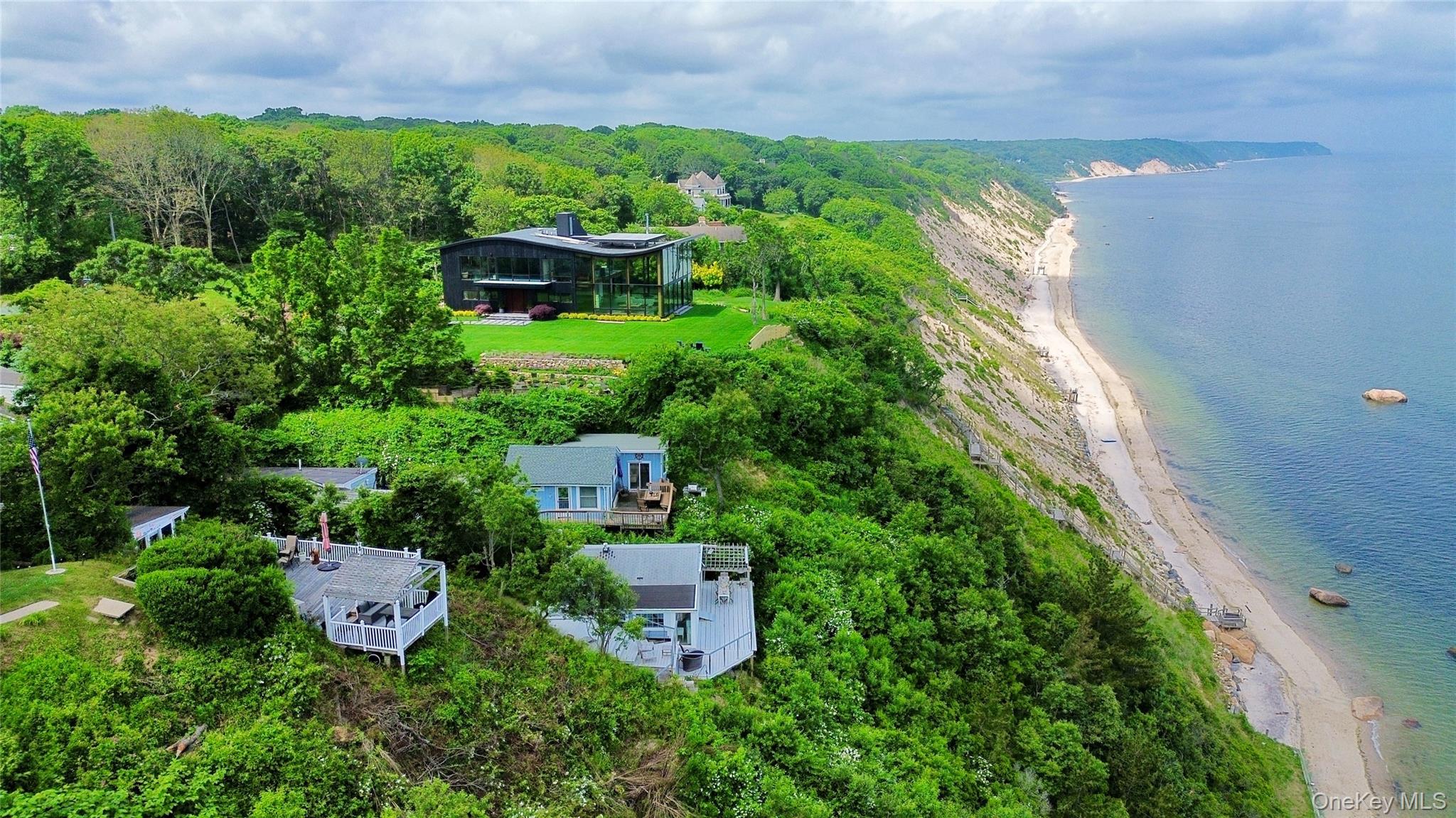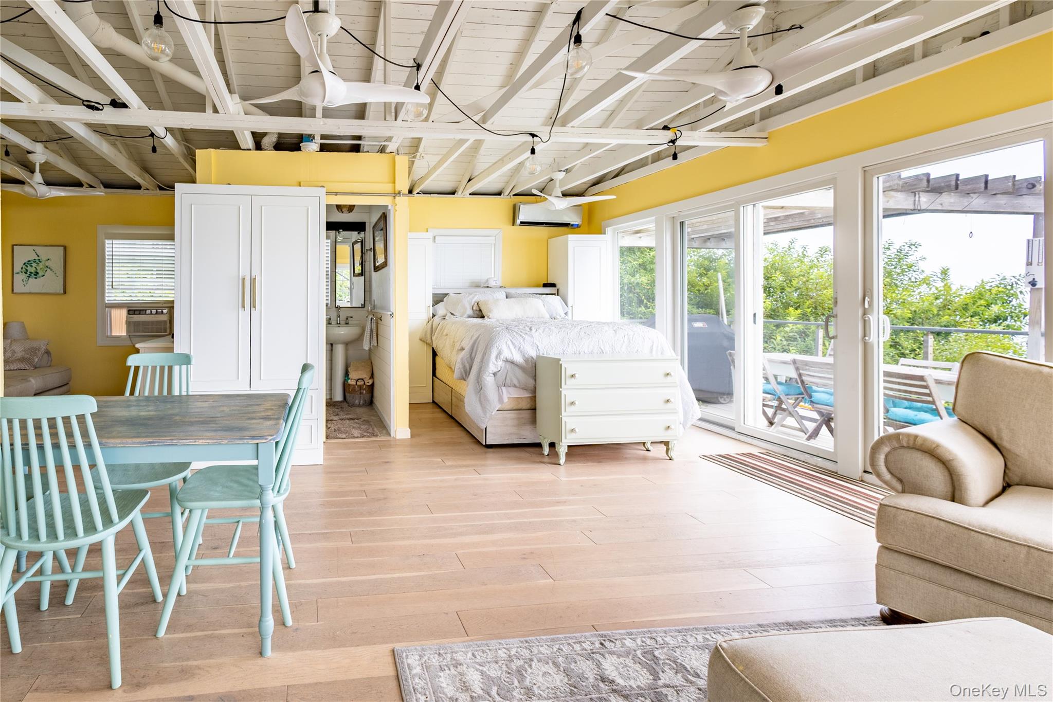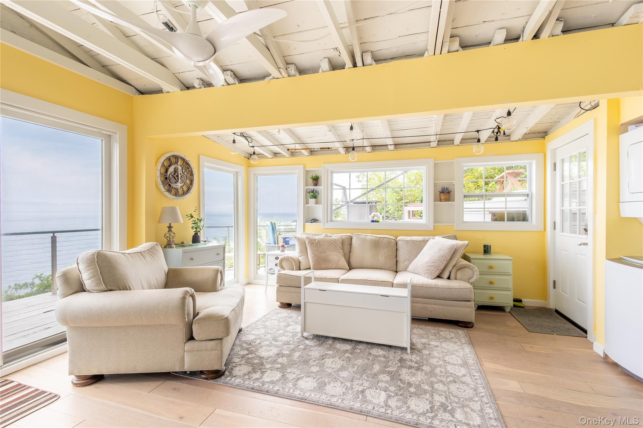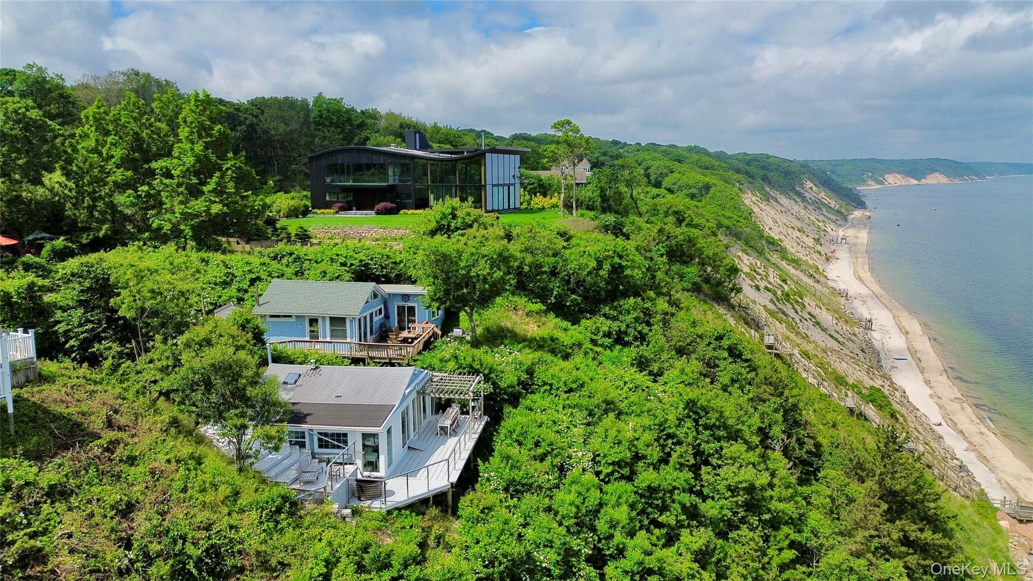 NESTLED ON LONG ISLANDS NORTH SHORE BLUFF~ THIS LITTLE SLICE OF HEAVEN OFFERS THE TRANQUIL SOUND OF THE WATER WASHING ASHORE, UNOBSTRUCTED BREATHTAKING WATER-VIEWS AND BEACH VIEWS, This home was renovated in 2014 and additional Renovations done including Windows, & Sliders Added in 2023 to Accentuate THE WATERVIEWS. Updated Eat In kitchen W/White Cabinetry, Granite Counters, Subway Tile Back Splash, Updated Bathroom accented with Shiplap, Engineered Wide plank White Oak Floors, Vaulted Rustic Beamed Ceilings for the authentic cottage feel, Mini Split for Heat & air, Double SLIDERS to entertainers Deck Also w/Wide Plank Boards, Stackable washer/Dryer, New Stove, New White Storage Cabinetry, 2 Sofas, & Captains Bed with Storage, Exterior Painted 2021 in a Soothing Blue Tone, Interior Freshly Painted 2024, Additional Tiered Deck Off Side for Sunbathing, Rose Bushes & Perennial Plantings offer charm & make it feel like home. Furnished & Ready to Use. Only 1 Hour & 15 Minutes to NYC. Jitney Bus is only 8 Minute Drive from Community. Community is Seasonal open April 15-October 15. Land is Leased at approximately $12, 400 annually. Short term rentals Prohibited. Was two separate bedrooms but currently walls down and set up as Open Concept. Could be put back up. , Additional information: Appearance: Mint