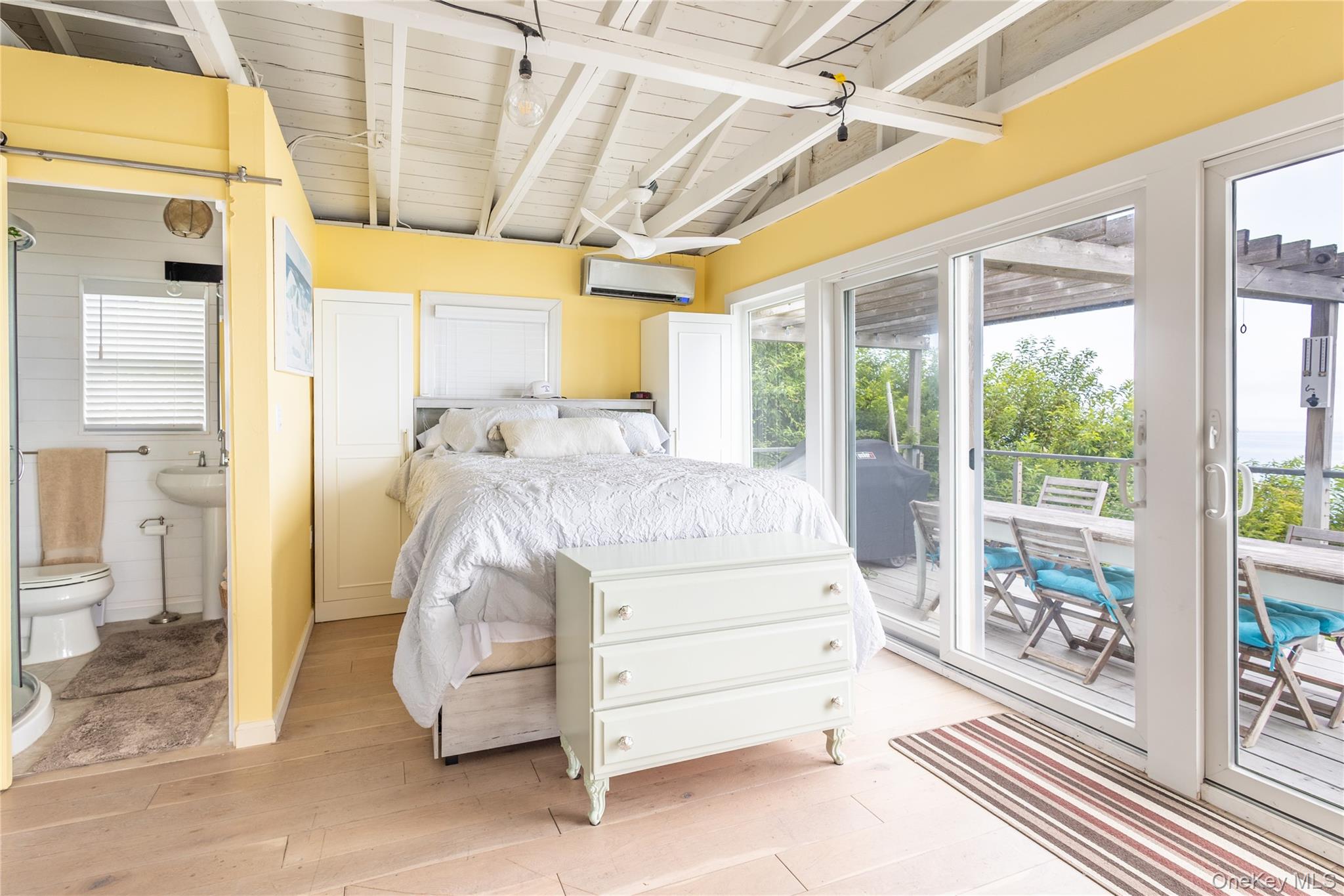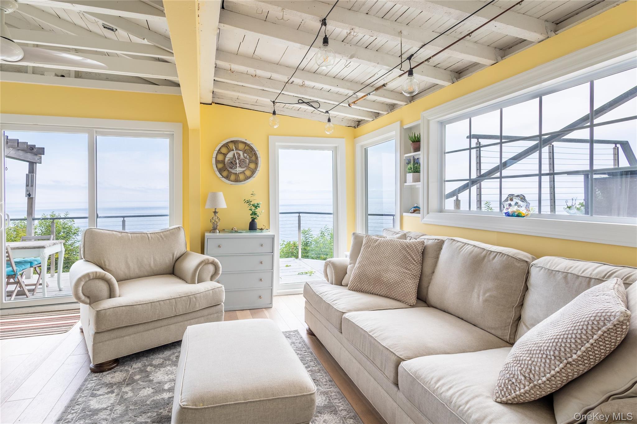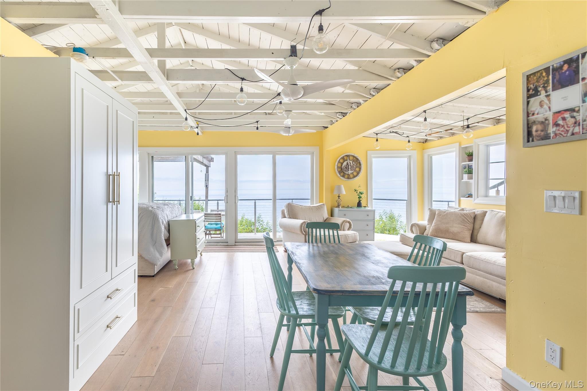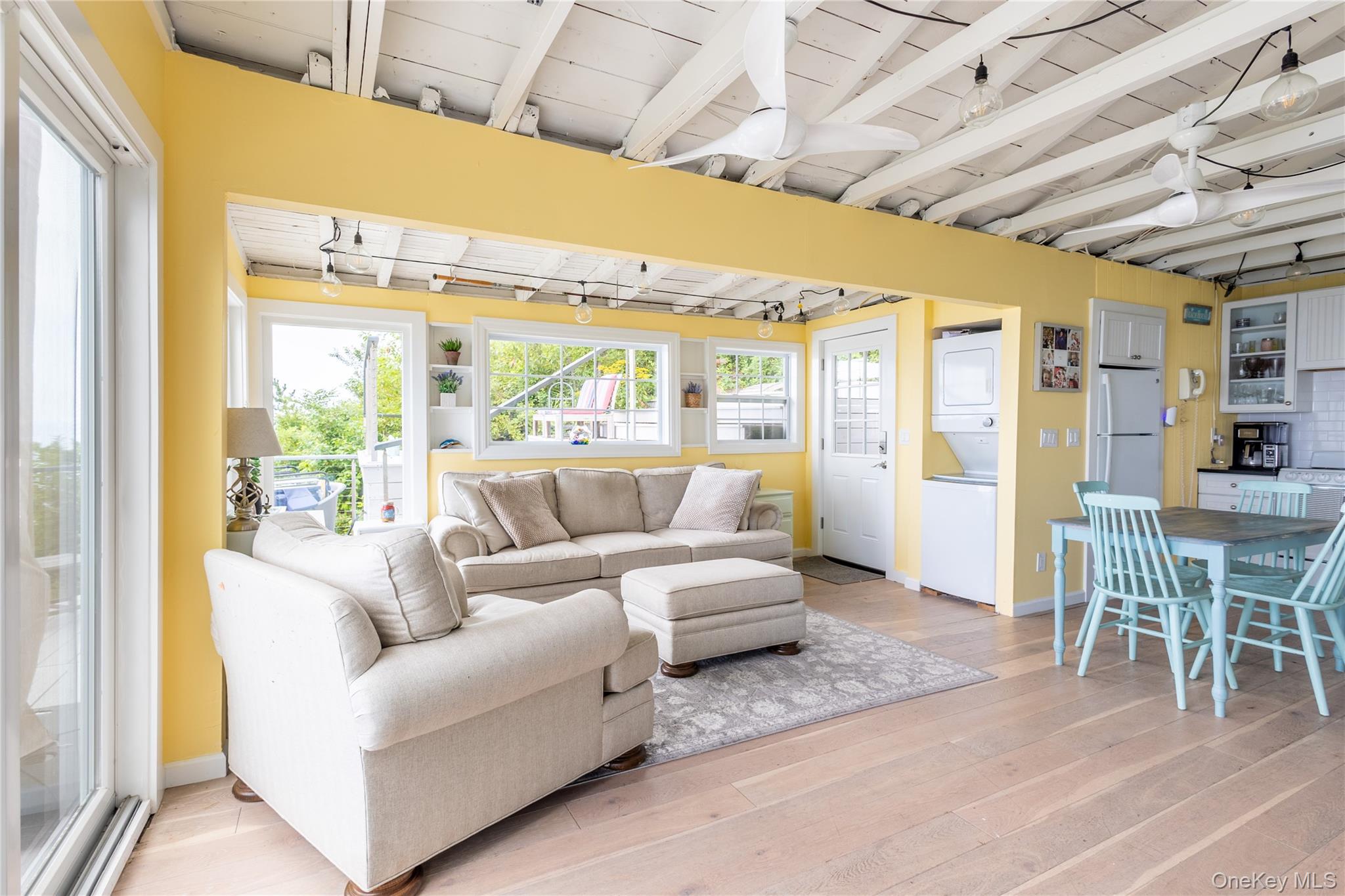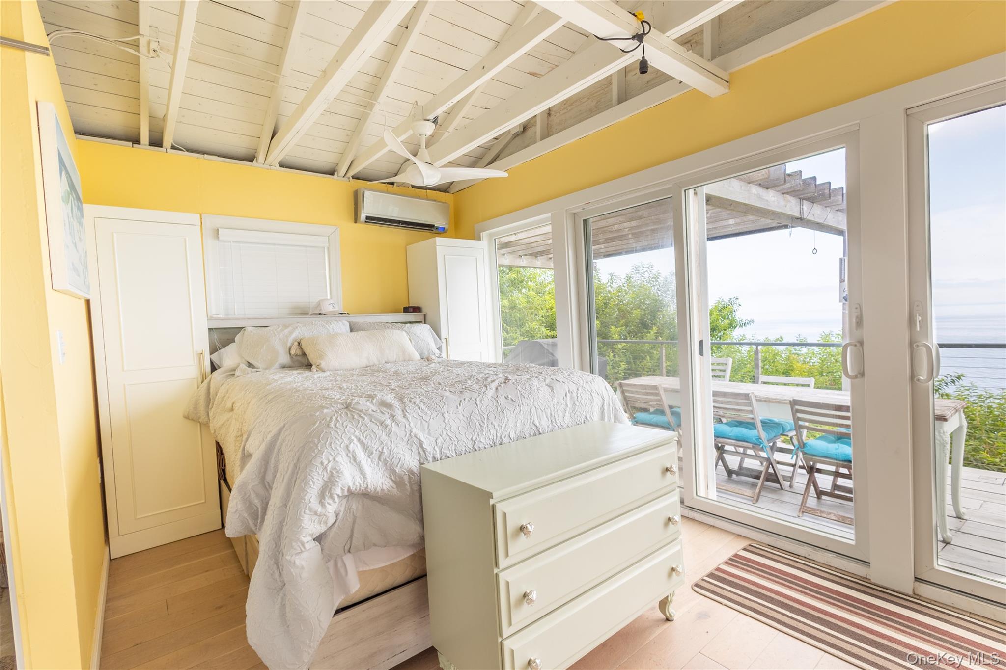 NESTLED ON LONG ISLANDS NORTH SHORE BLUFF~ THIS LITTLE SLICE OF HEAVEN OFFERS THE TRANQUIL SOUND OF THE WATER WASHING ASHORE, UNOBSTRUCTED BREATHTAKING WATER-VIEWS AND BEACH VIEWS, This home was renovated in 2014 and additional Renovations done including Windows, & Sliders Added in 2023 to Accentuate THE WATERVIEWS. Updated Eat In kitchen W/White Cabinetry, Granite Counters, Subway Tile Back Splash, Updated Bathroom accented with Shiplap, Engineered Wide plank White Oak Floors, Vaulted Rustic Beamed Ceilings for the authentic cottage feel, Mini Split for Heat & air, Double SLIDERS to entertainers Deck Also w/Wide Plank Boards, Stackable washer/Dryer, New Stove, New White Storage Cabinetry, 2 Sofas, & Captains Bed with Storage, Exterior Painted 2021 in a Soothing Blue Tone, Interior Freshly Painted 2024, Additional Tiered Deck Off Side for Sunbathing, Rose Bushes & Perennial Plantings offer charm & make it feel like home. Furnished & Ready to Use. Only 1 Hour & 15 Minutes to NYC. Jitney Bus is only 8 Minute Drive from Community. Community is Seasonal open April 15-October 15. Land is Leased at approximately $12, 400 annually. Short term rentals Prohibited. Was two separate bedrooms but currently walls down and set up as Open Concept. Could be put back up. , Additional information: Appearance: Mint