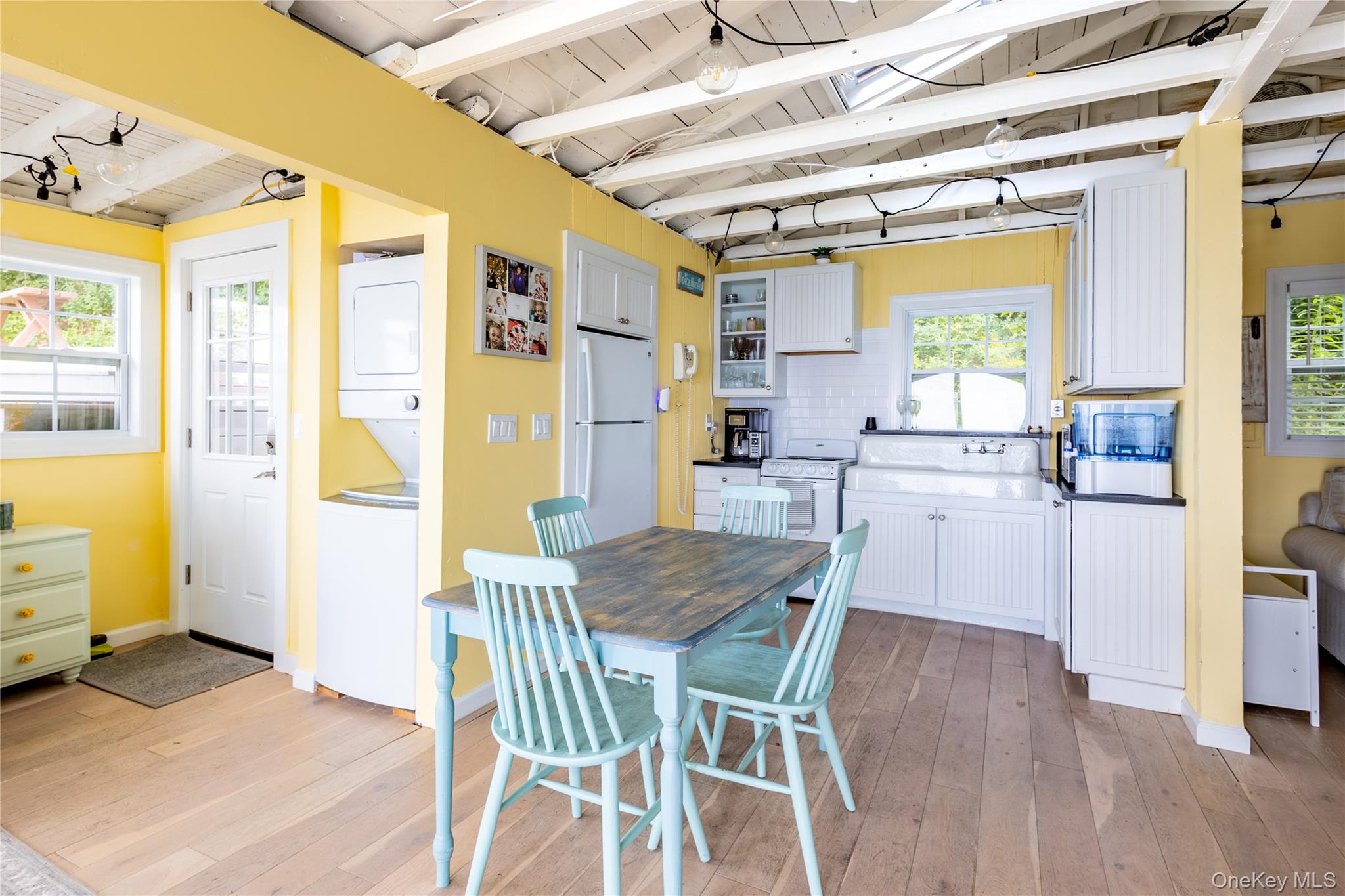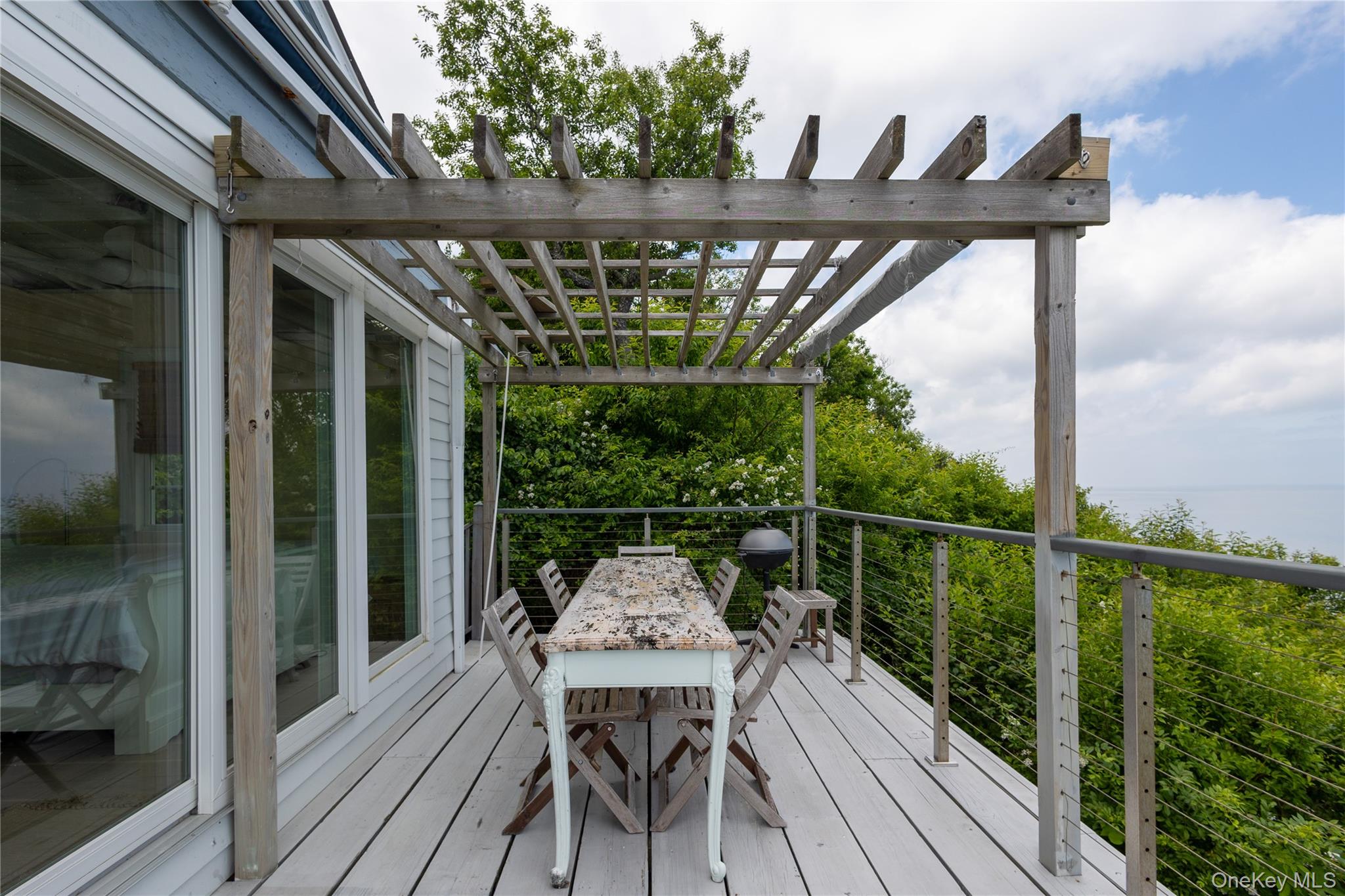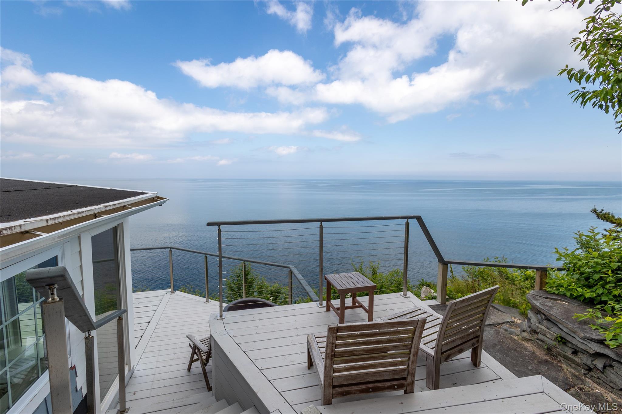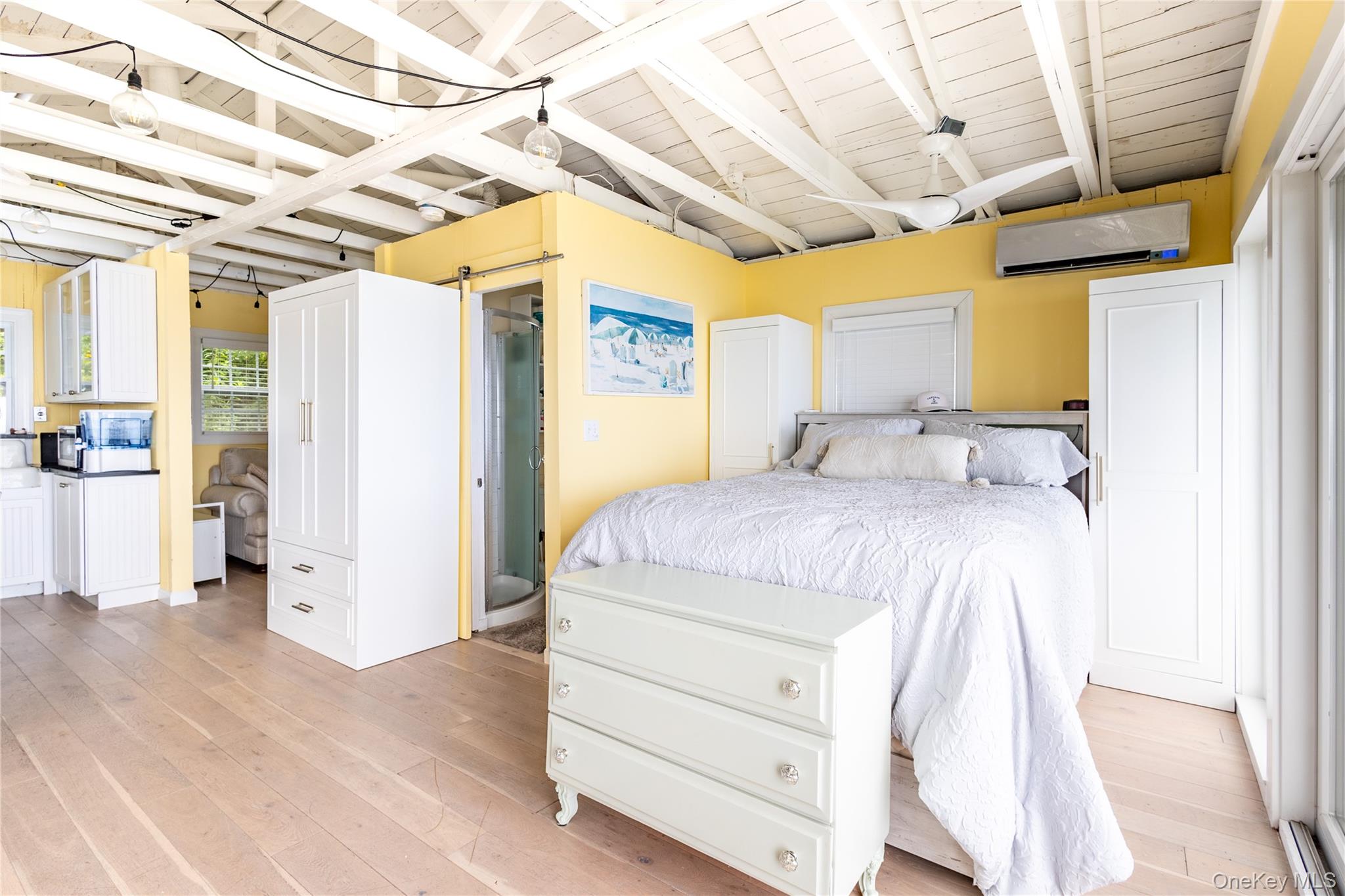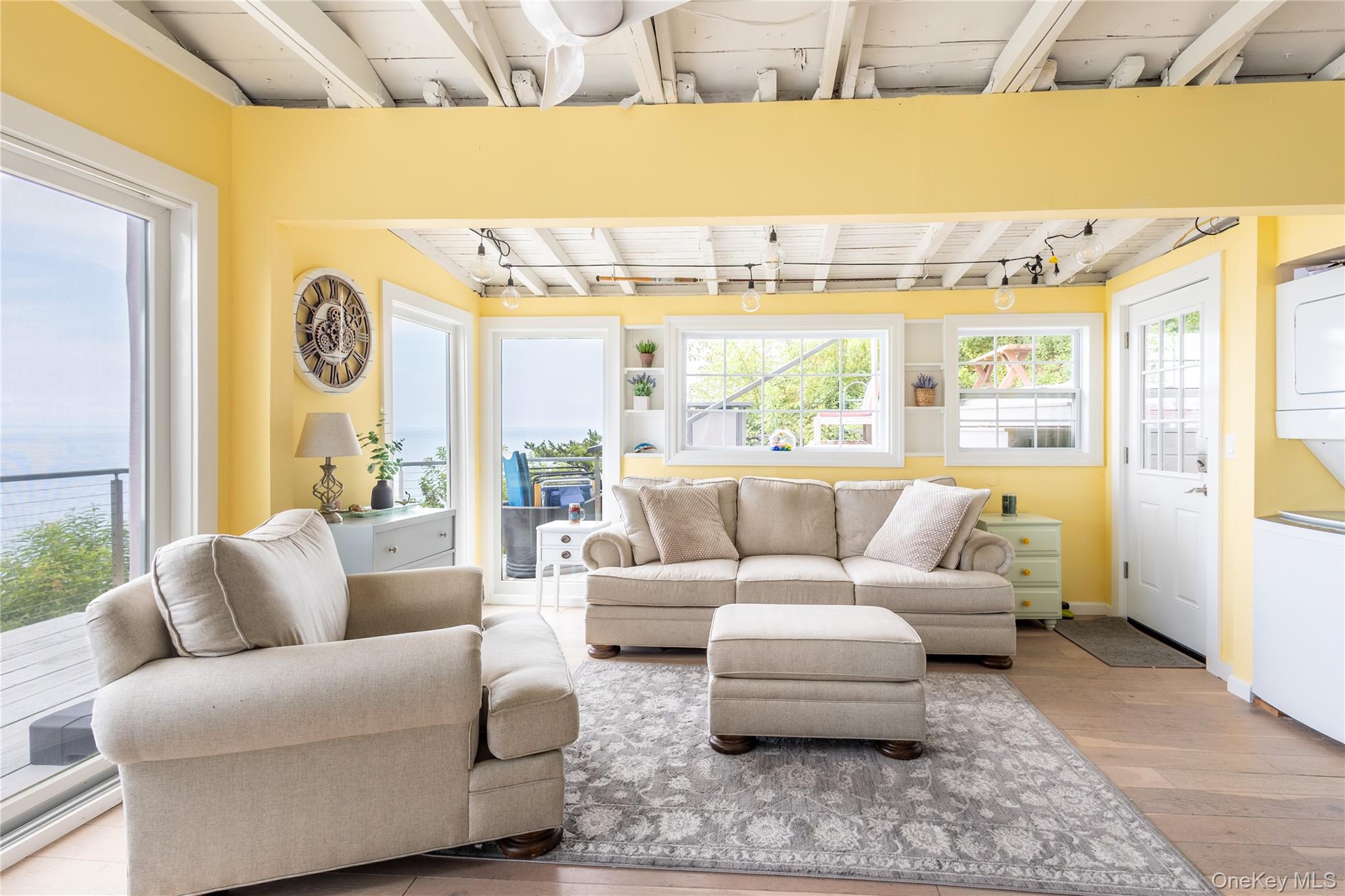 NESTLED ON LONG ISLANDS NORTH SHORE BLUFF~ THIS LITTLE SLICE OF HEAVEN OFFERS THE TRANQUIL SOUND OF THE WATER WASHING ASHORE, UNOBSTRUCTED BREATHTAKING WATER-VIEWS AND BEACH VIEWS, This home was renovated in 2014 and additional Renovations done including Windows, & Sliders Added in 2023 to Accentuate THE WATERVIEWS. Updated Eat In kitchen W/White Cabinetry, Granite Counters, Subway Tile Back Splash, Updated Bathroom accented with Shiplap, Engineered Wide plank White Oak Floors, Vaulted Rustic Beamed Ceilings for the authentic cottage feel, Mini Split for Heat & air, Double SLIDERS to entertainers Deck Also w/Wide Plank Boards, Stackable washer/Dryer, New Stove, New White Storage Cabinetry, 2 Sofas, & Captains Bed with Storage, Exterior Painted 2021 in a Soothing Blue Tone, Interior Freshly Painted 2024, Additional Tiered Deck Off Side for Sunbathing, Rose Bushes & Perennial Plantings offer charm & make it feel like home. Furnished & Ready to Use. Only 1 Hour & 15 Minutes to NYC. Jitney Bus is only 8 Minute Drive from Community. Community is Seasonal open April 15-October 15. Land is Leased at approximately $12, 400 annually. Short term rentals Prohibited. Was two separate bedrooms but currently walls down and set up as Open Concept. Could be put back up. , Additional information: Appearance: Mint