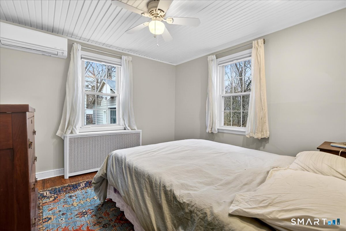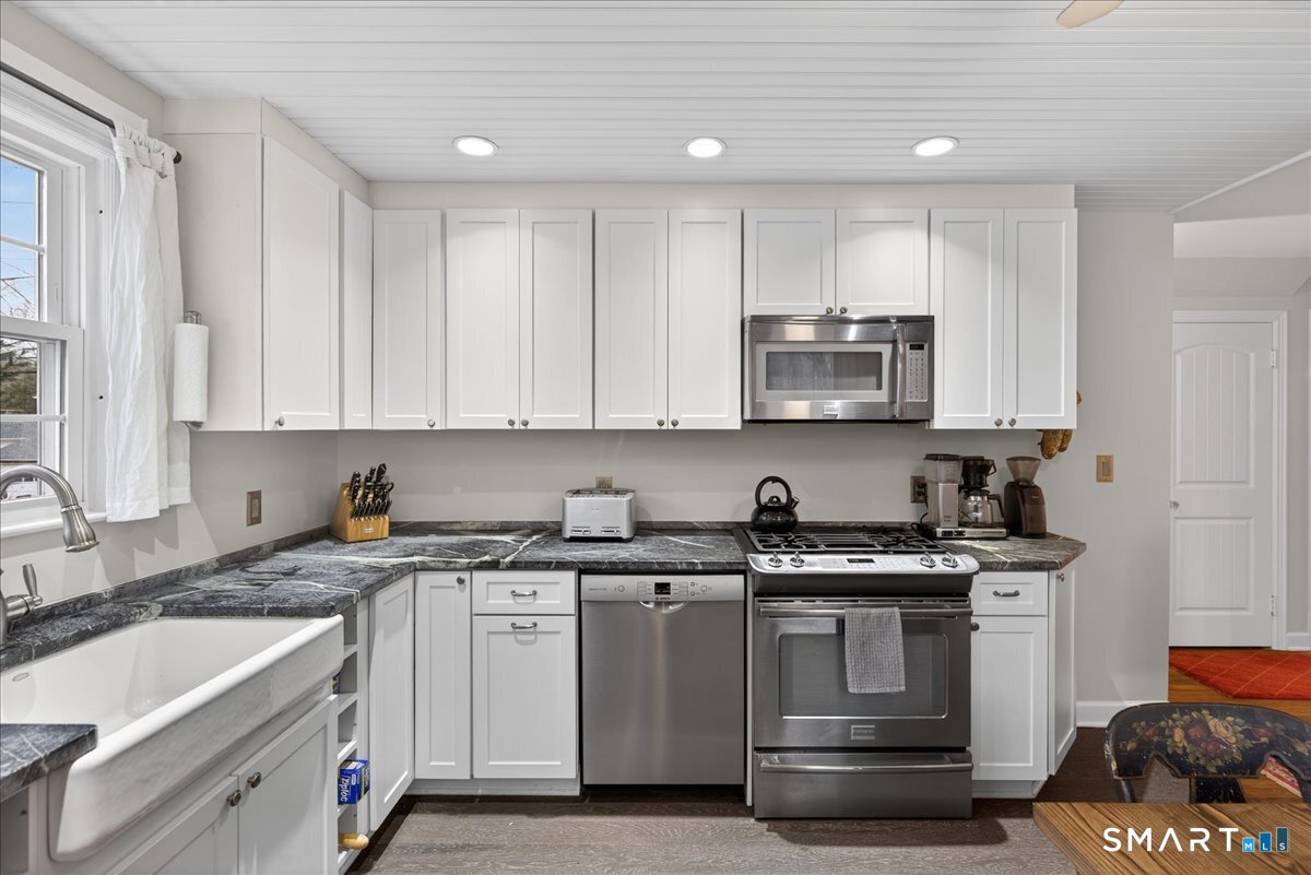 Spring Glen. Located on a charming quiet street sits this updated versatile floor plan, maintenance free, vinyl sided 4-bedroom, 1. 5 bath cape. Bluestone front steps lead into the vestibule with tile floor. Living Room features a gas fireplace and one of the three mini-split units. Updated white kitchen with farm sink, soapstone counters and stainless-steel appliances overlooks the park like yard. 1. 5 updated baths include heated floor first floor bath. There are two-1st floor and 2-2nd floor bedrooms. All Thermopane replacement windows and interior doors. The 60' deep lot has a patio and is bordered (as is the neighbors) to wooded Town of Hamden property that makes the yard feel like your own private park. (Note: Back property line appears to be very close to the back of the garage). Minutes to highways and New Haven